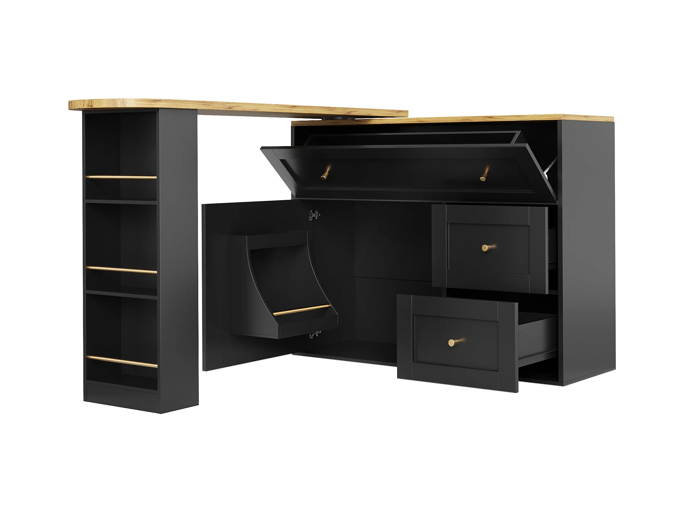 Meuble de bar pivotant - 4 tiroirs, 3 étagères de rangement & niche - MDF plateau effet bois - 138 cm/105x39x102 cm - Noir