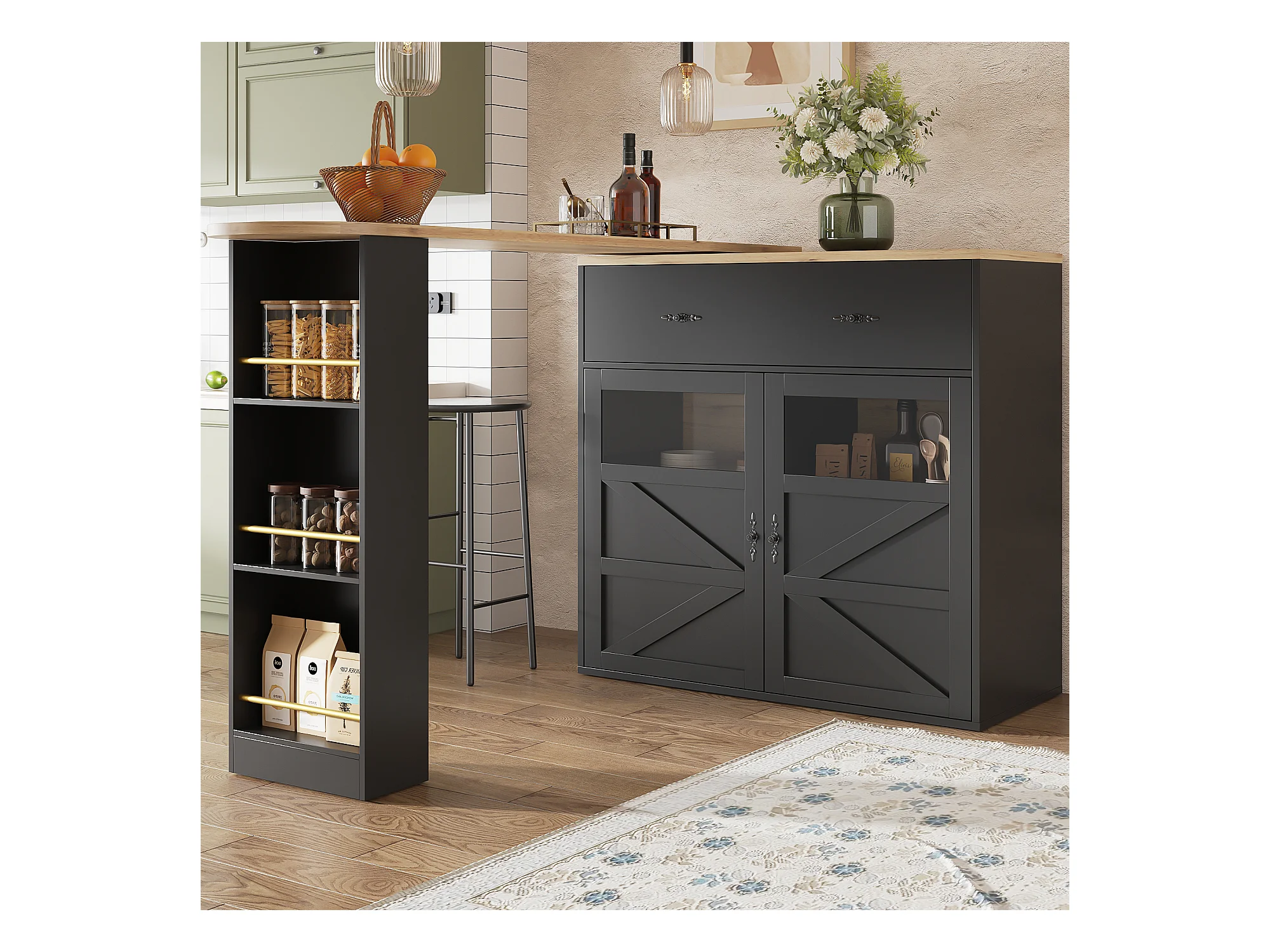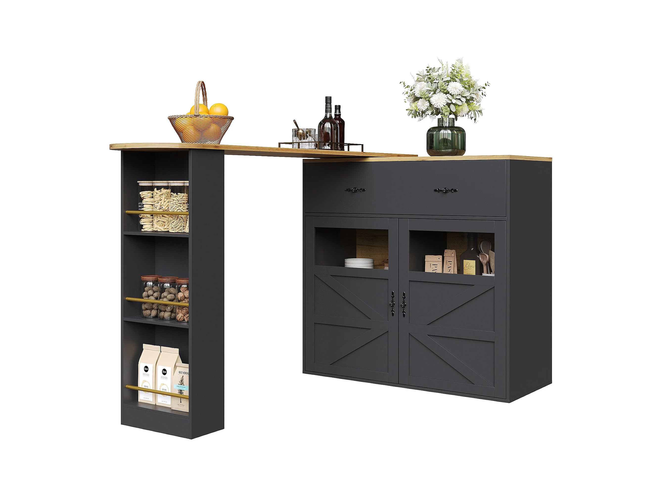 Meuble de bar pivotant 360° et escamotable - avec 2 portes et étagères ouvertes - noir + naturel