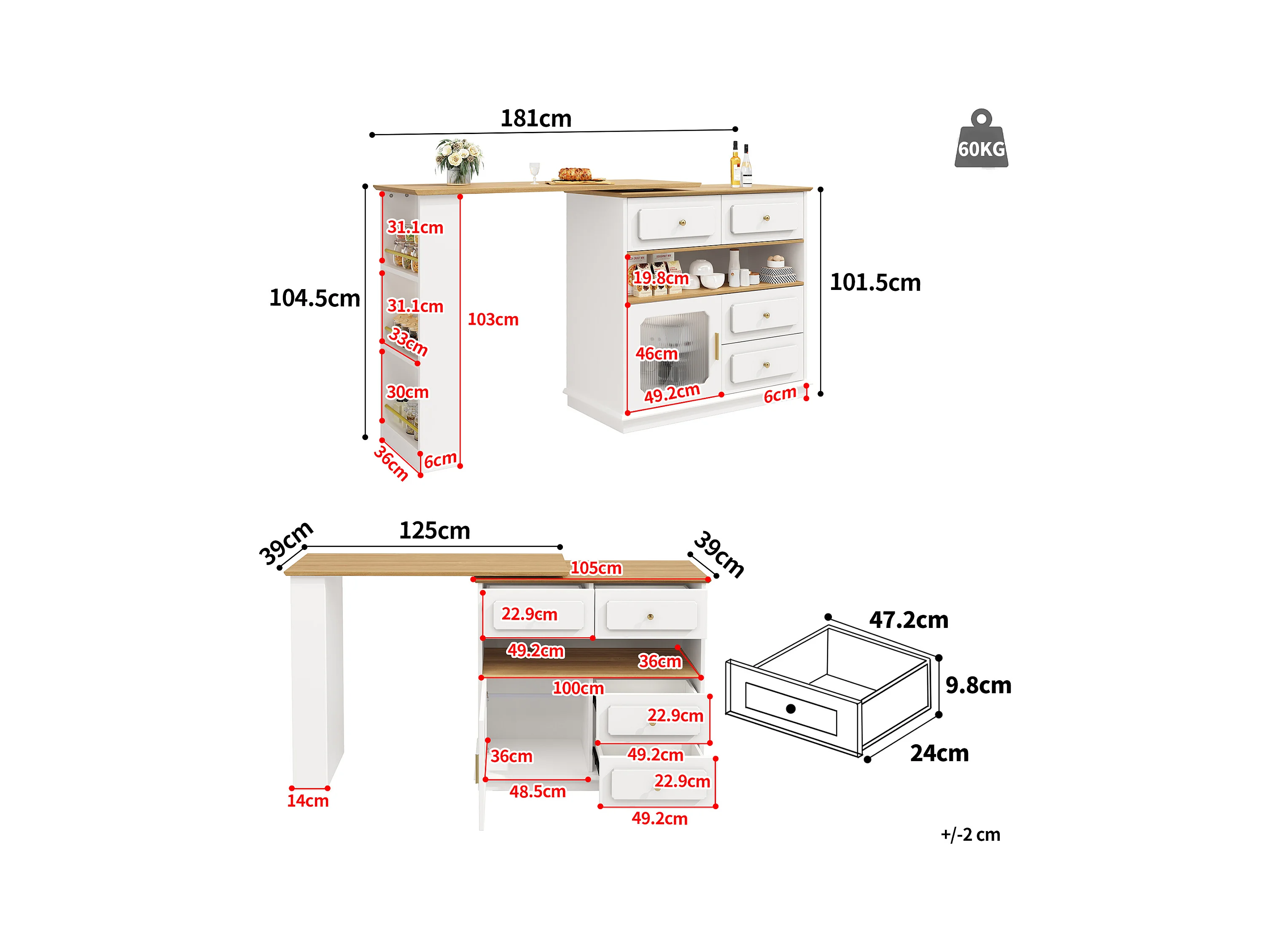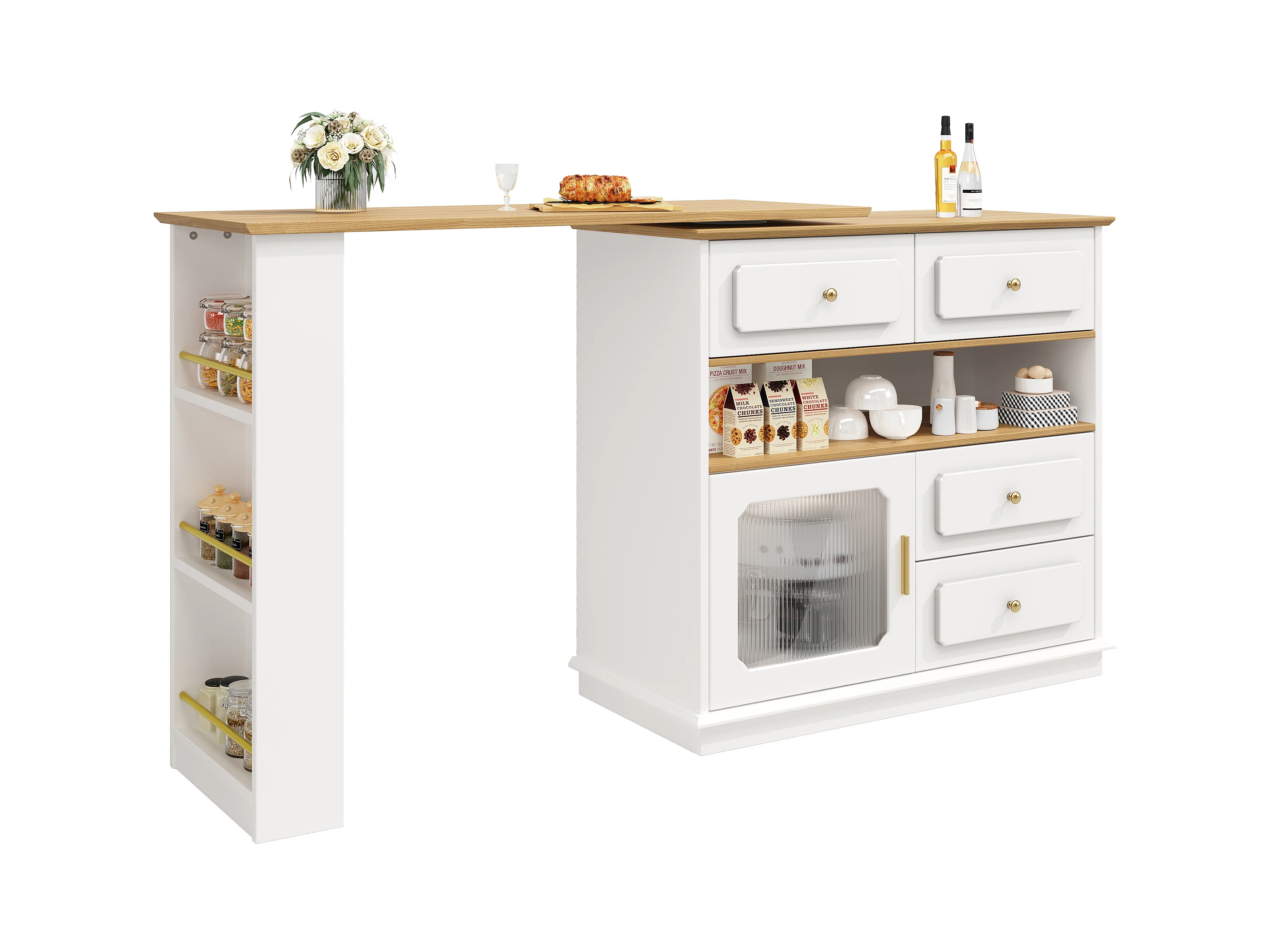 Meuble de bar de cuisine extensible - et rotation à 360° - 203x39x90cm - 6 tiroirs - avec étagères latérales - Blanc