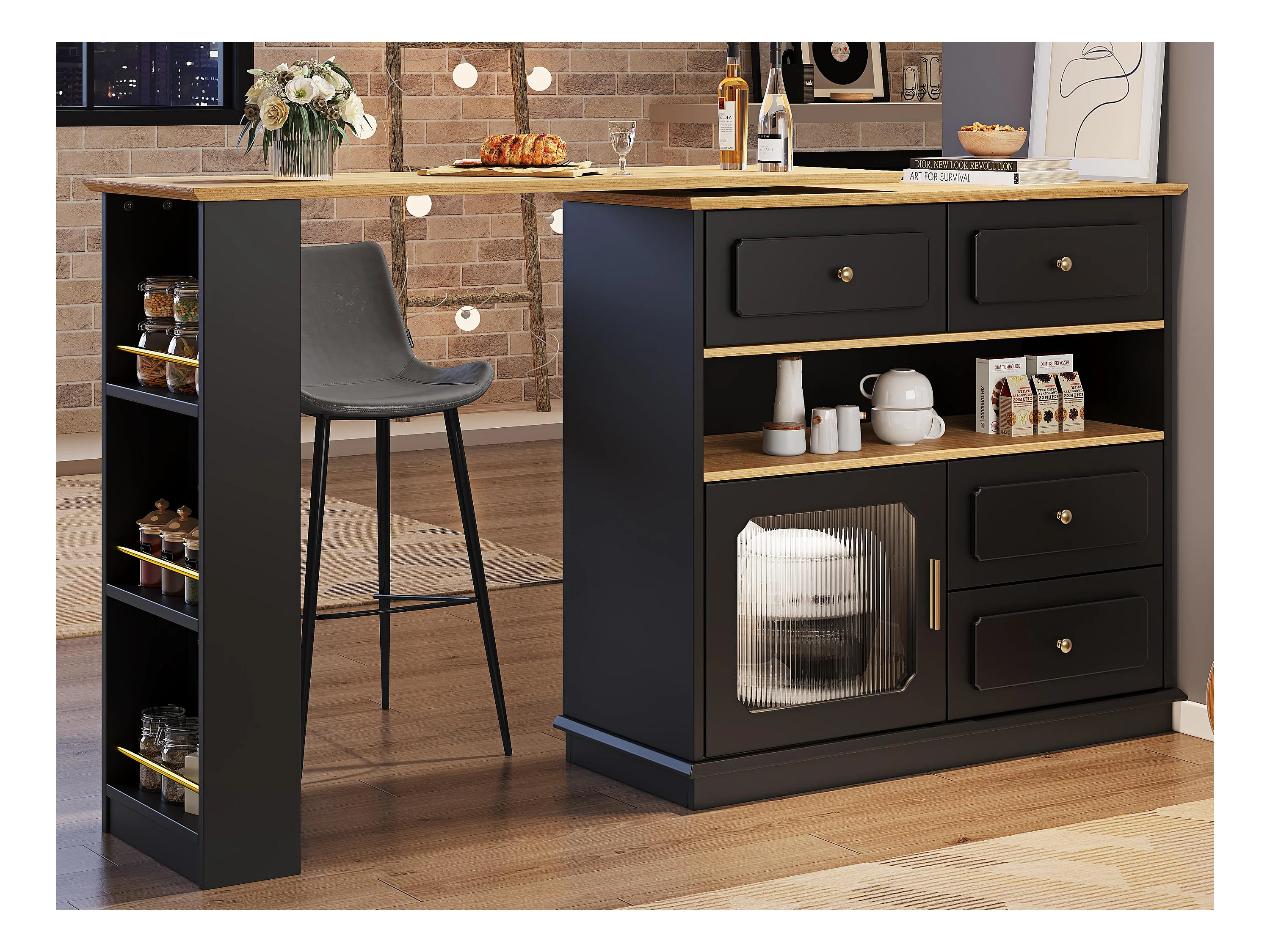 Meuble de bar pivotant - 4 tiroirs, 3 étagères de rangement & niche - MDF plateau effet bois - 138 cm/105x39x102 cm - Noir