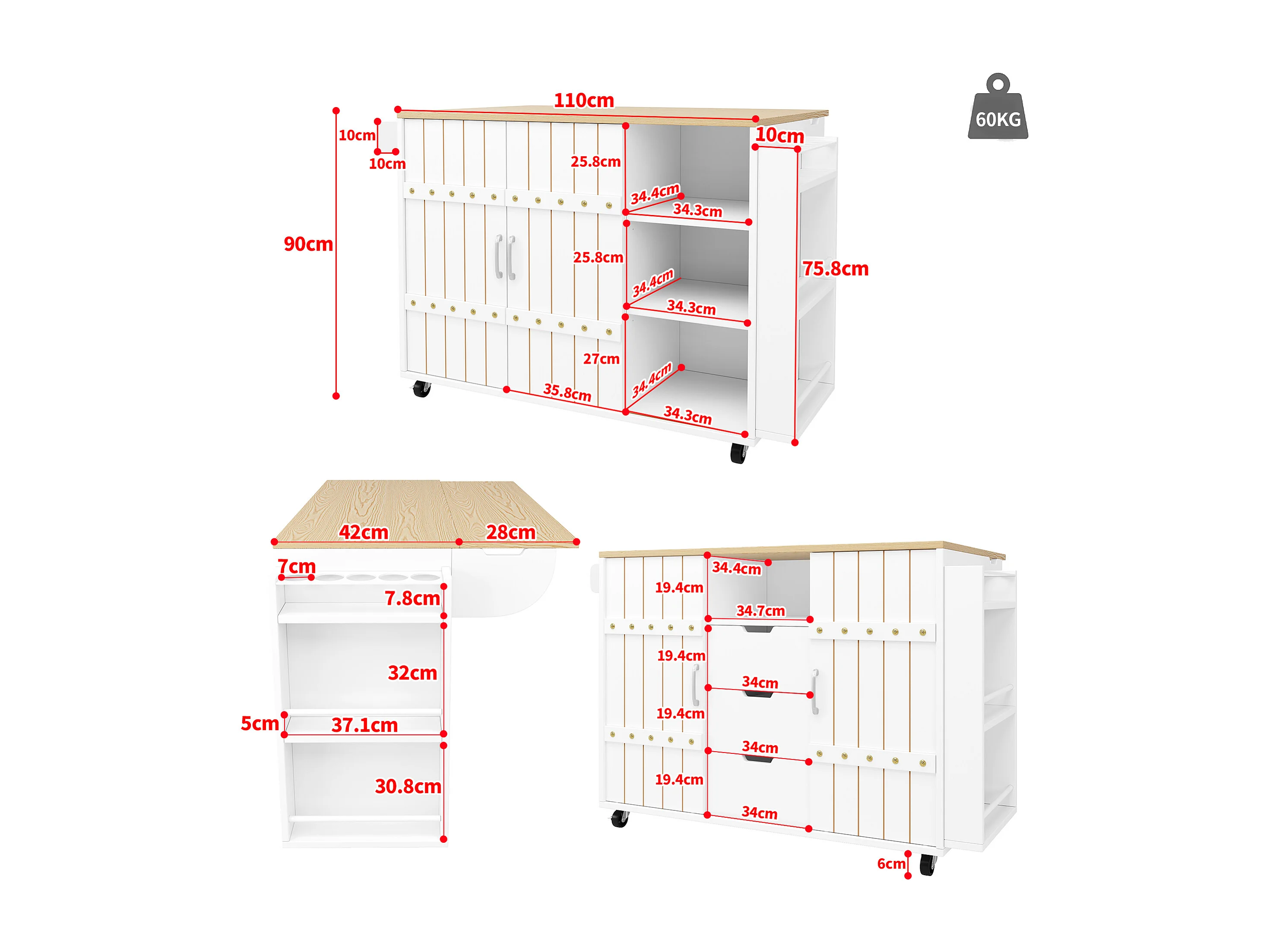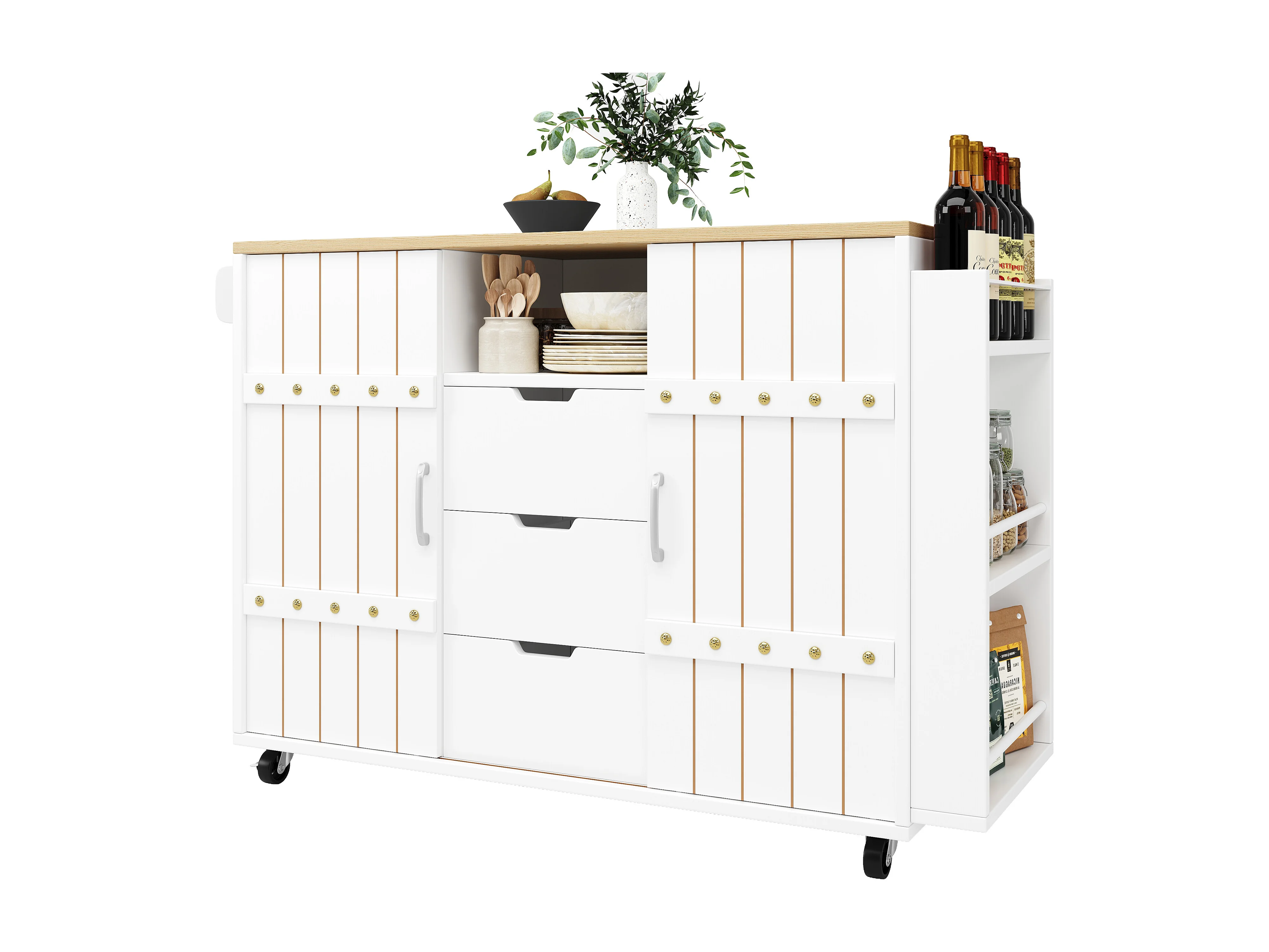 Meuble de cuisine avec roulettes, plan de travail, étagères et tiroirs, blanc, portes coulissantes, porte-serviette (110x42x90 cm)