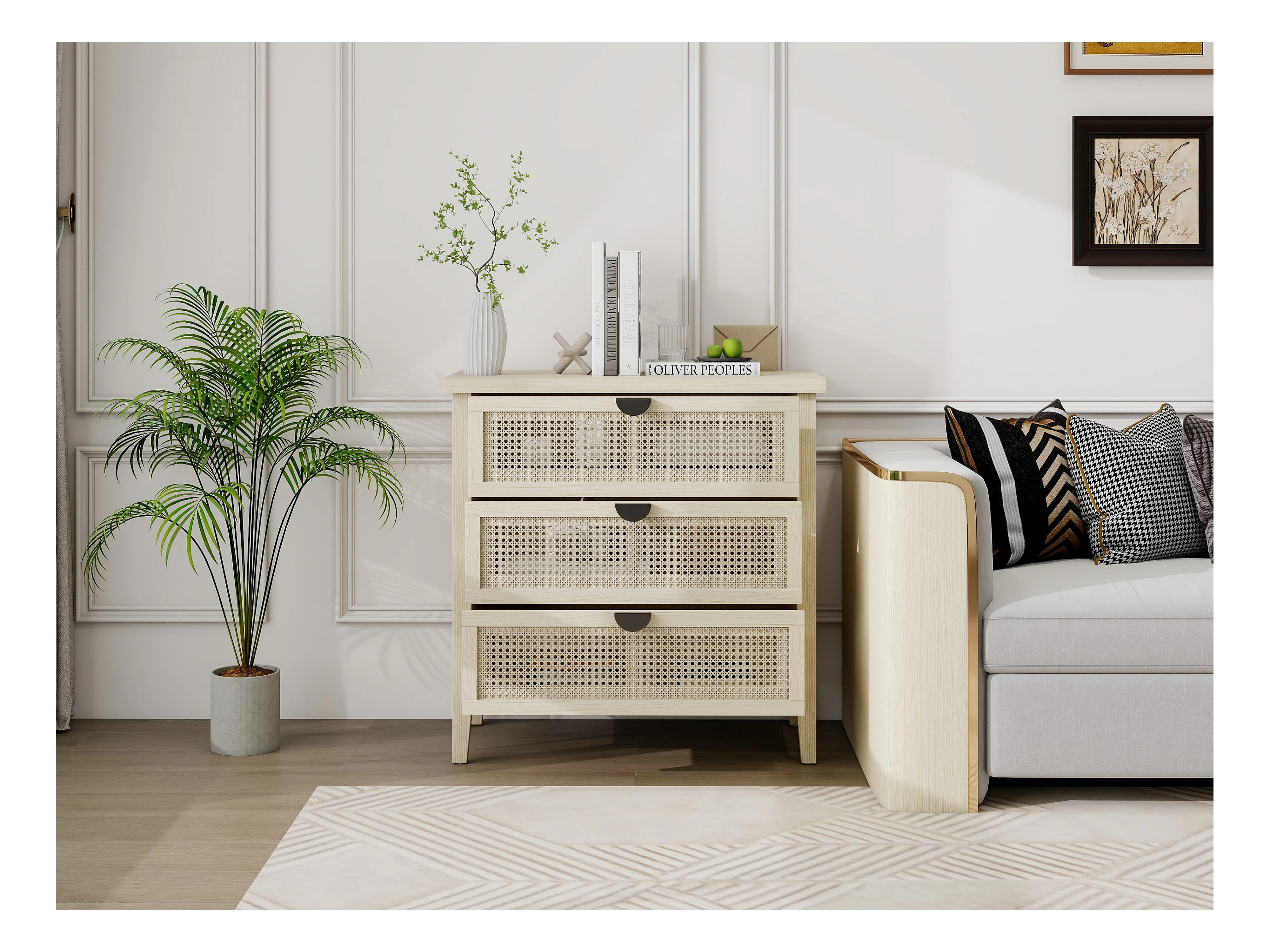 Meuble de rangement 3 tiroirs, design en bois naturel avec portes en rotin tressé, MDF, blanc et bois naturel (80x40x80 cm)