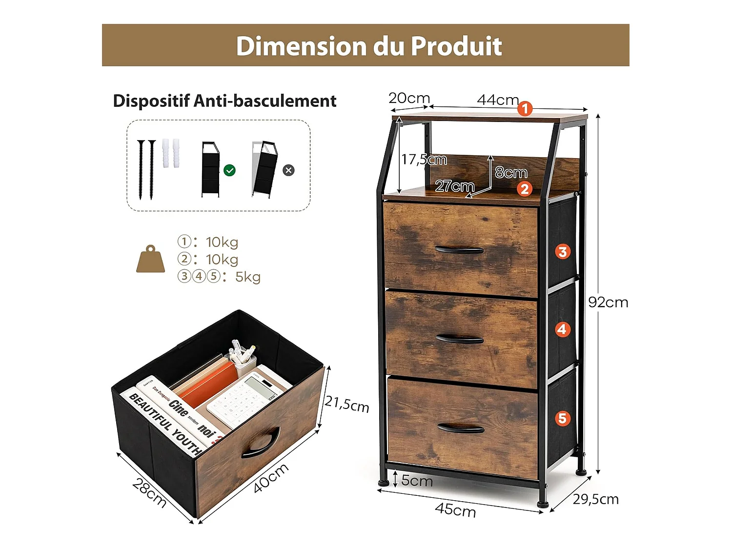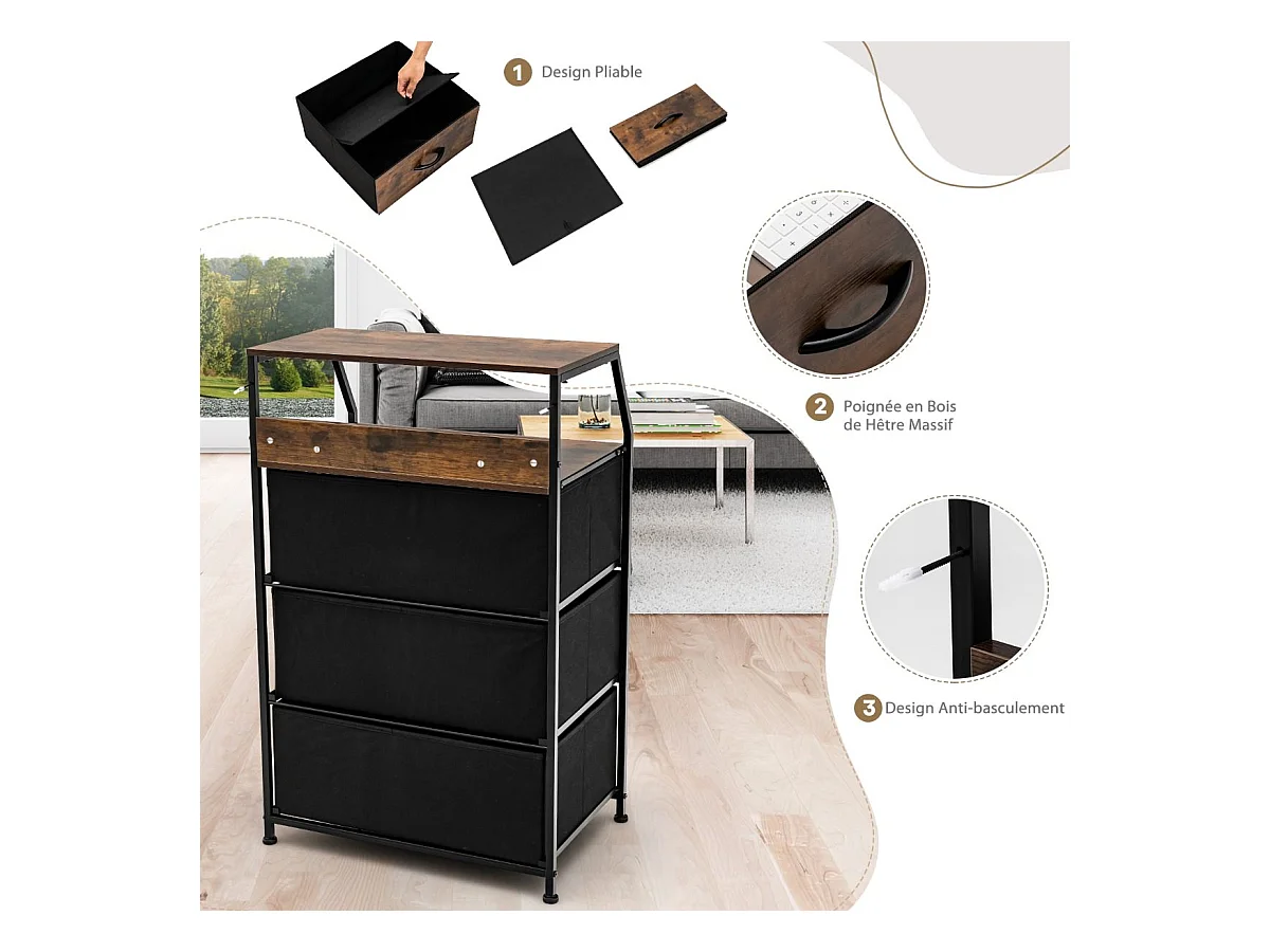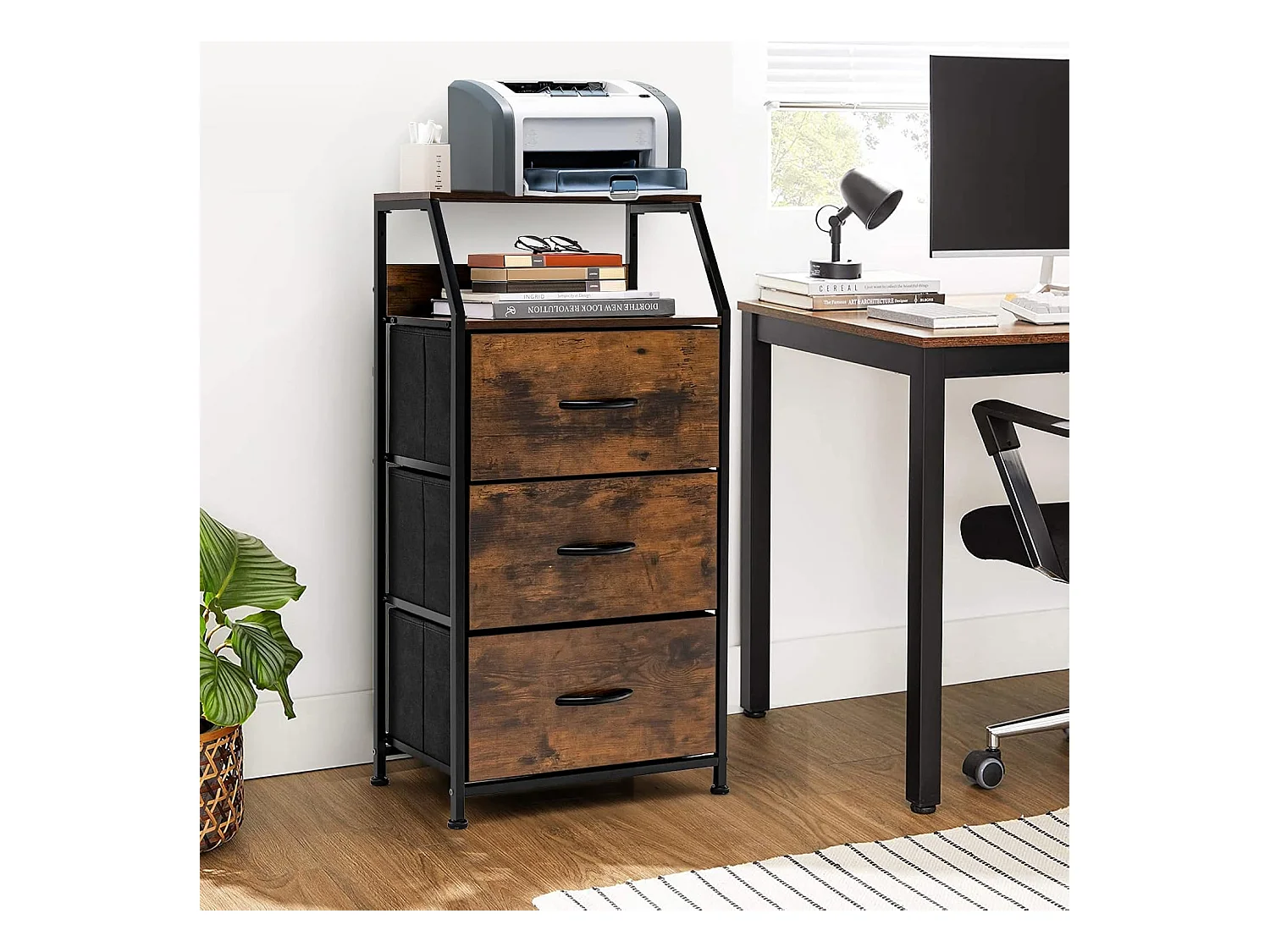 Meuble de Rangement à 3 Tiroirs, avec Étagère Supérieure et 3 Tiroirs Amovibles, Structure en Acier Massif, pour Chambre, Salon, Bureau, Marron Rustique