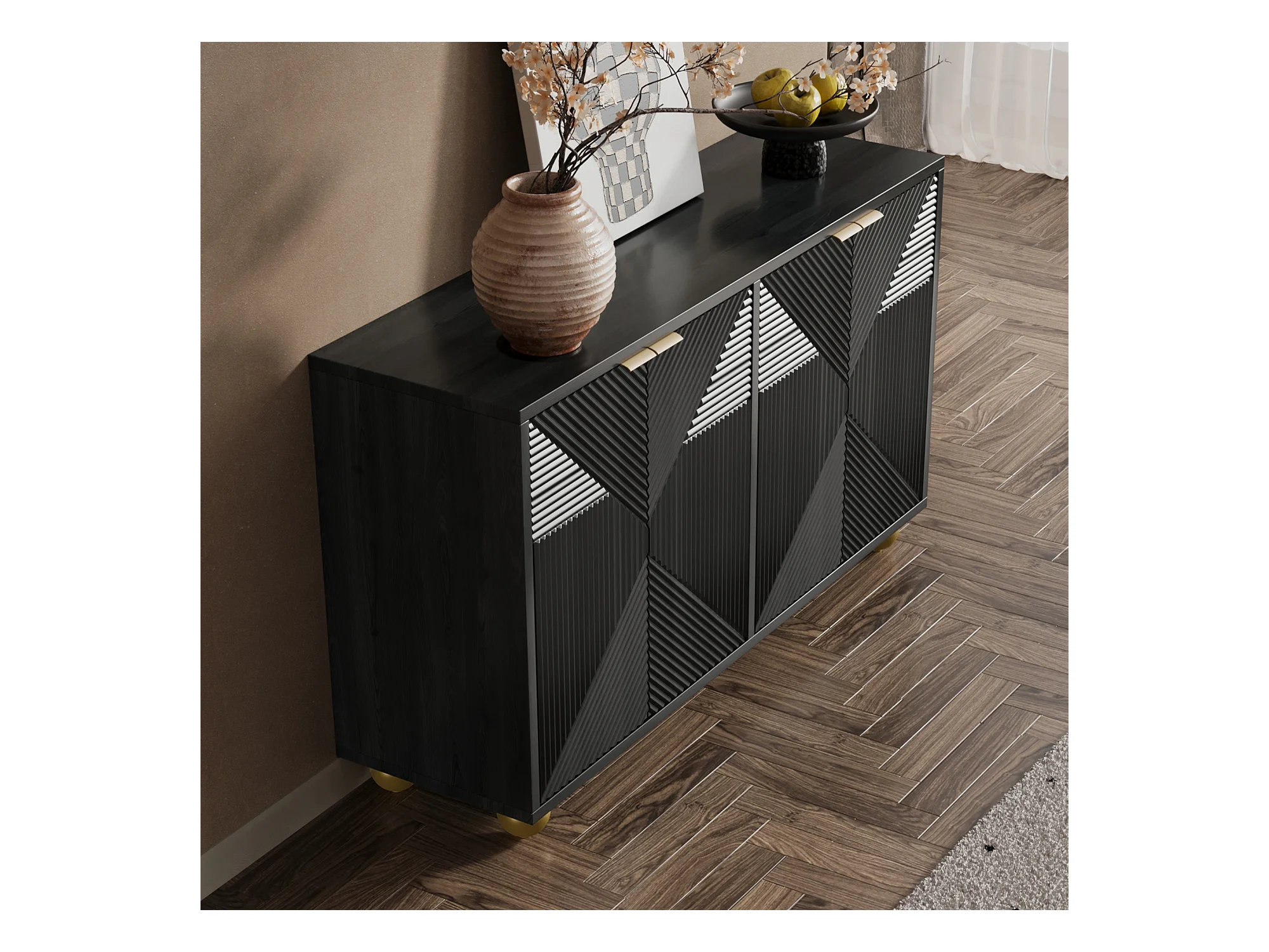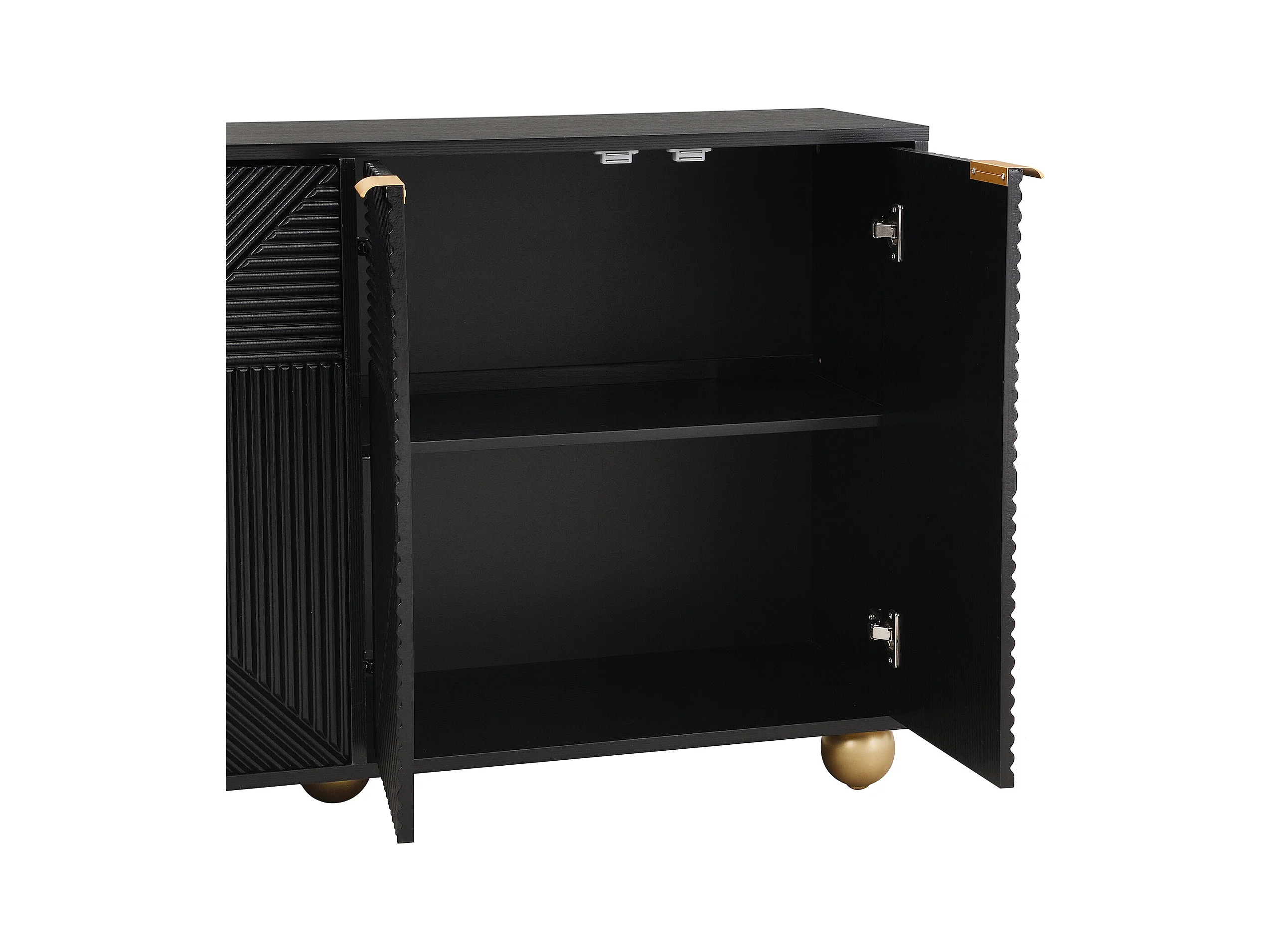 Meuble de rangement avec 4 portes sculptées, étagères ajustables, poignées métalliques, pieds sphériques, MDF, noir (120x35x71.5 cm)