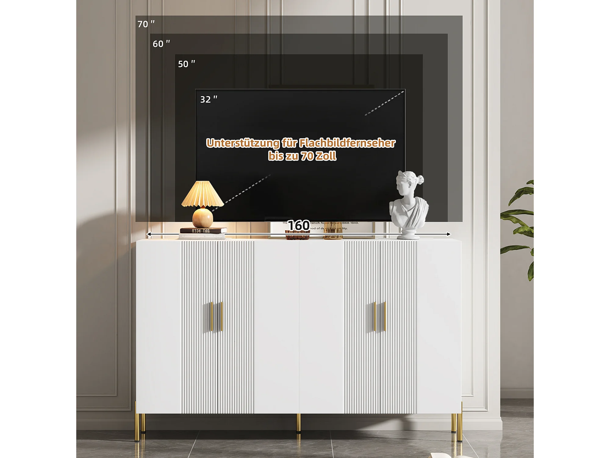 Meuble de rangement multifonction, 4 portes, design moderne, panneau de particules, blanc et doré (160x35x100 cm)