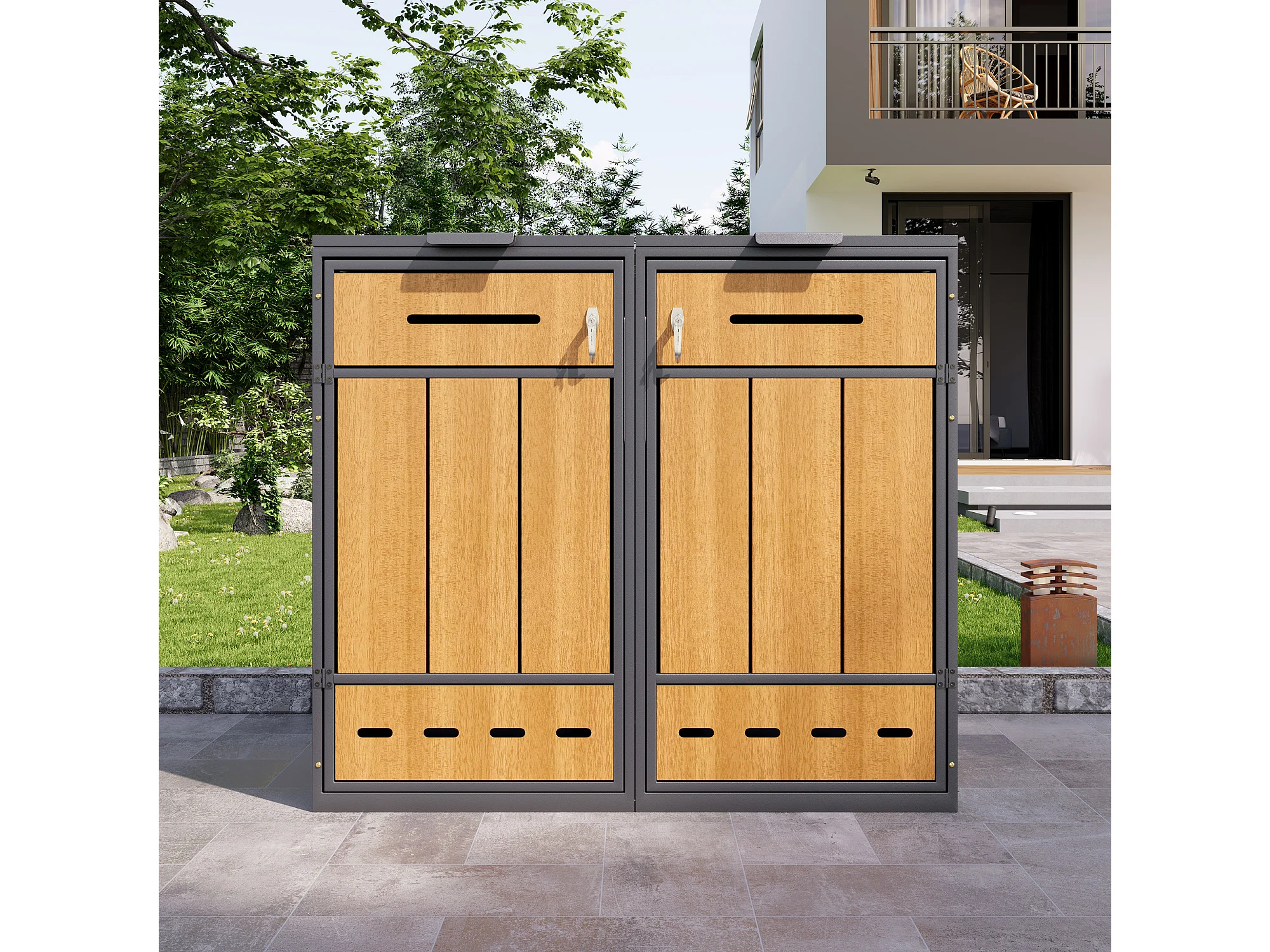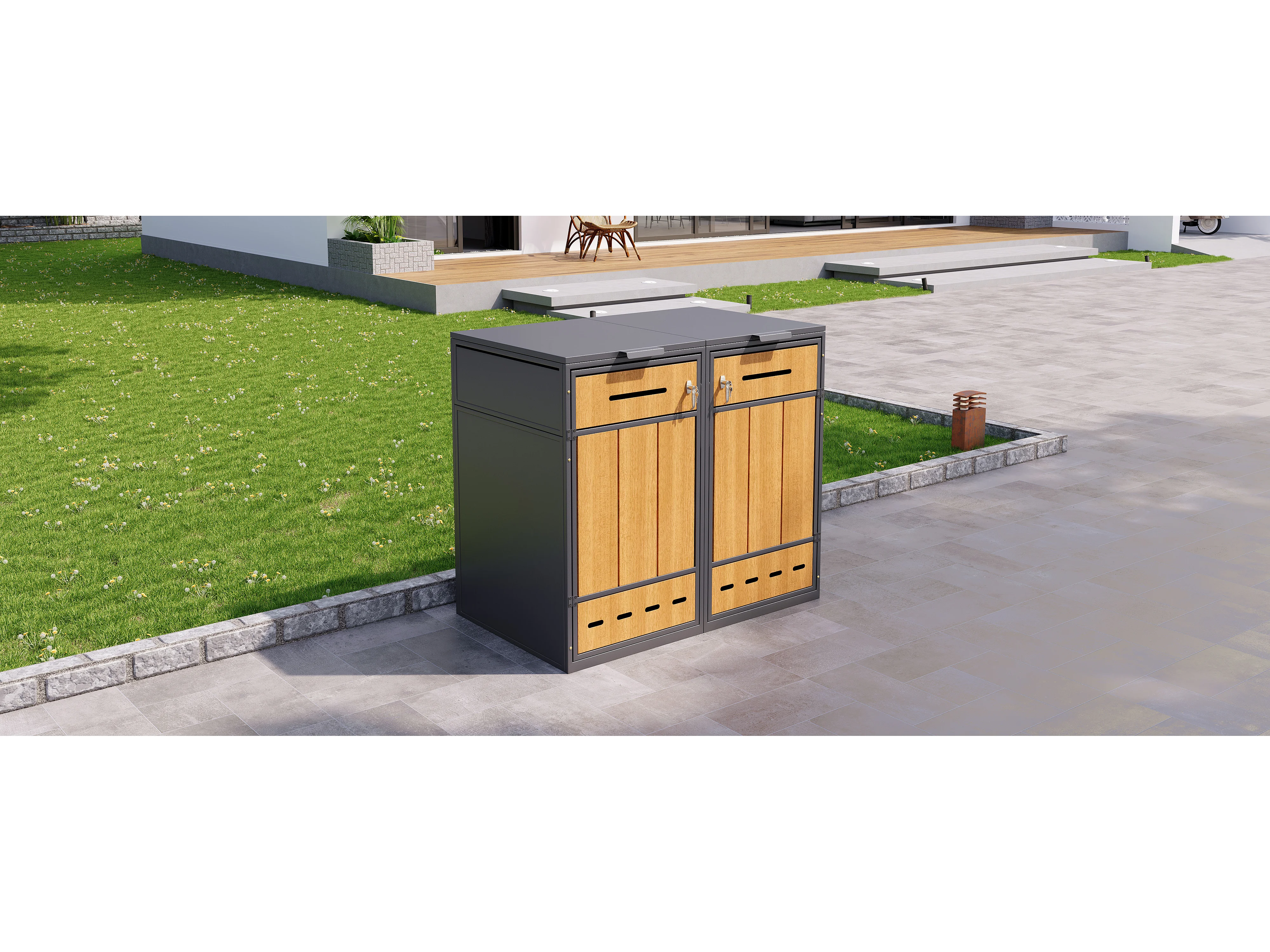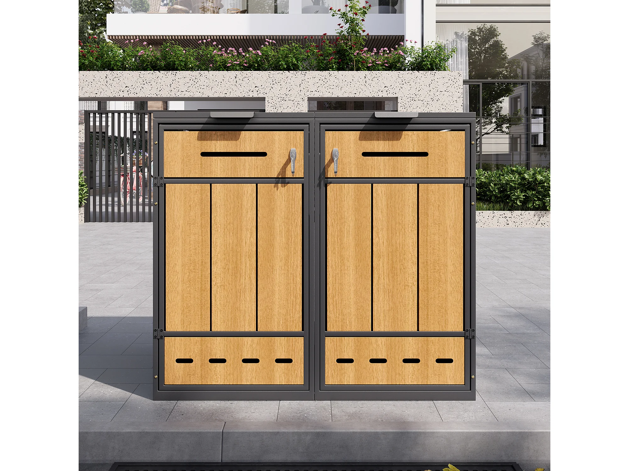 Meuble de rangement pour 2 poubelles (120-240 litres) - 132 x 84.5 x 118 cm - avec trous d'aération + 2 portes - métal - gris + naturel