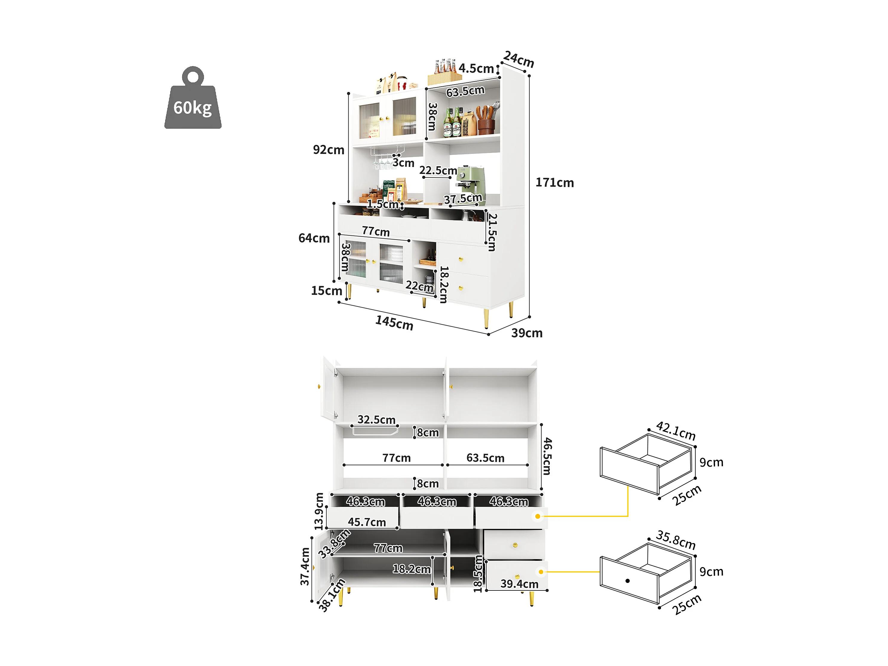 Meuble de restaurant avec porte en verre Changhong, design moderne, MDF, blanc, avec étagère à vin et rangement multi-étages (145x39x171 cm)