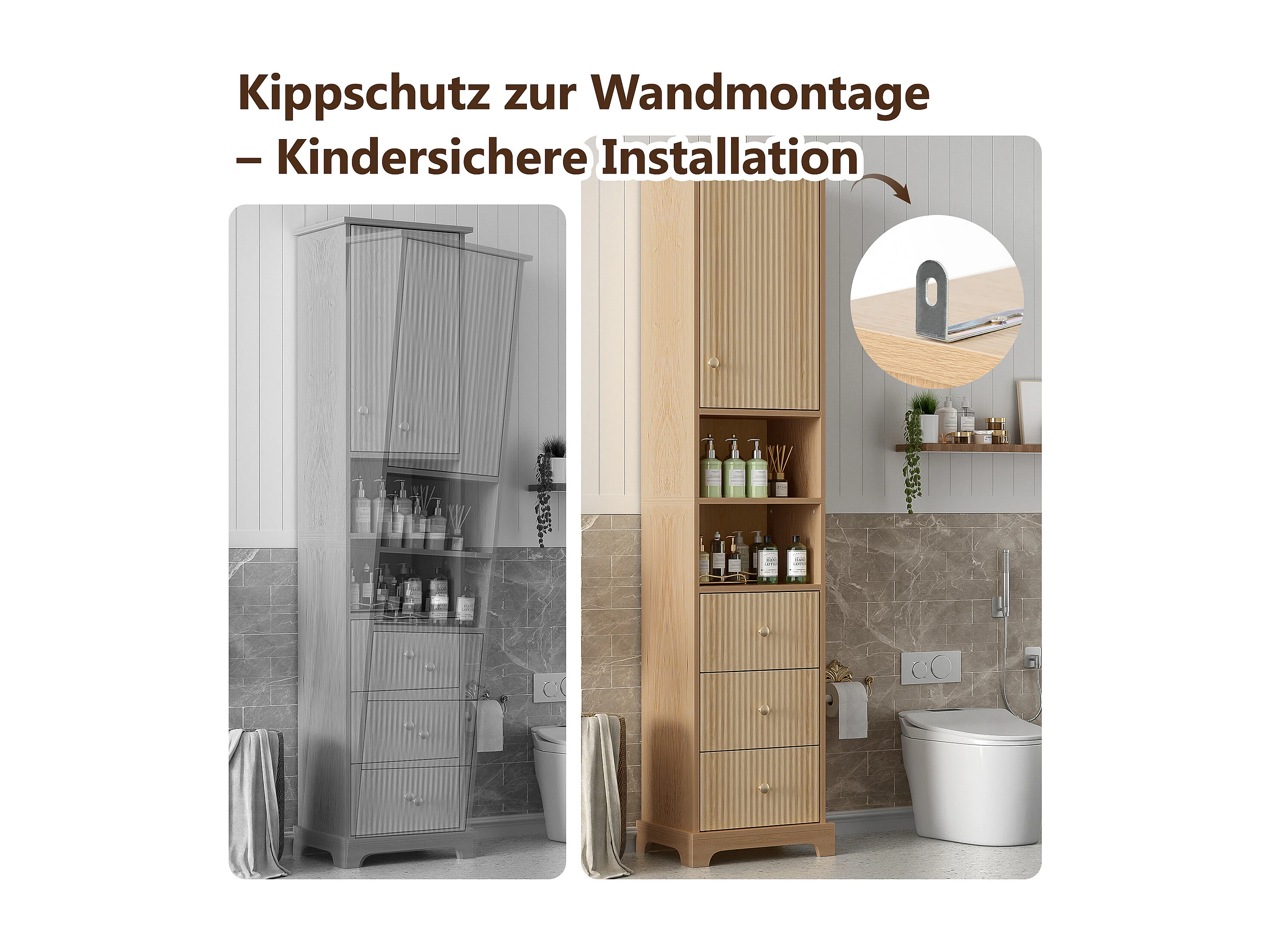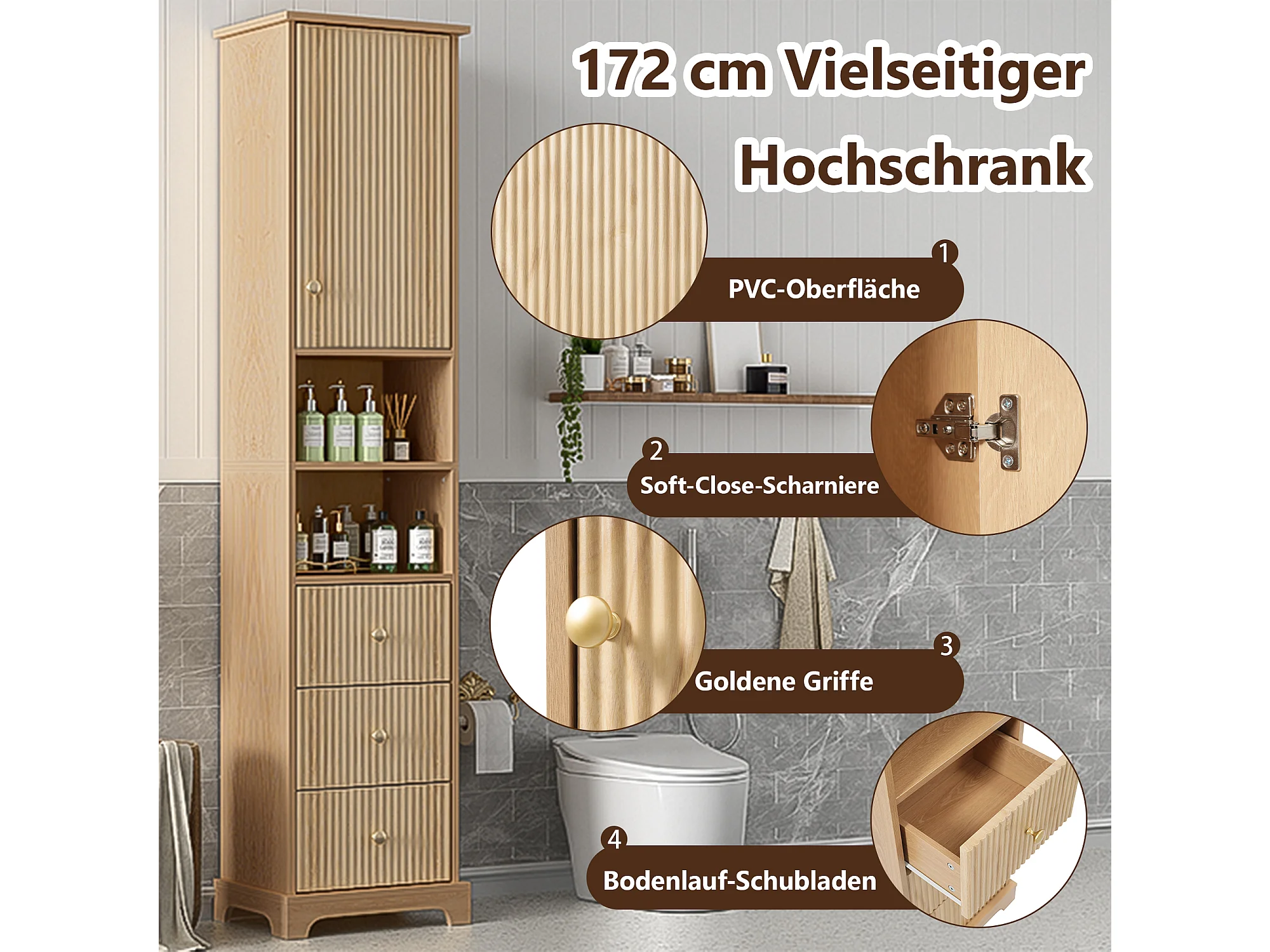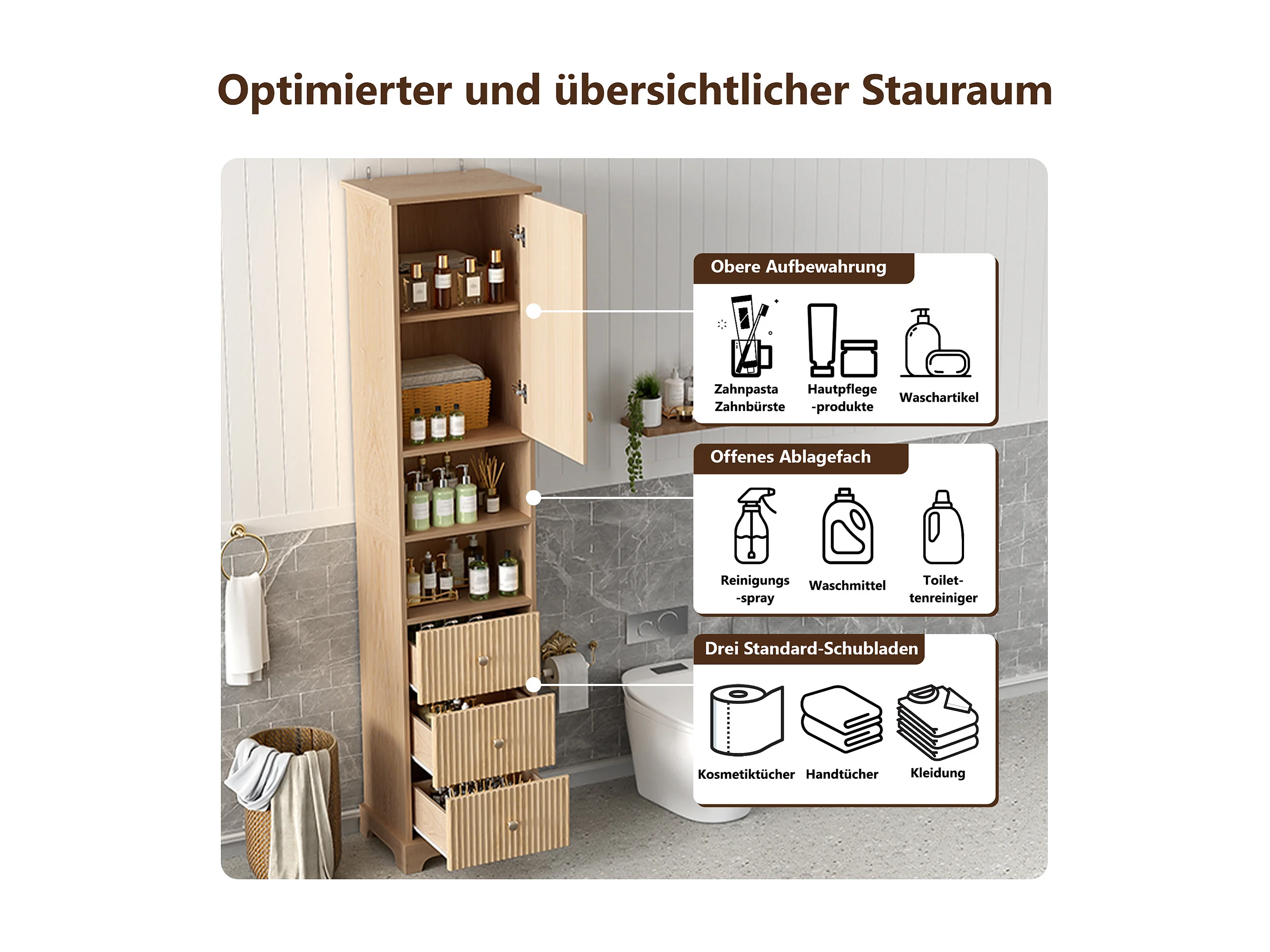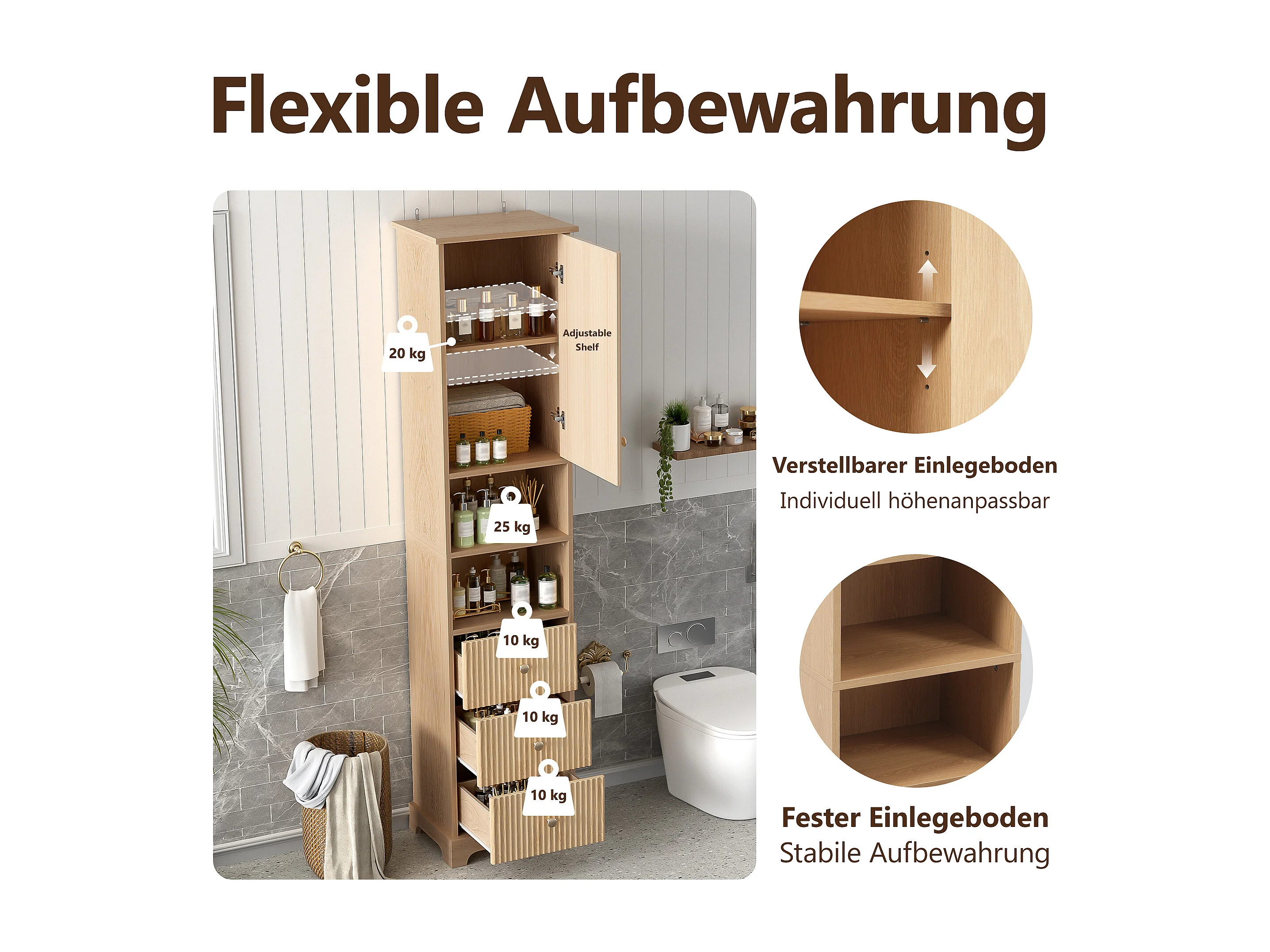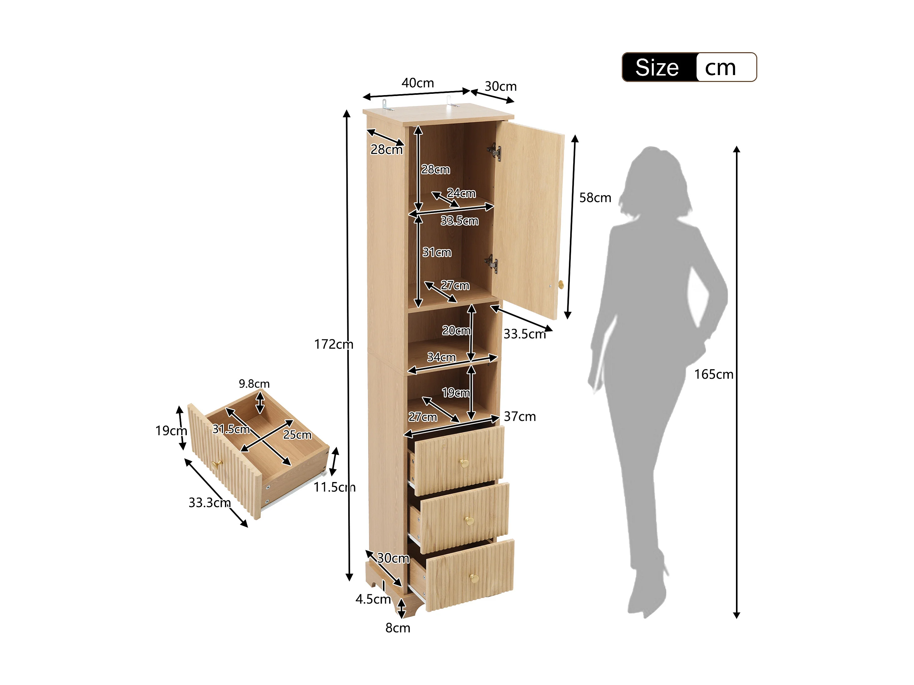 Meuble de salle de bain - 40 x 30 x 172 cm - motif à rayures verticales - avec 3 tiroirs + 2 étagères - MDF - naturel
