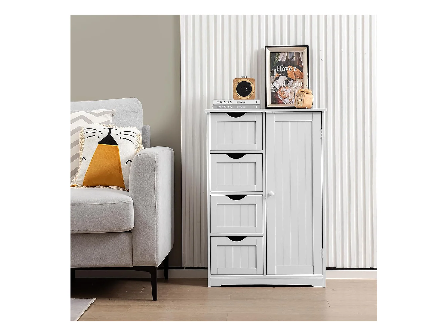 Meuble de Salle de Bain, Armoire de Rangement avec 4 Tiroirs et Placard avec Étagère Réglable avec Porte, Commode pour Salon, Salle de Bain, 56 x 30 x 82 cm (Blanc)