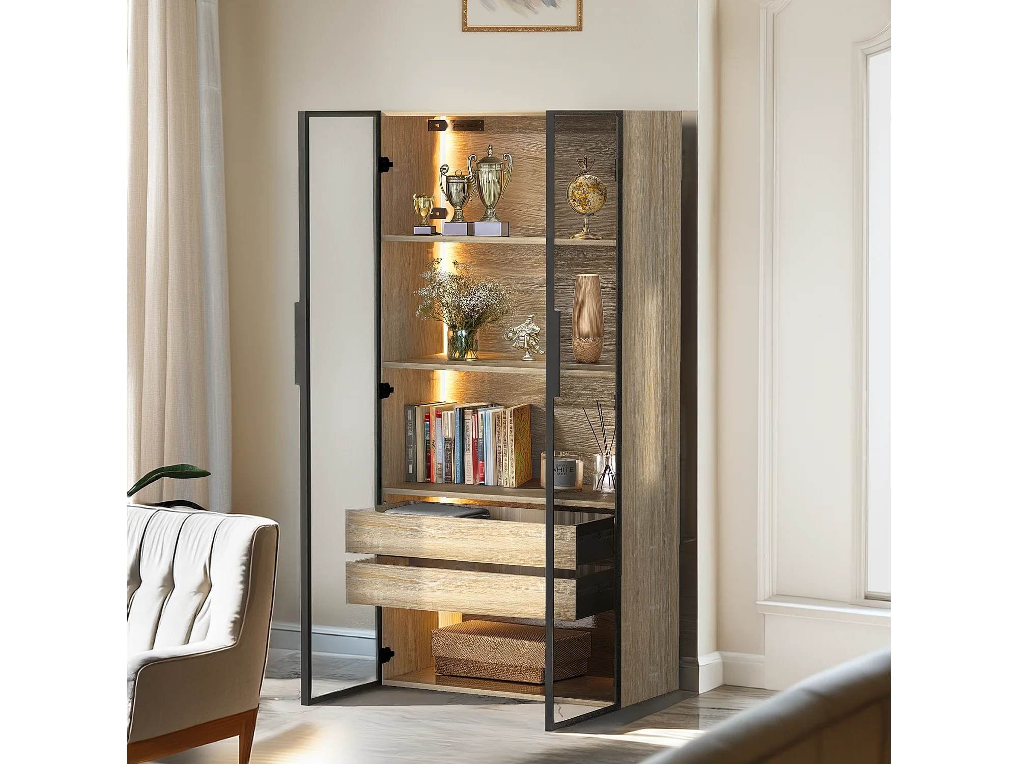 Meuble de salle de bain avec 2 portes, 2 grands tiroirs, LED intégré, MDF, bois clair, 73x36x155 cm