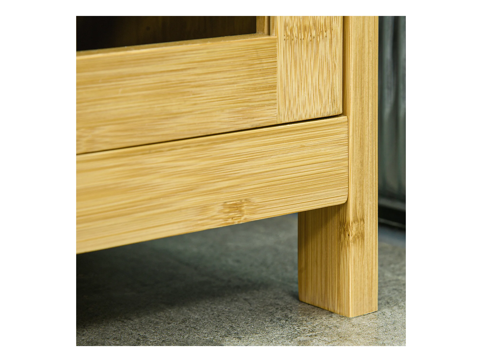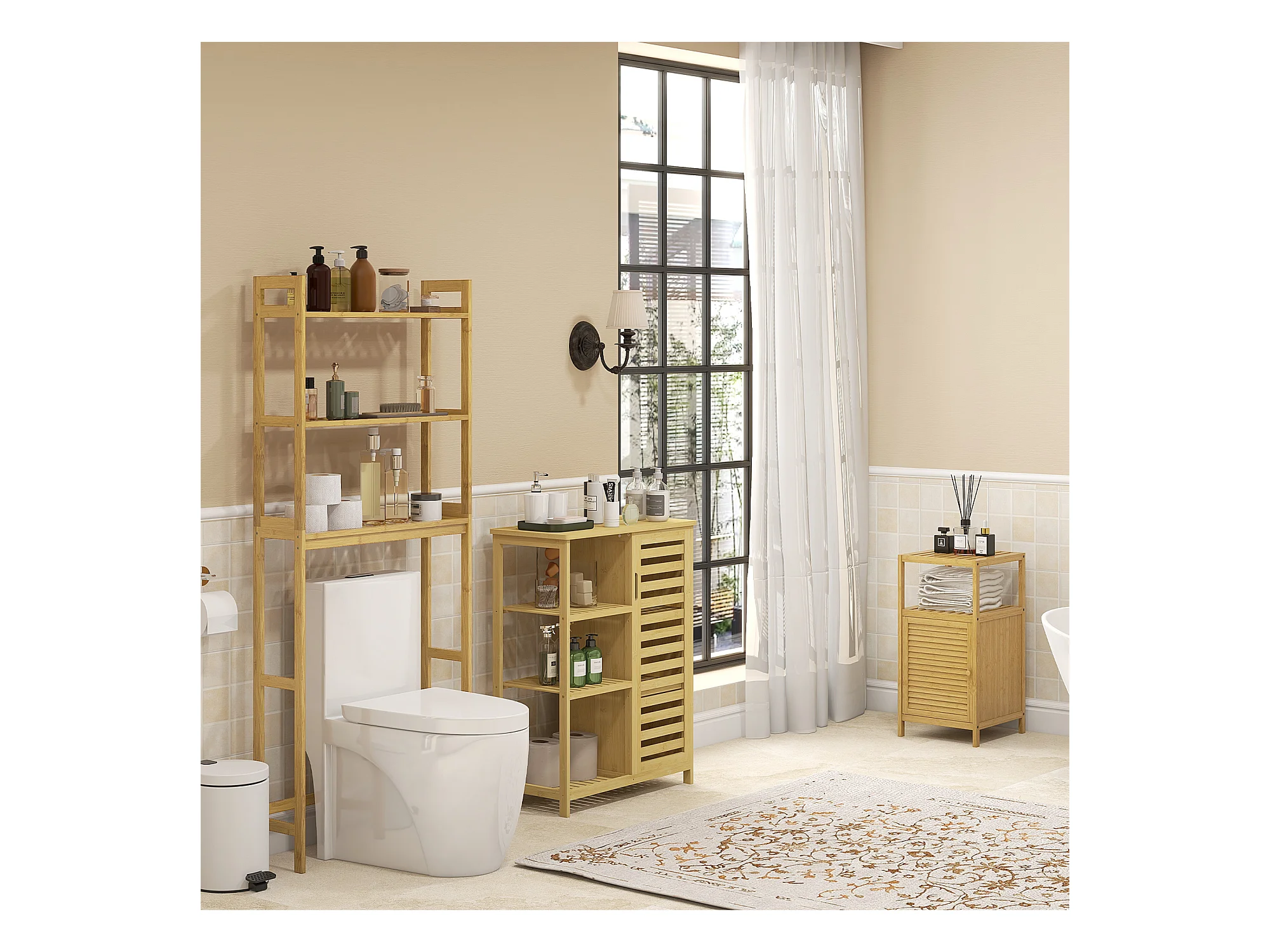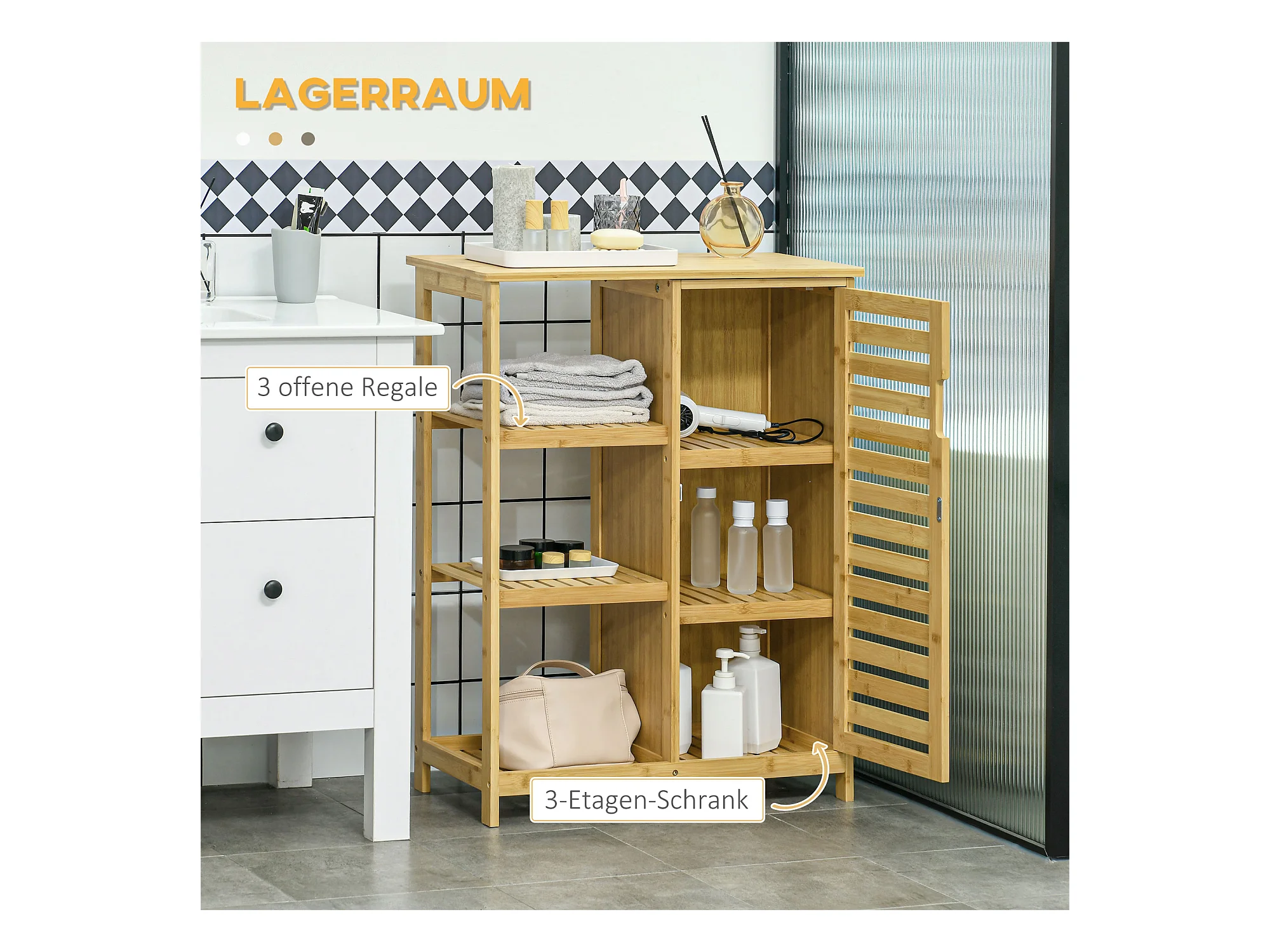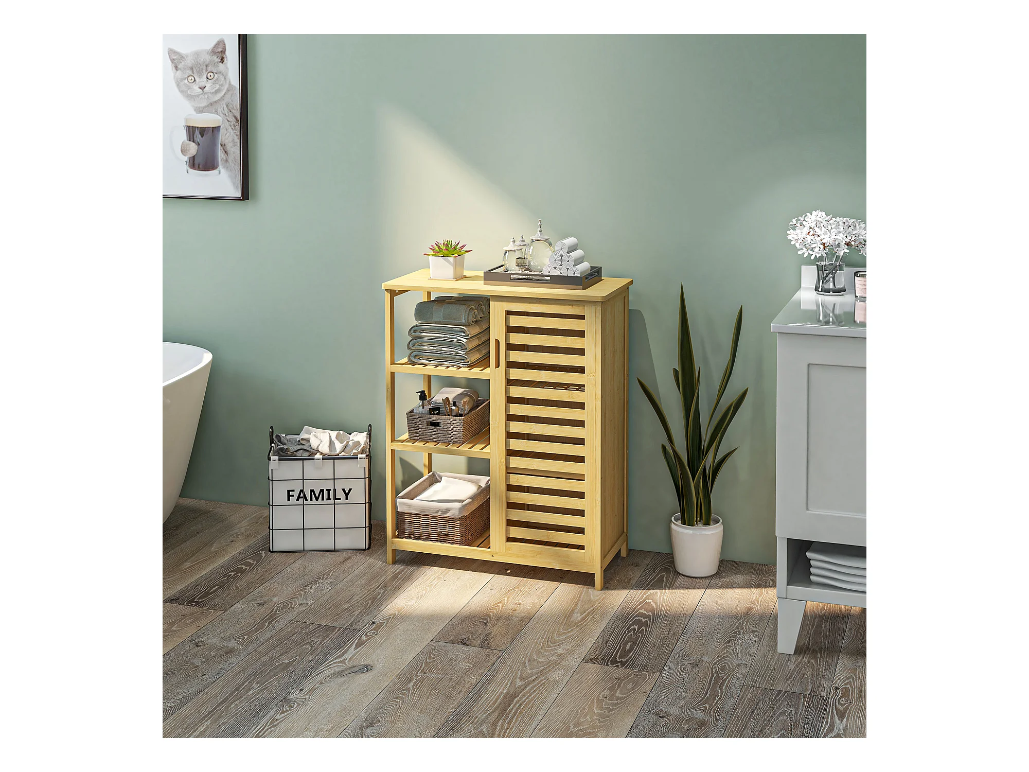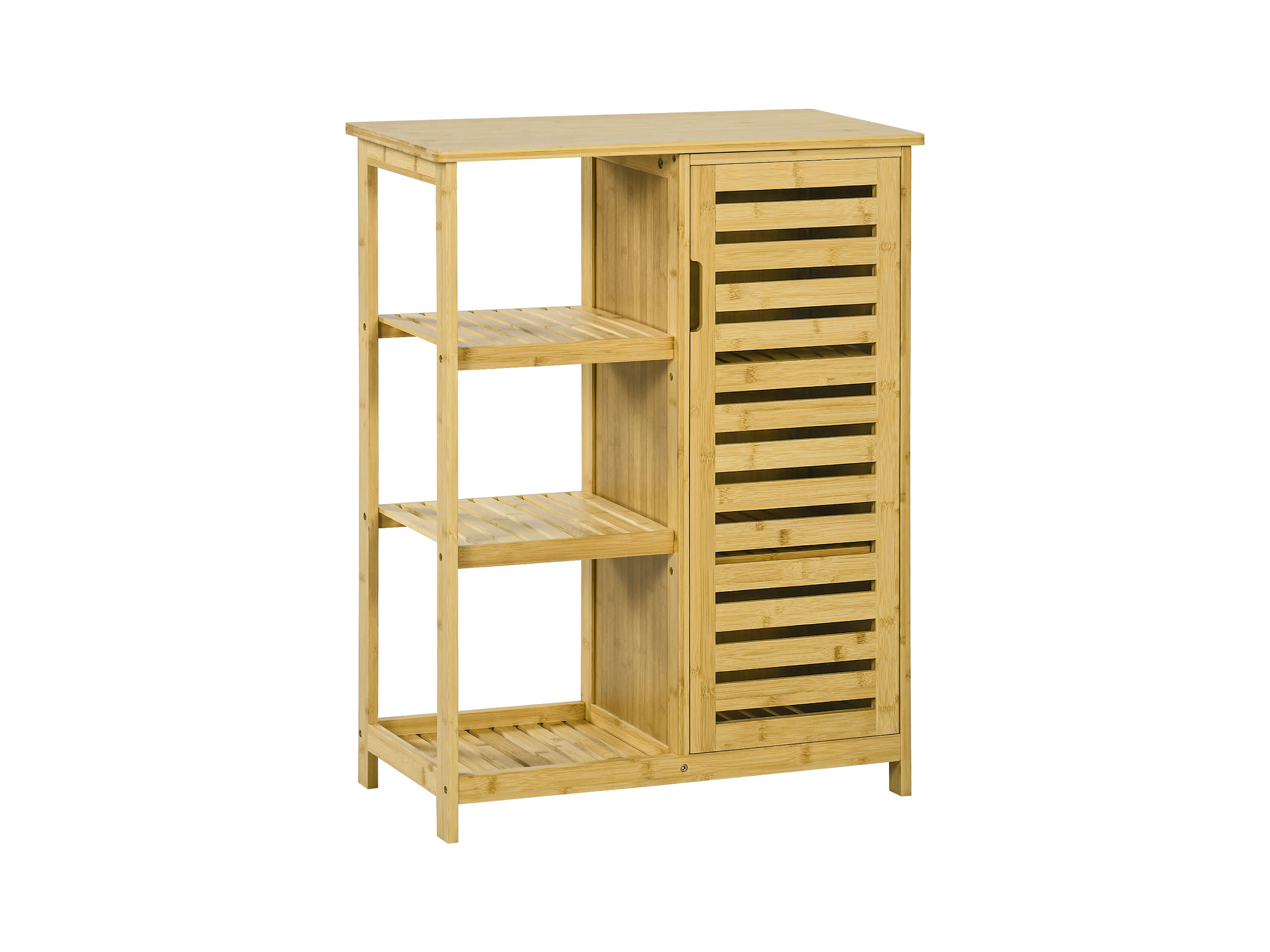 Meuble de salle de bain avec 3 étagères ouvertes, 1 compartiment fermé, en bambou naturel, avec protection anti-basculement (66x33x87 cm)