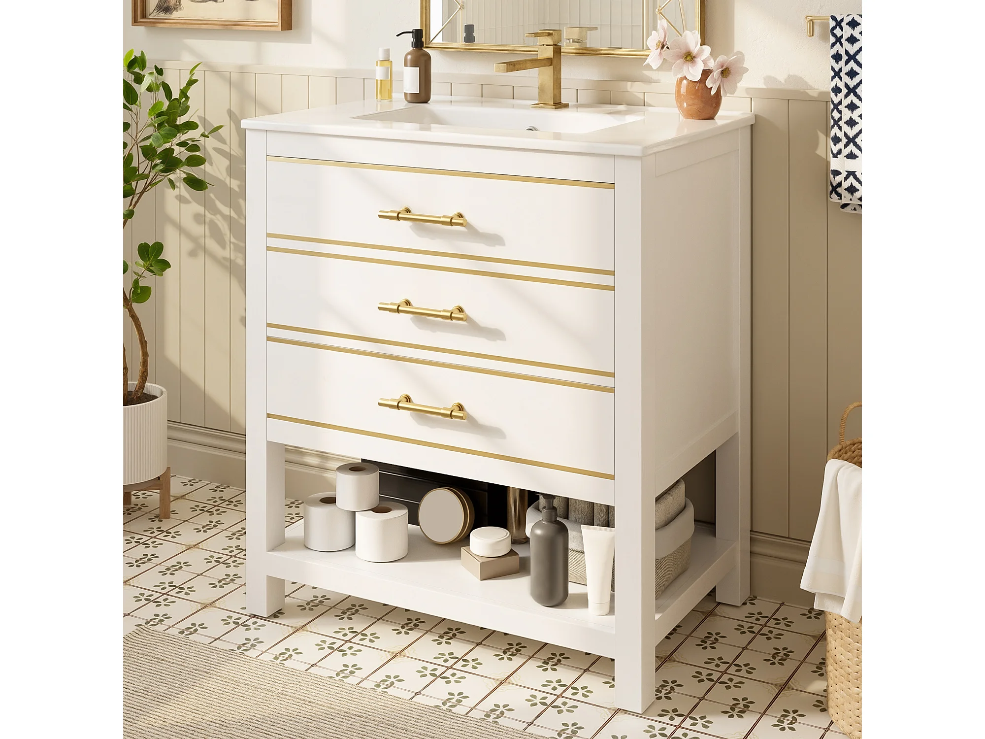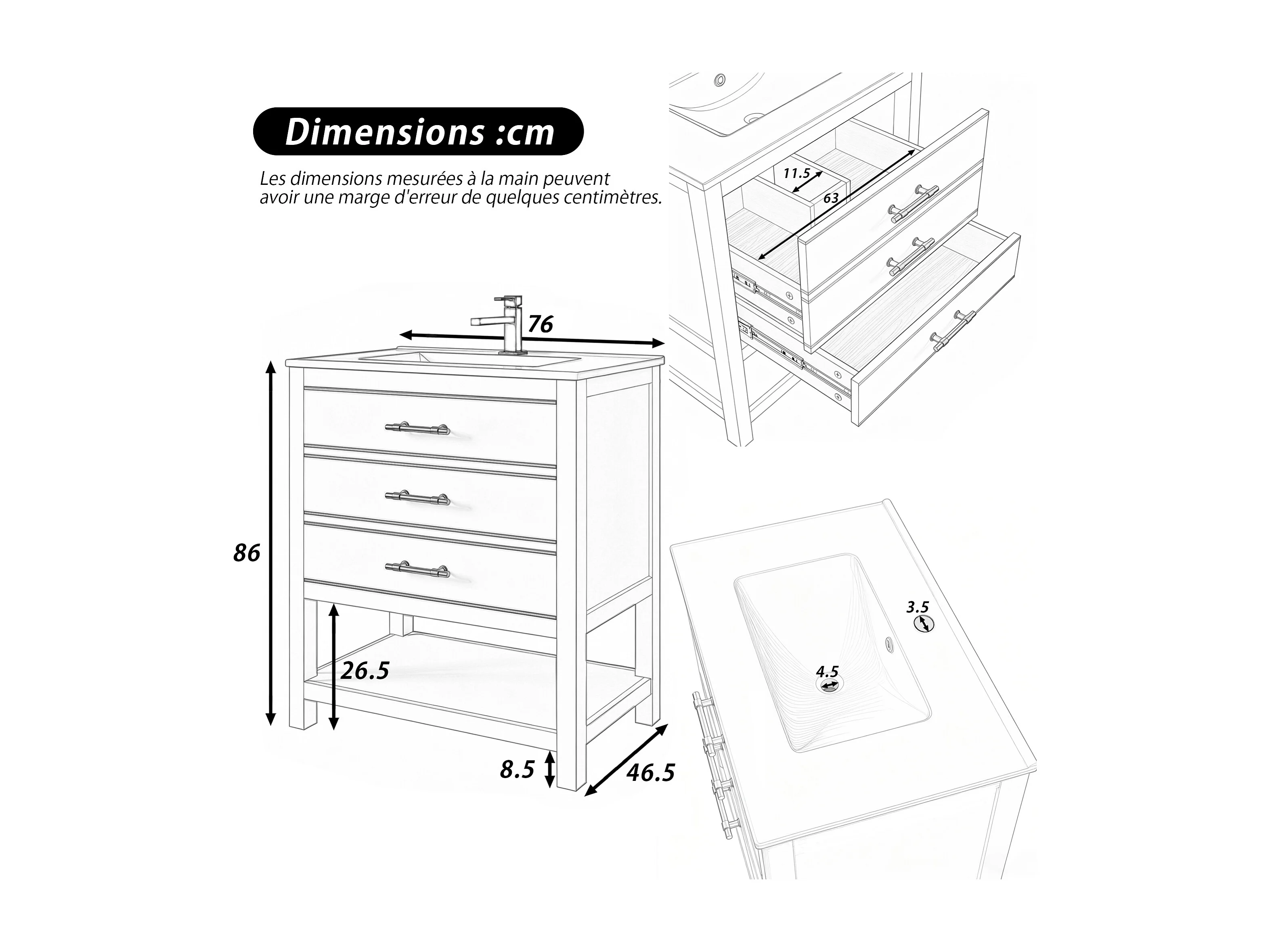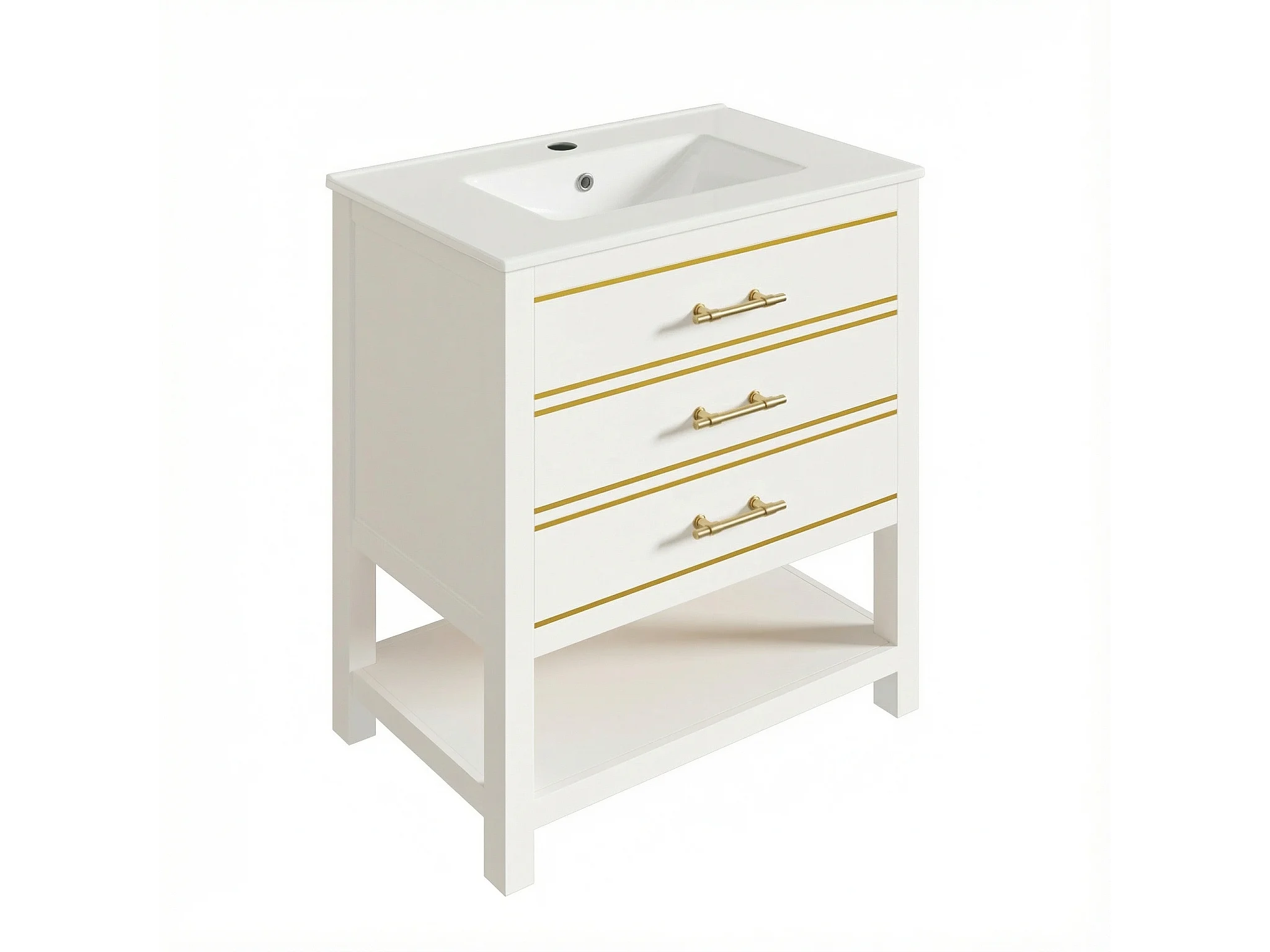 Meuble de salle de bain - avec une vasque en céramique - avec 2 tiroirs et 1 compartiment ouvert - blanc (robinet non inclus)