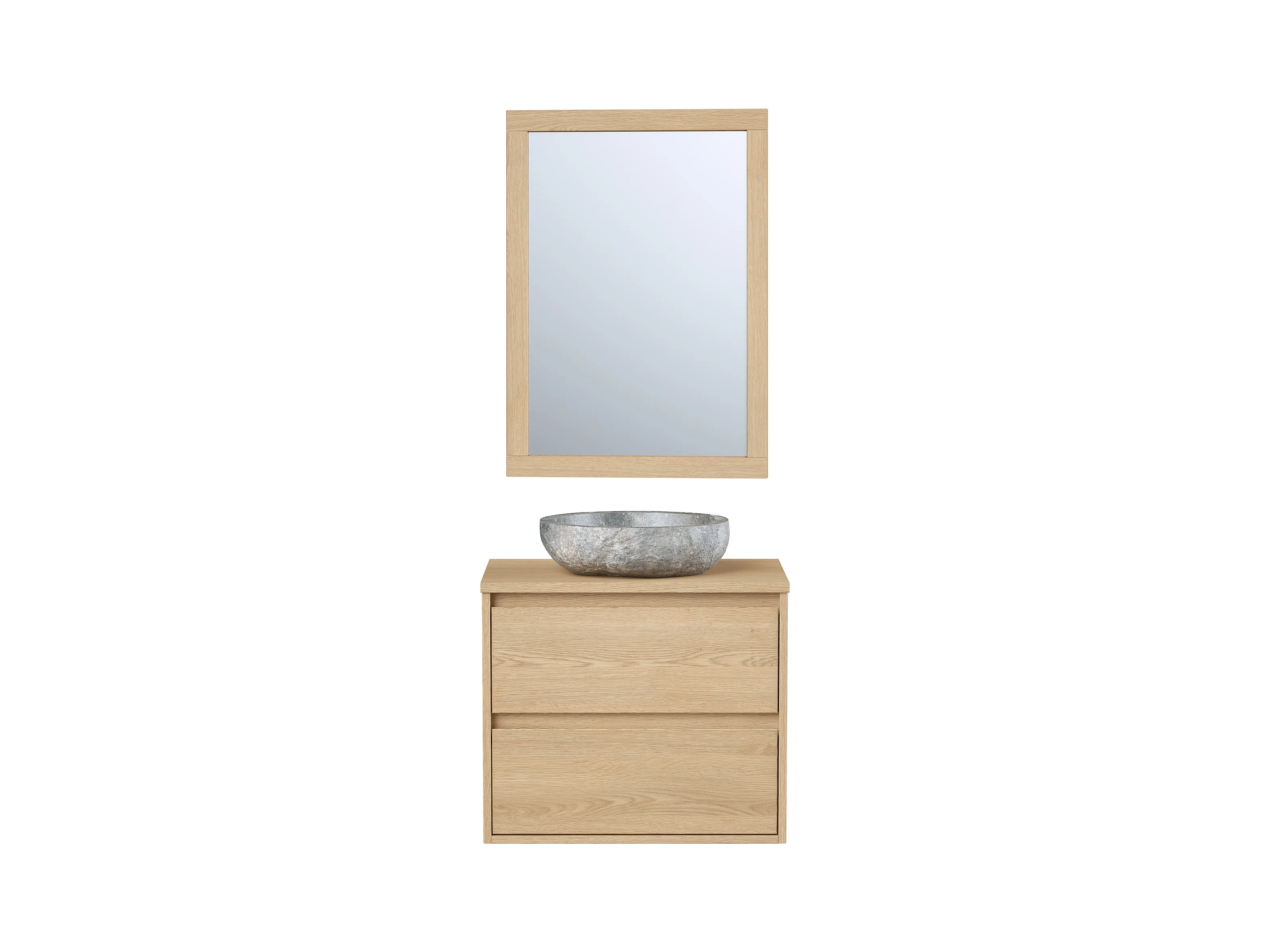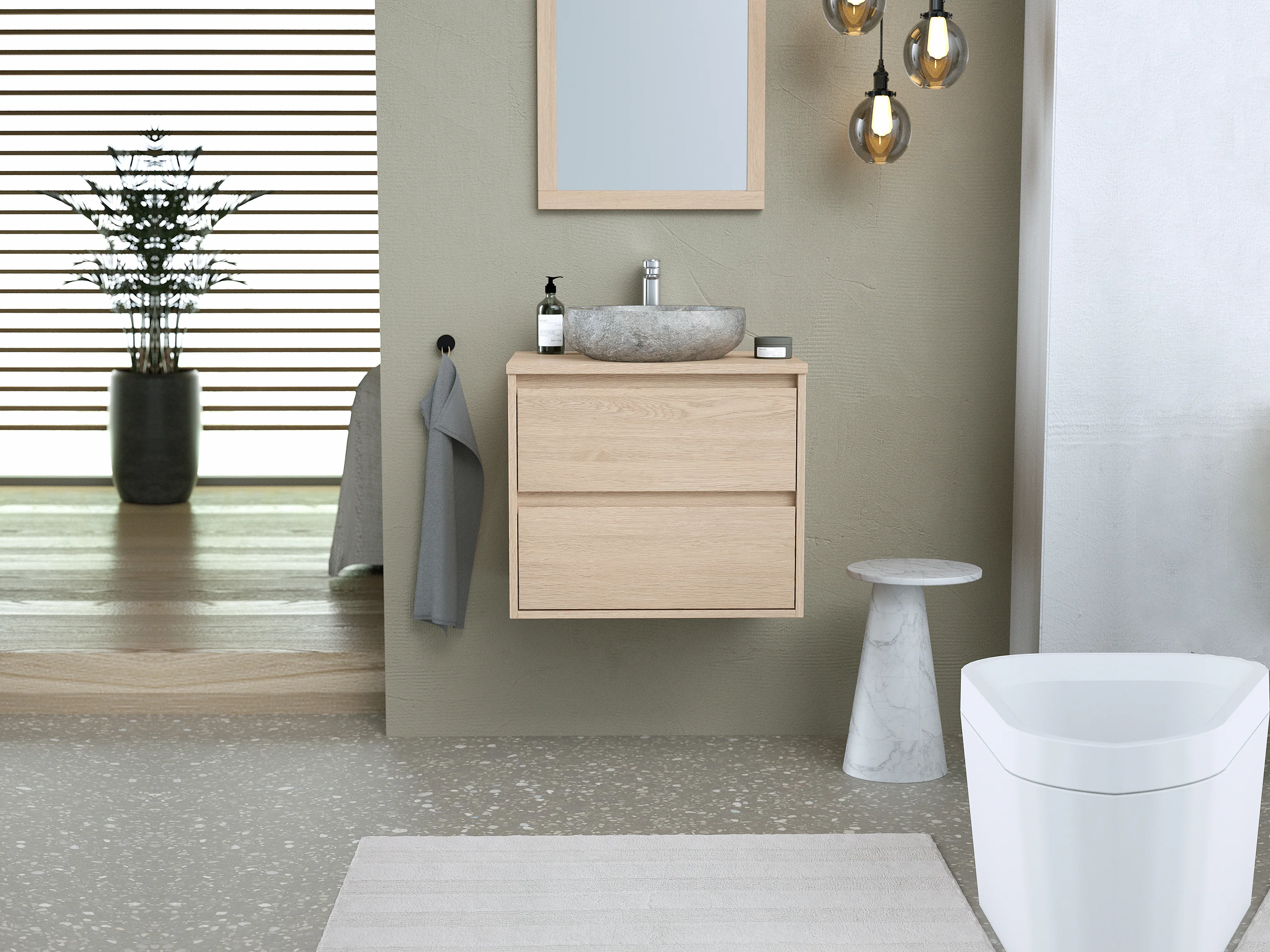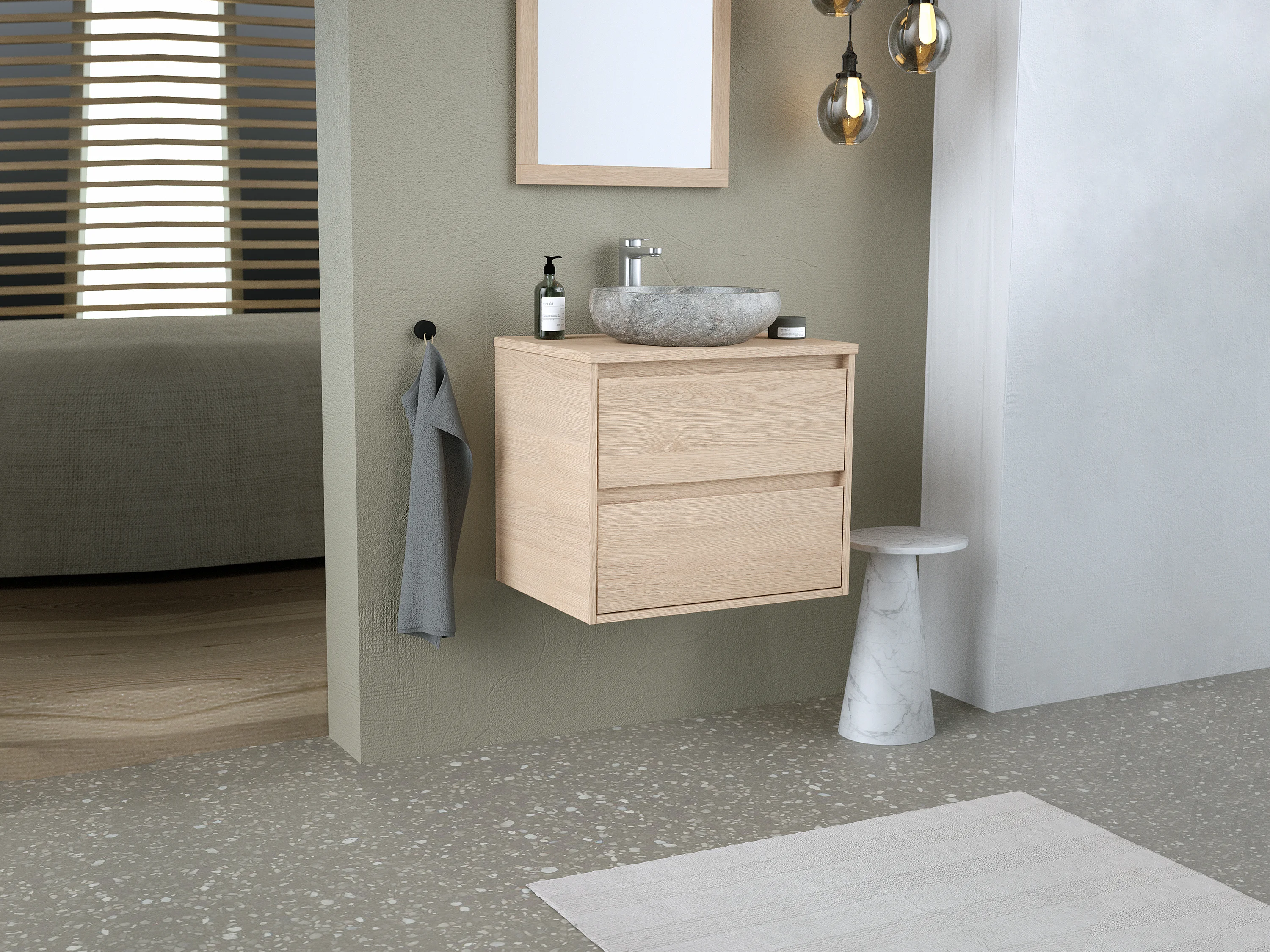 Meuble de salle de bain avec vasque à poser en pierre et miroir - Placage chêne - 60 cm - MILIPAM