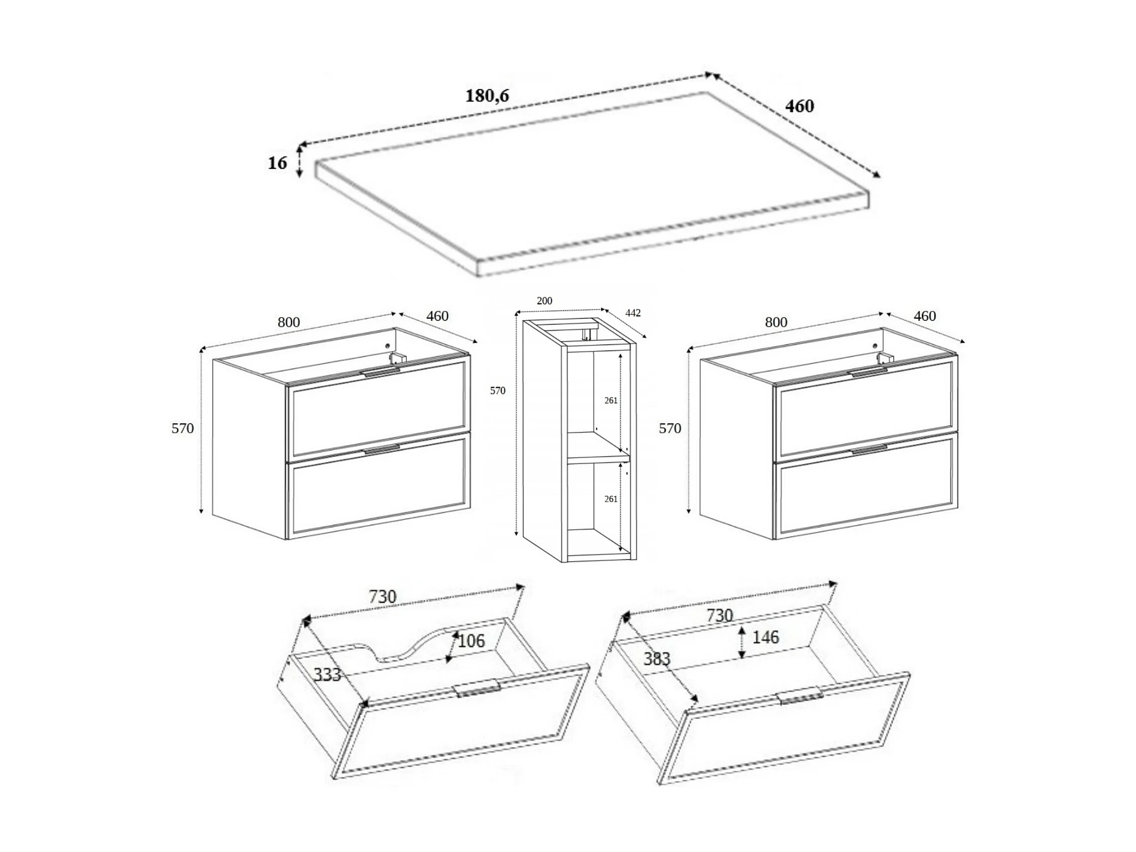Meuble de salle de bain, Cachemire / Chêne Craft, poignée noire, 180 ( 2 x 80 + 20) x 46 x 57 cm