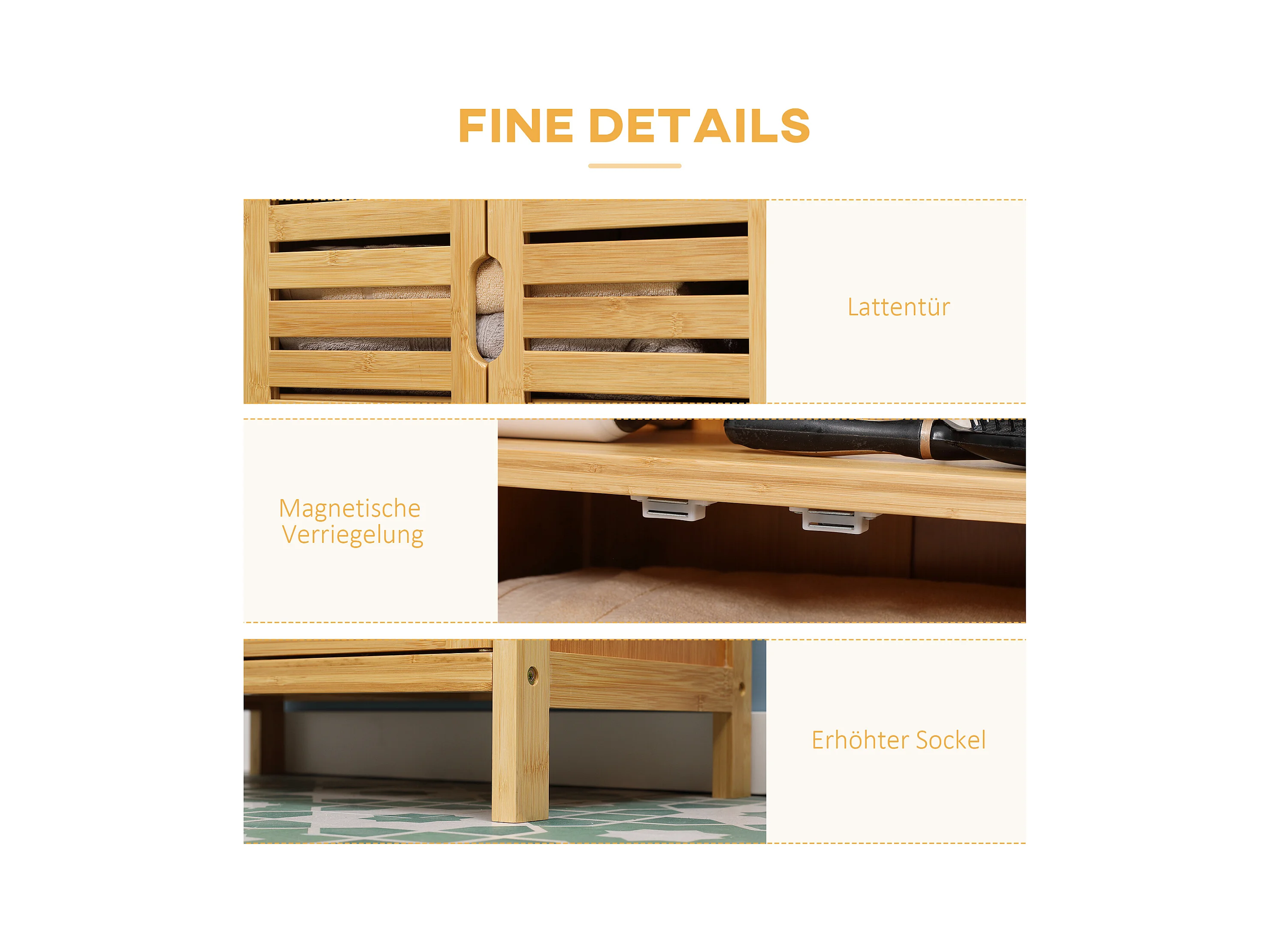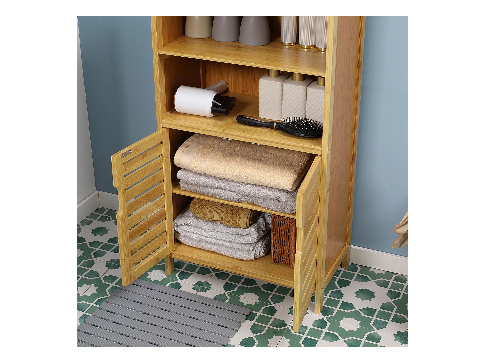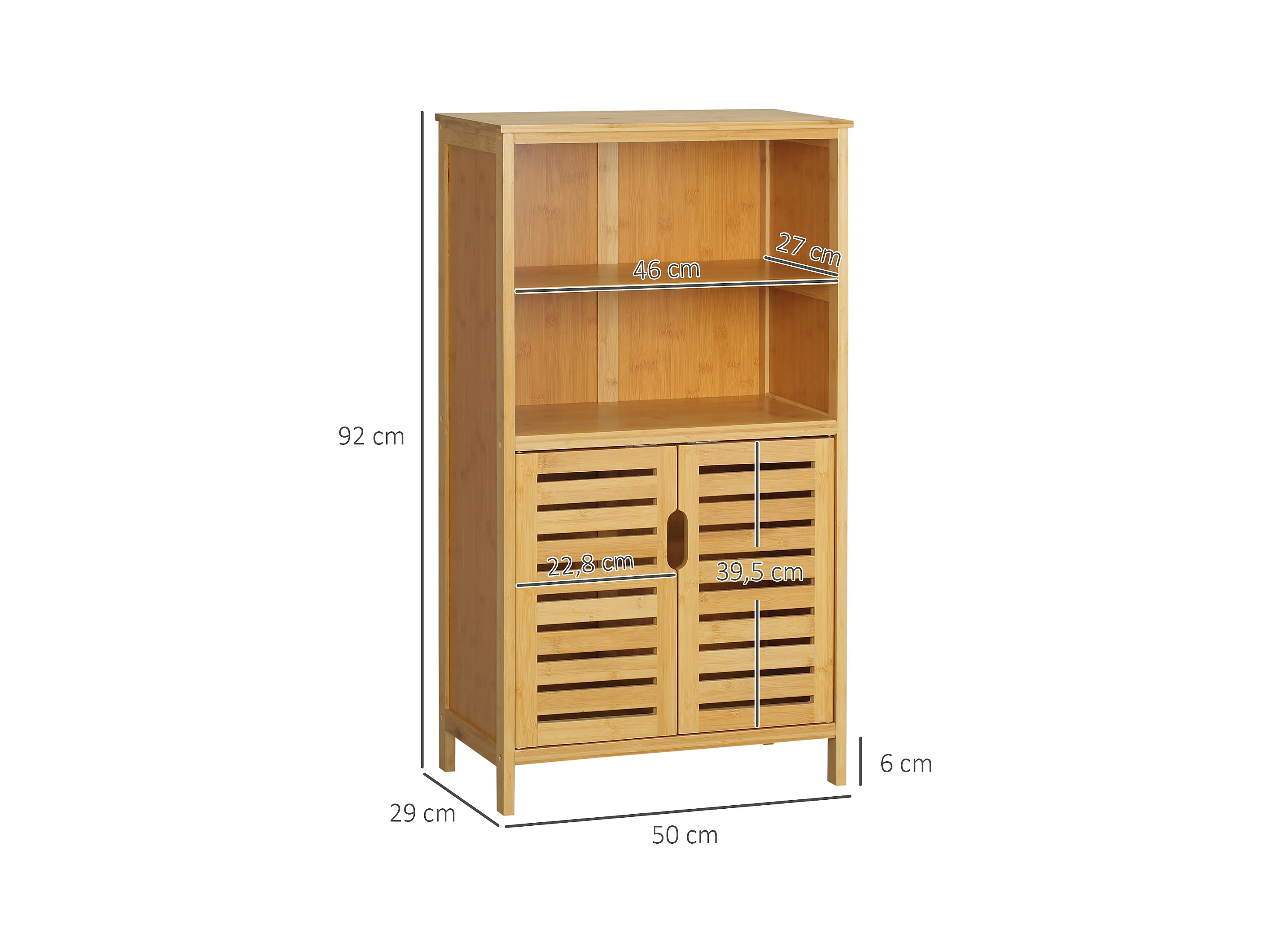 Meuble de salle de bain en bambou, avec portes à lamelles, anti-basculement, bois naturel (50x29x92 cm)