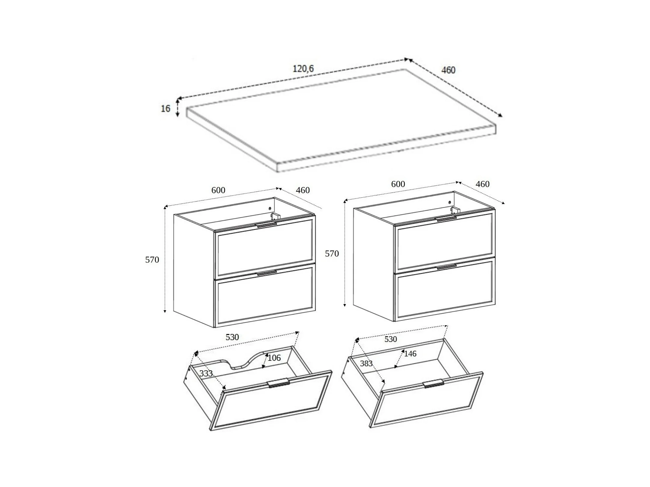 Meuble de salle de bain, Gris Foncé / Blanc, poignée dorée, 120 (2 x 60) x 46 x 57 cm