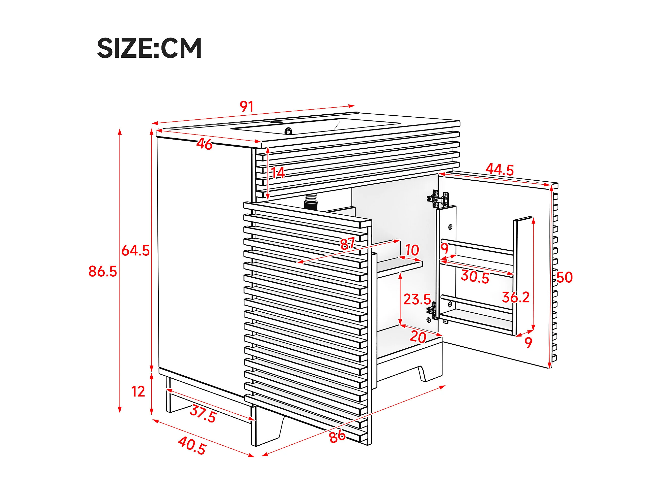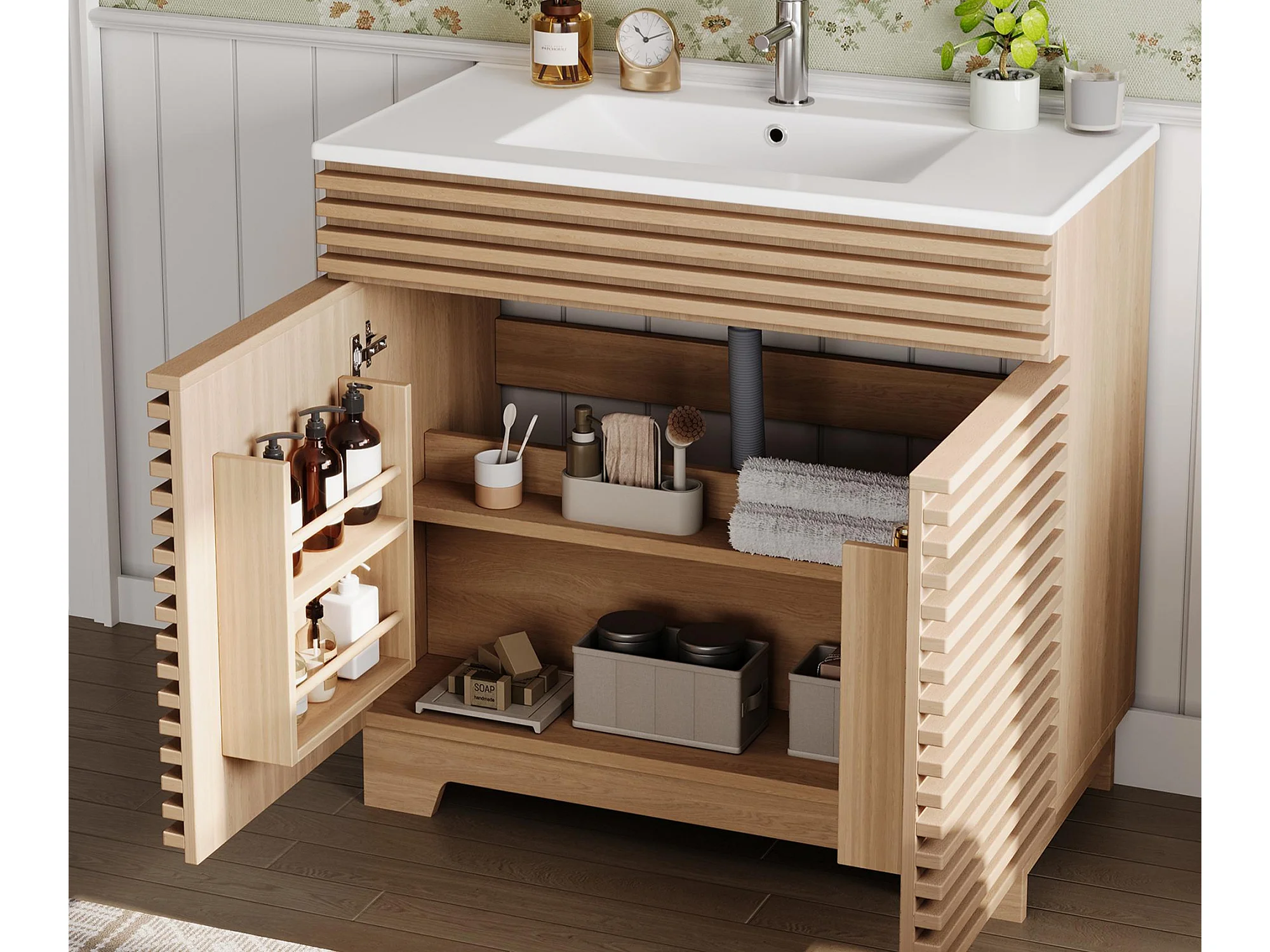Meuble de salle de bain sur pied - Lavabo intégré - 2 portes et étagères intégrées - MDF - Naturel