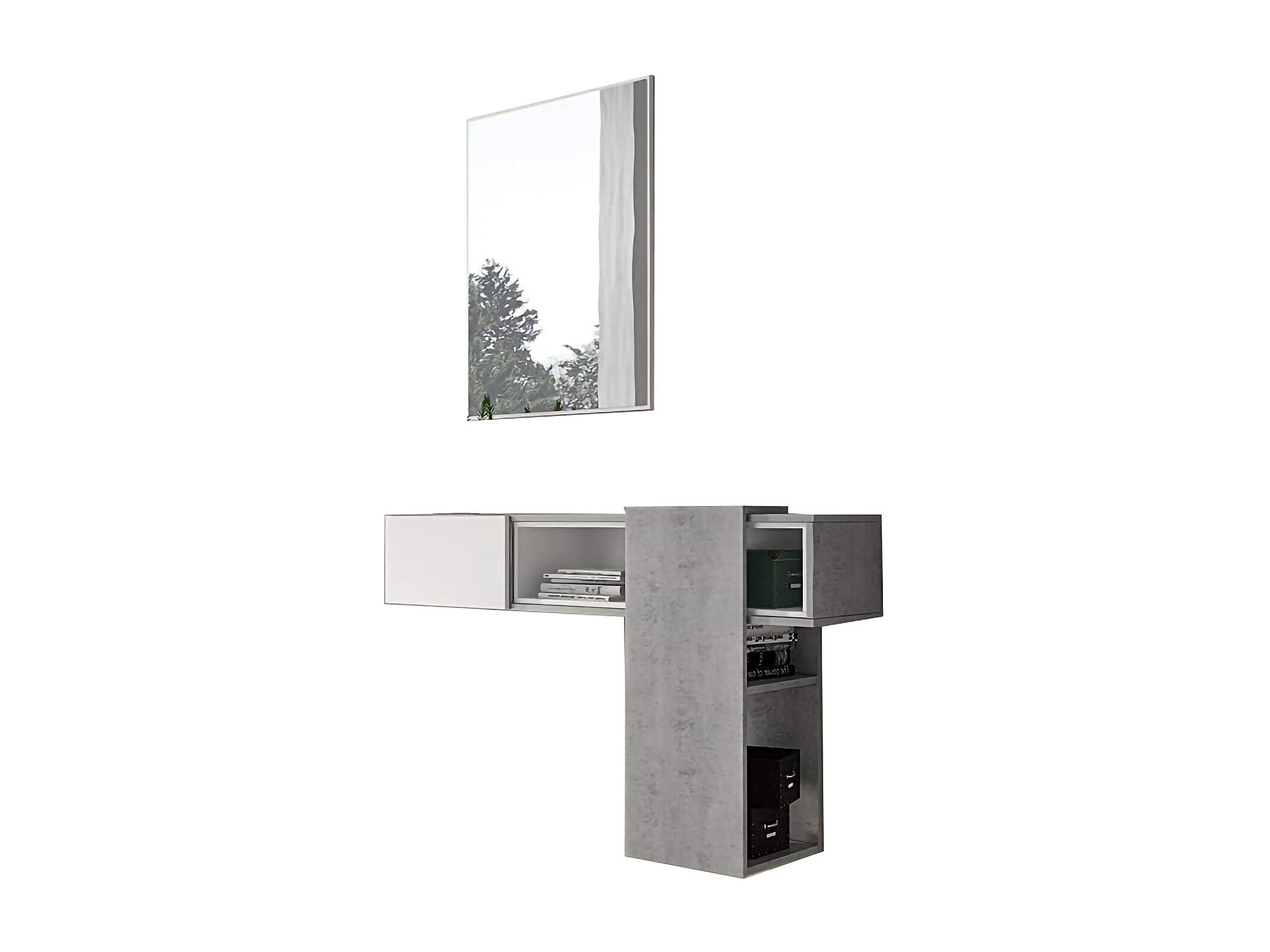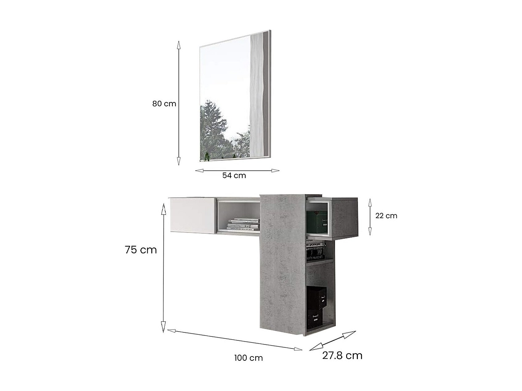 Meuble d'entrée Dpinz, Entrée suspendue, Élément mural avec miroir, Vide poche d'entrée avec tiroir et miroir, 100x27h75 cm, Ciment et Blanc