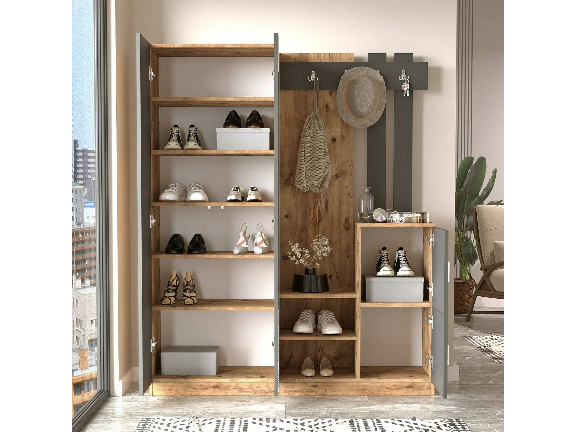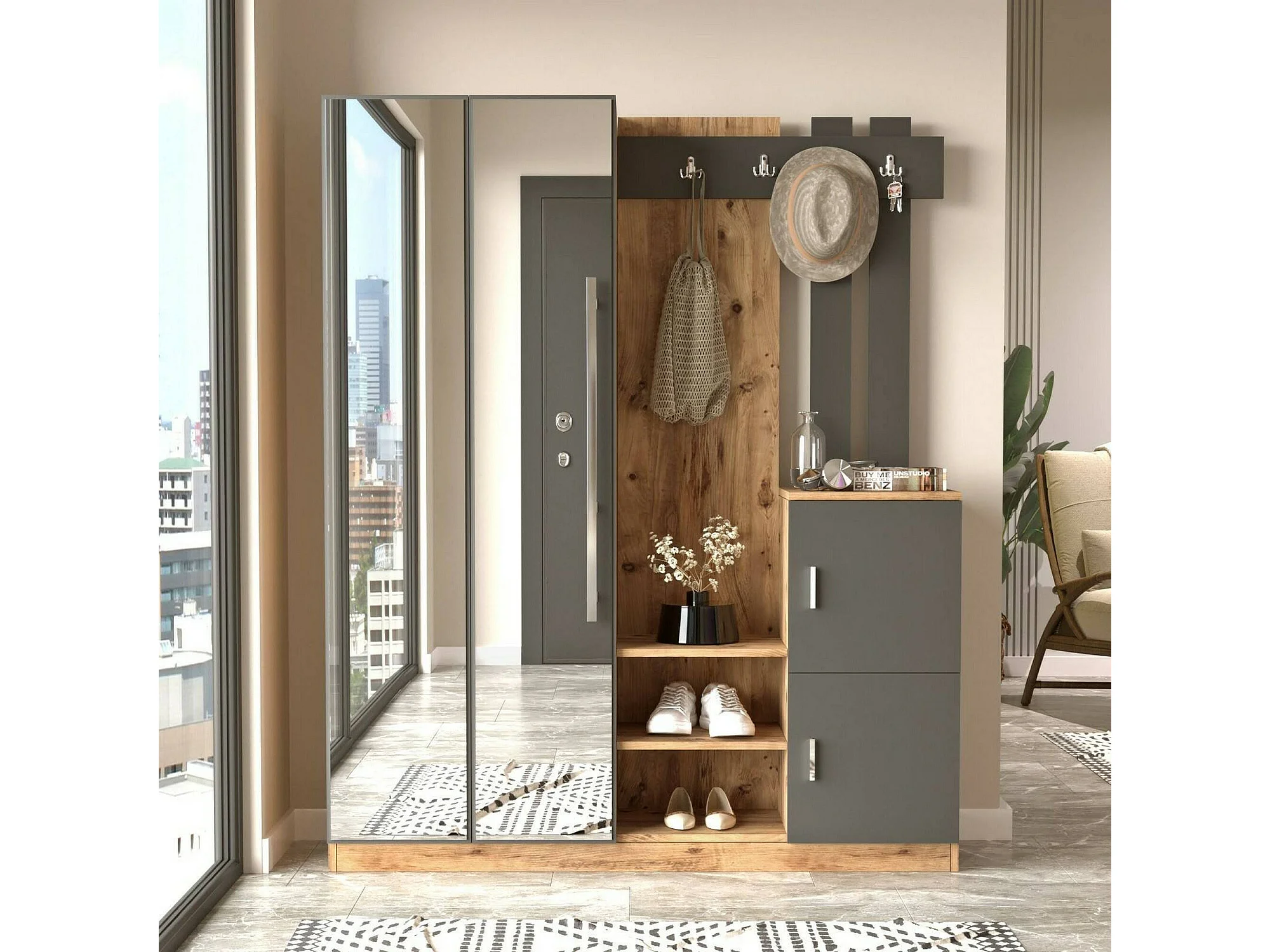 Meuble d'entrée Borealis, Crochet d'entrée, Composition pour l'atrium, Console de rangement multifonction, 147x38h180 cm, Chêne et Anthracite