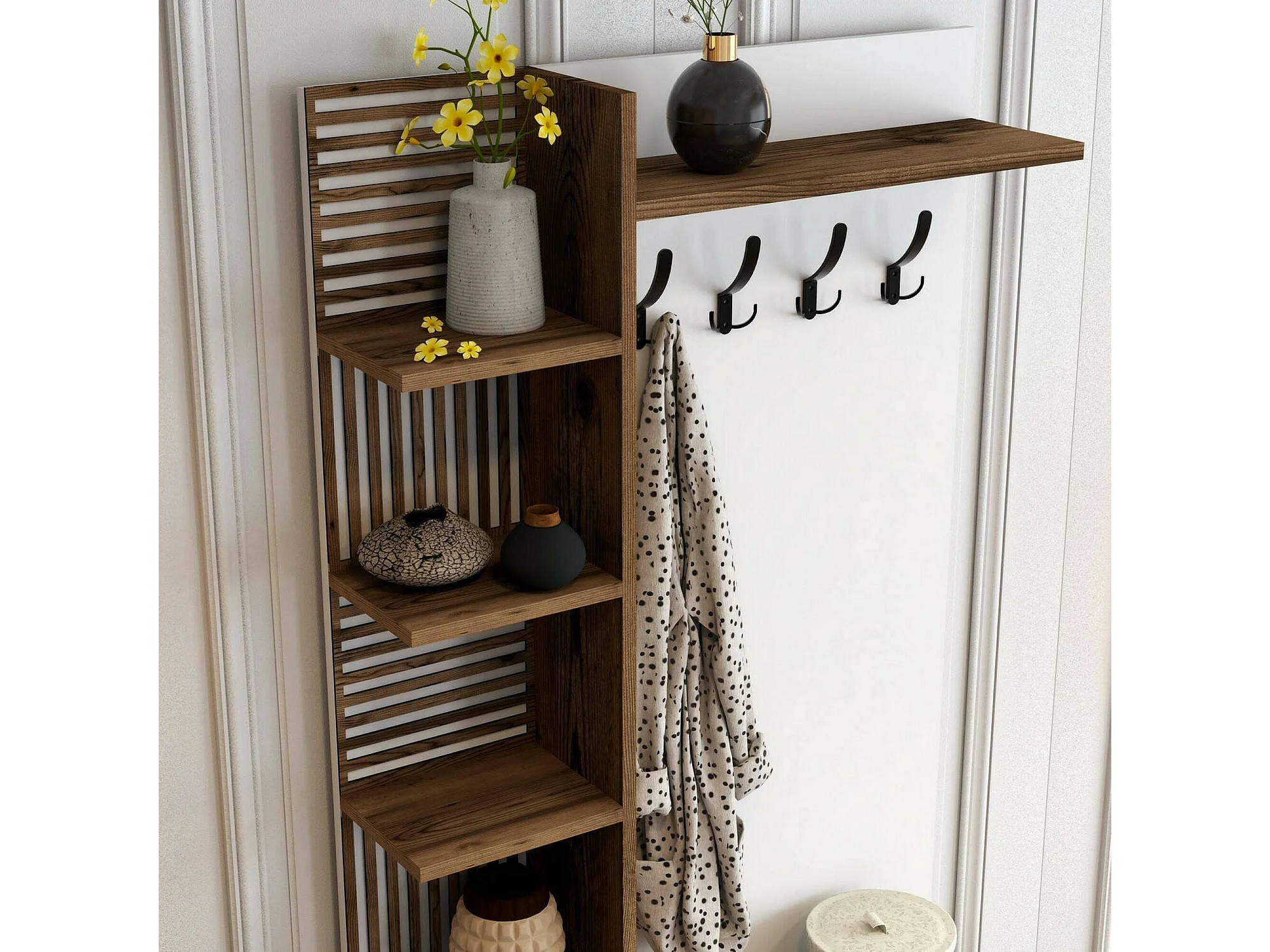 Meuble d'entrée Calista, Crochet d'entrée, Composition pour l'atrium, Console de rangement multifonction, 90x35h200 cm, Noyer et Blanc