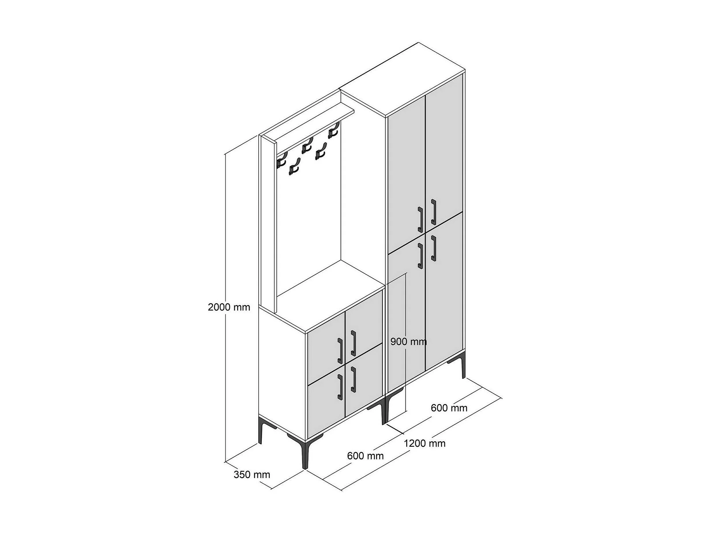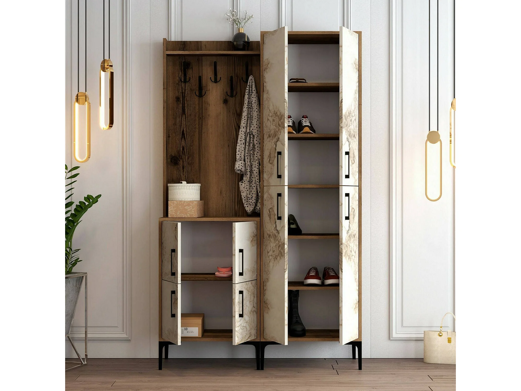 Meuble d'entrée Castor, Crochet d'entrée, Composition pour l'atrium, Console de rangement multifonction, 120x35h200 cm, Noyer et Marbre Blanc