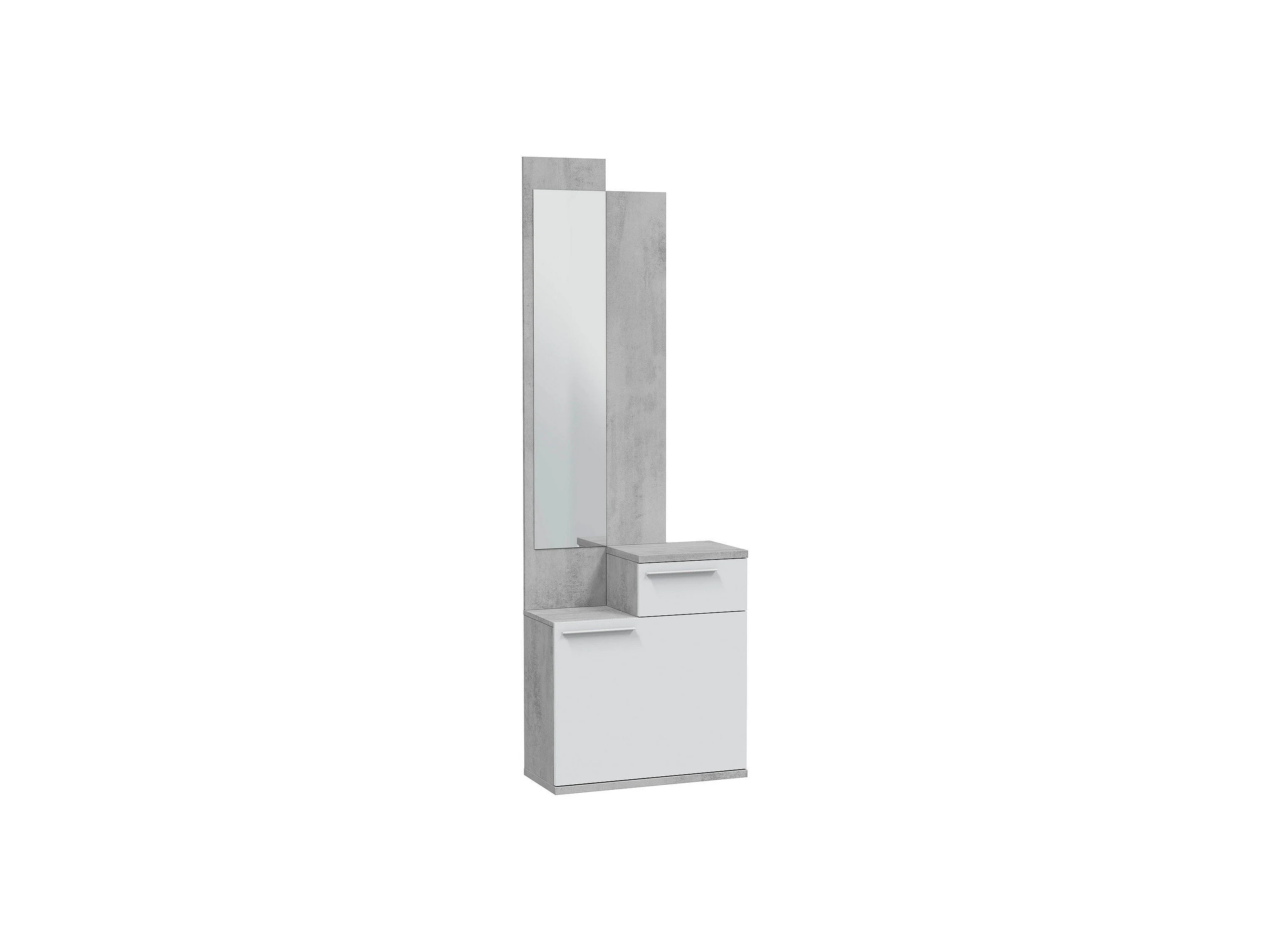 Meuble d'entrée Dner, Étagère à chaussures multifonctionnelle avec miroir, armoire 1 porte et 1 tiroir, 61x28h185 cm, Ciment et Blanc Brillant