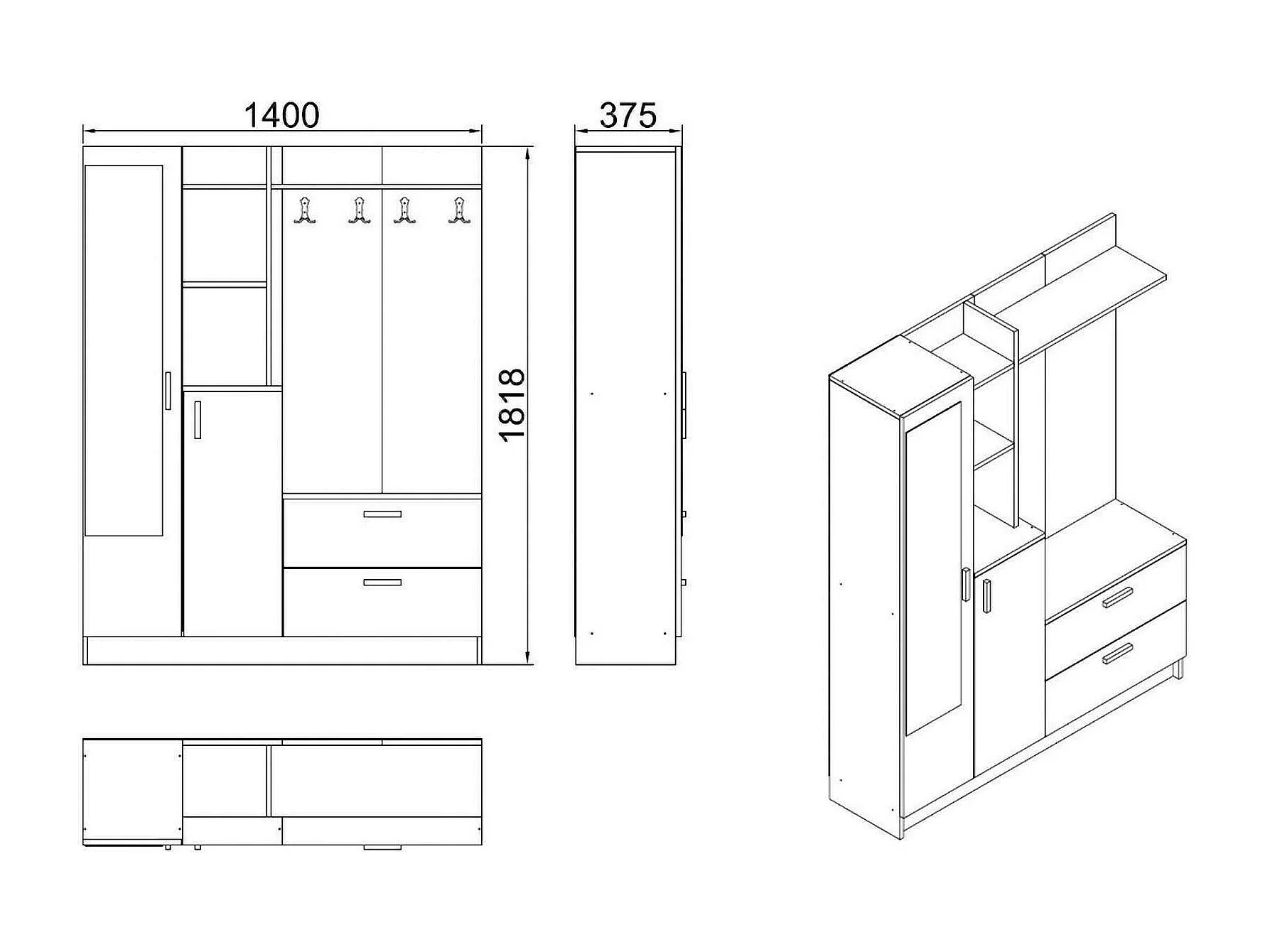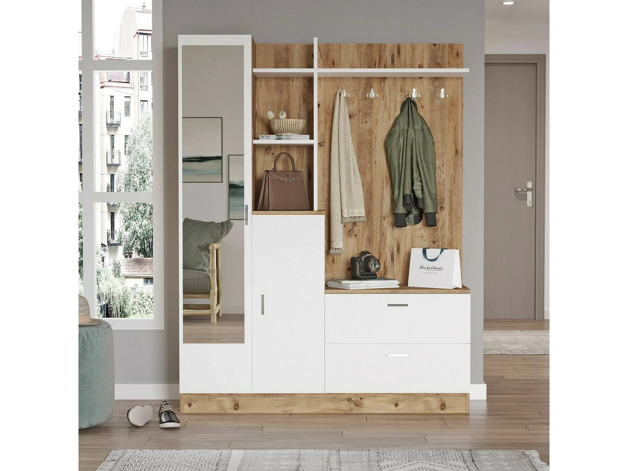 Meuble d'entrée Homam, Crochet d'entrée, Composition pour l'atrium, Console de rangement multifonction, 140x37h182 cm, Chêne et Blanc