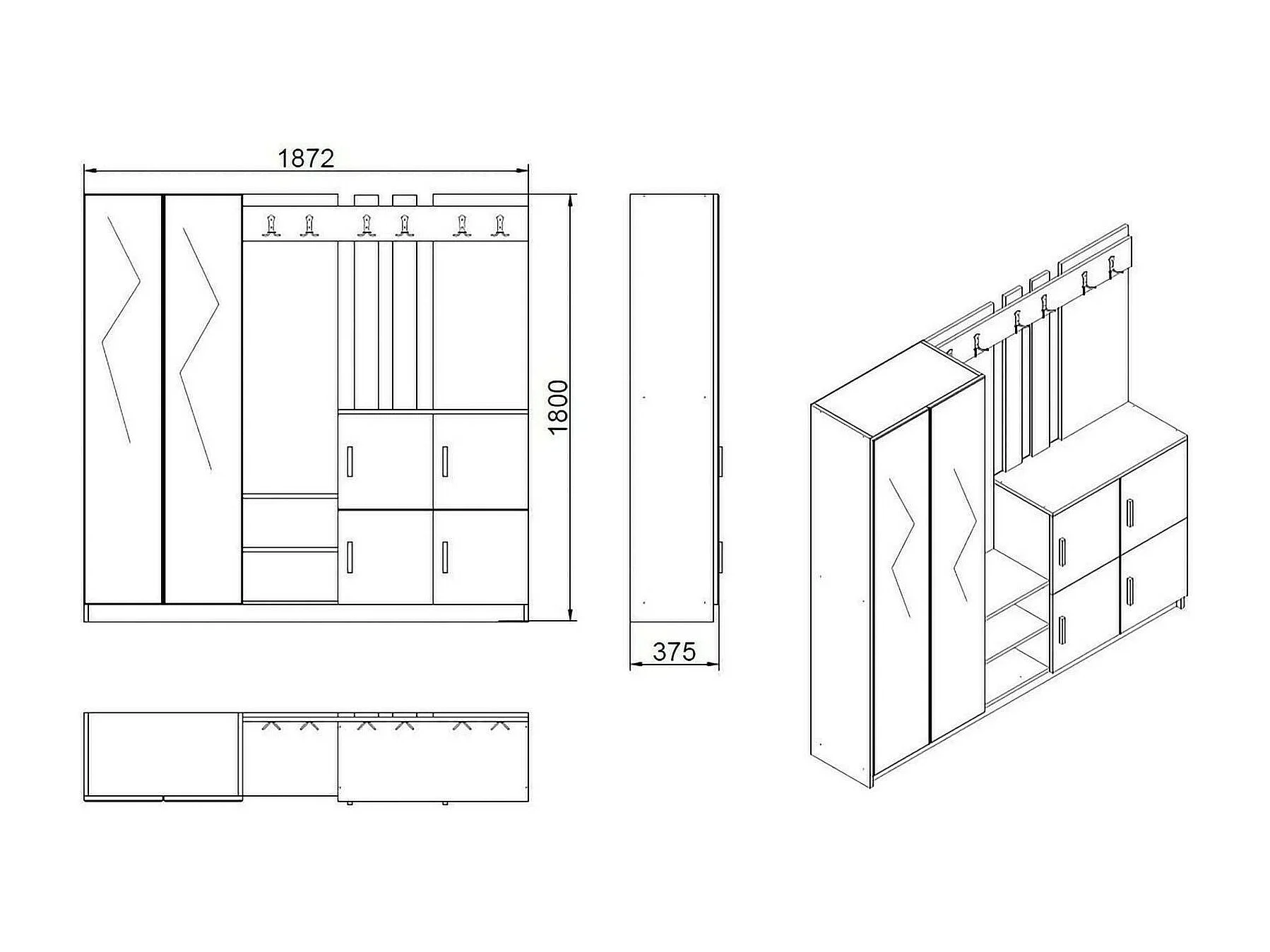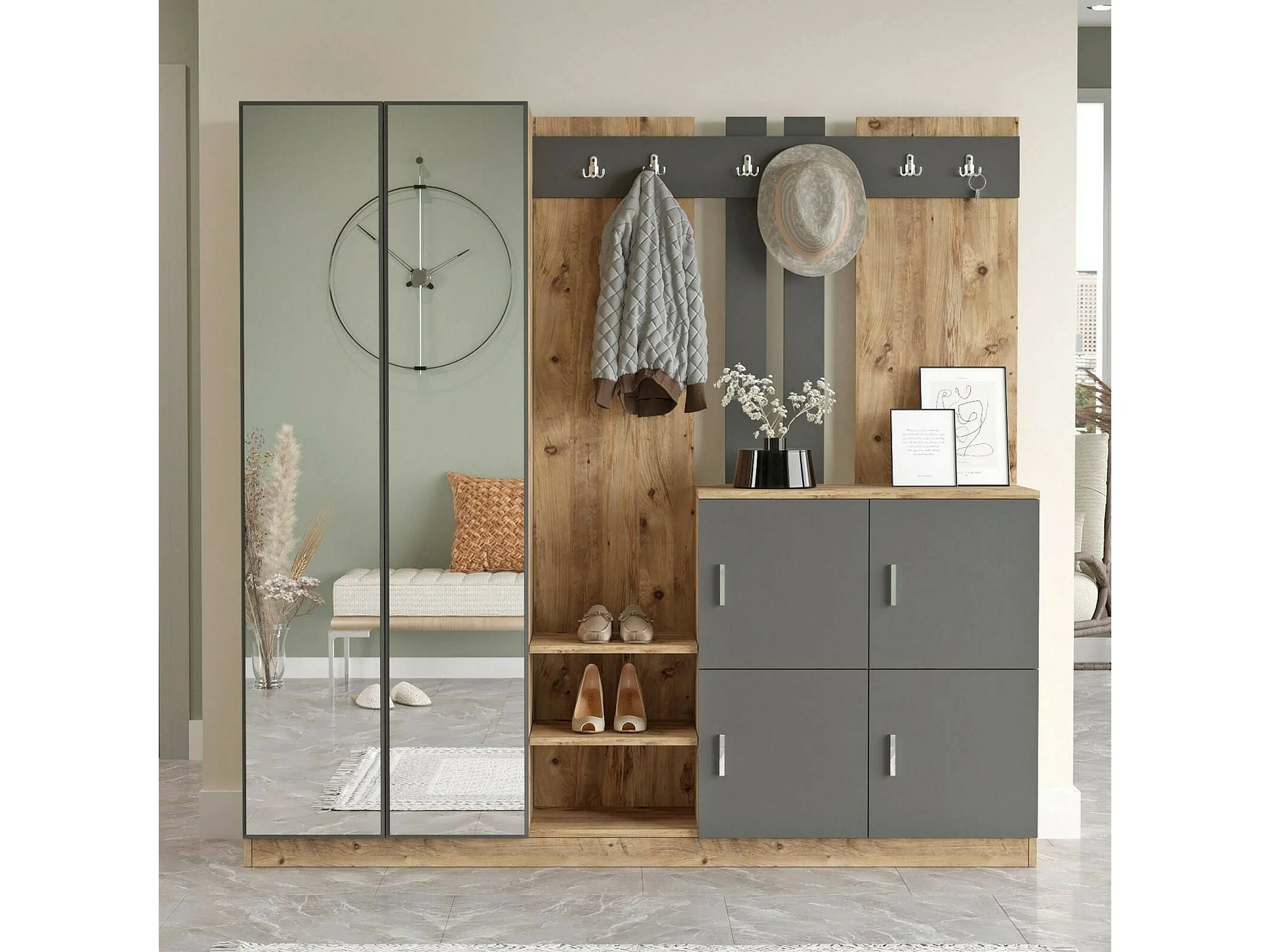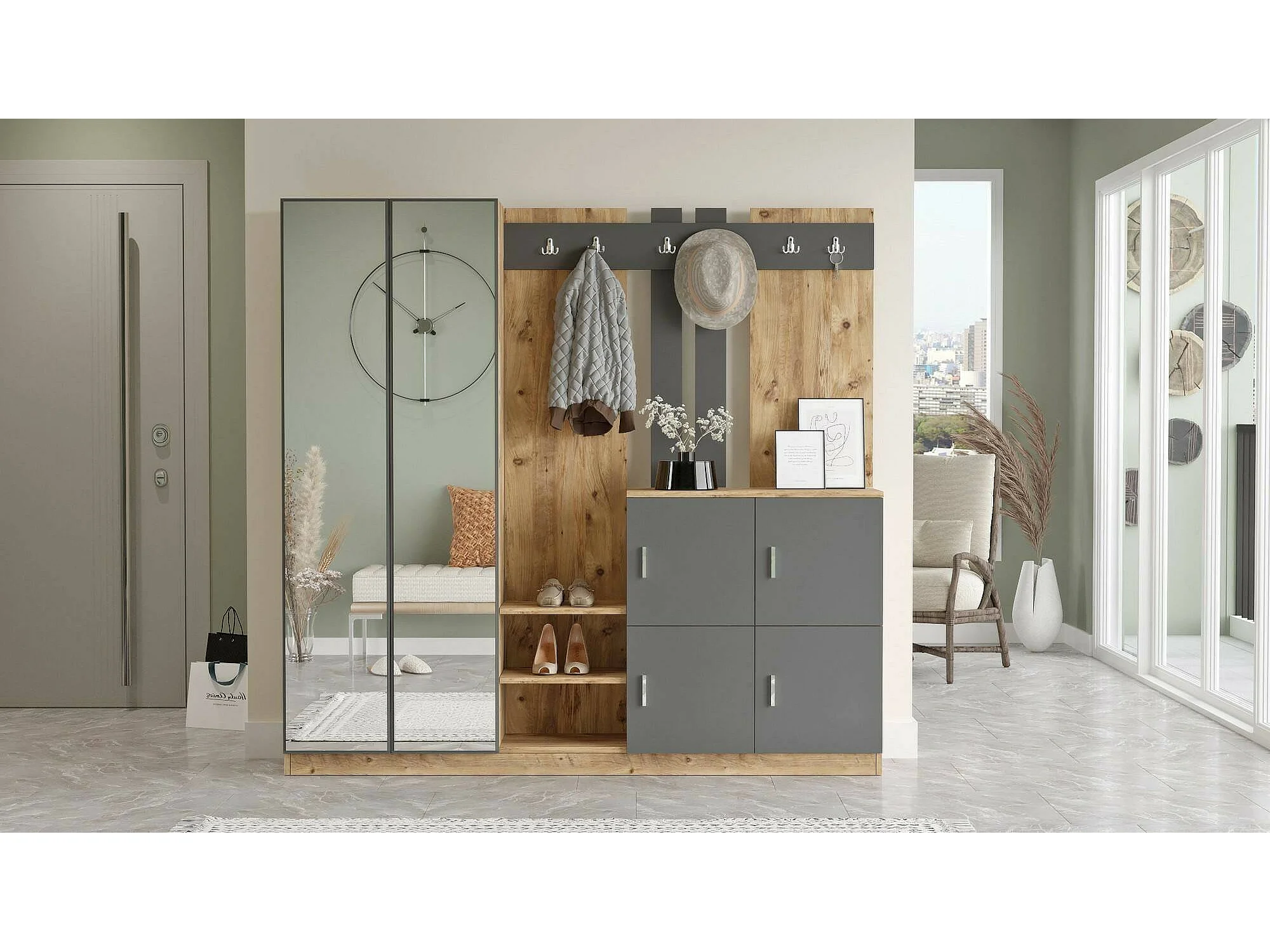 Meuble d'entrée Media, Crochet d'entrée, Composition pour l'atrium, Console de rangement multifonction, 187x38h180 cm, Chêne et Anthracite