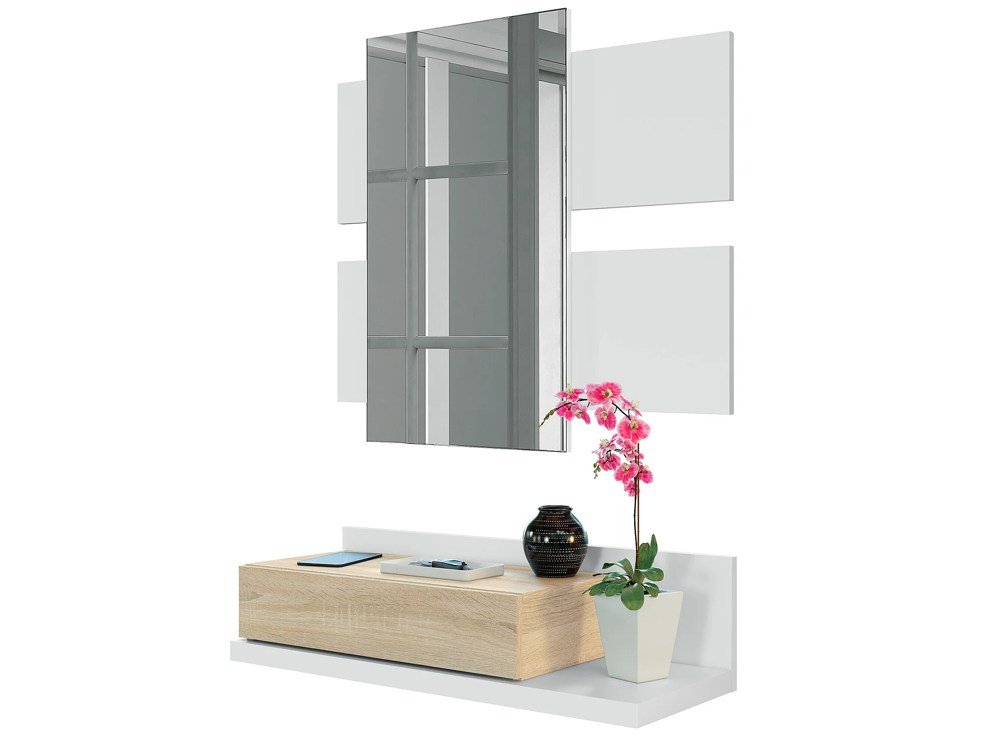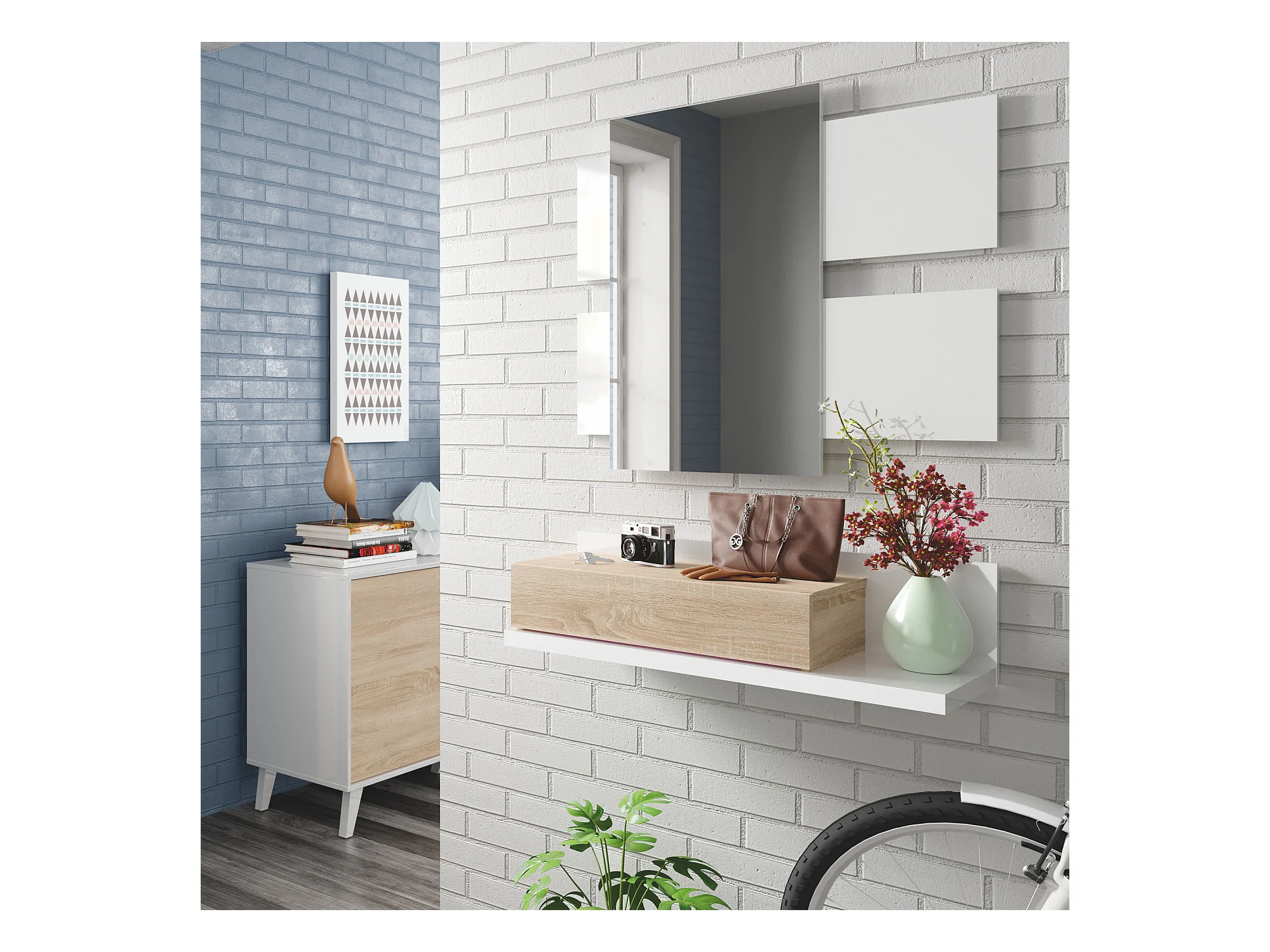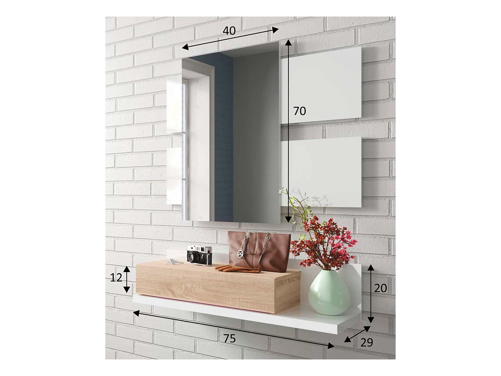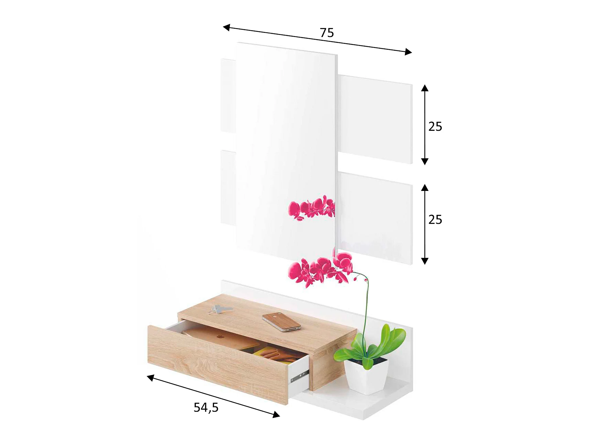 Meuble d'entrée Telma avec 1 tiroir et Miroir Blanc/Chêne, 75 cm Largeur