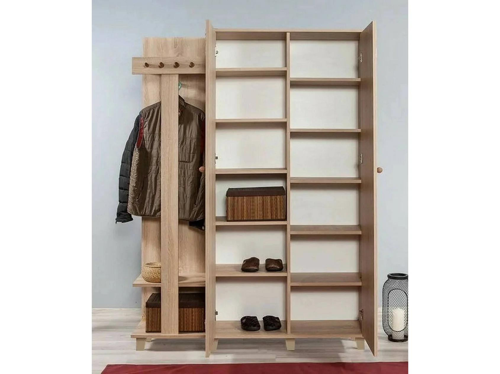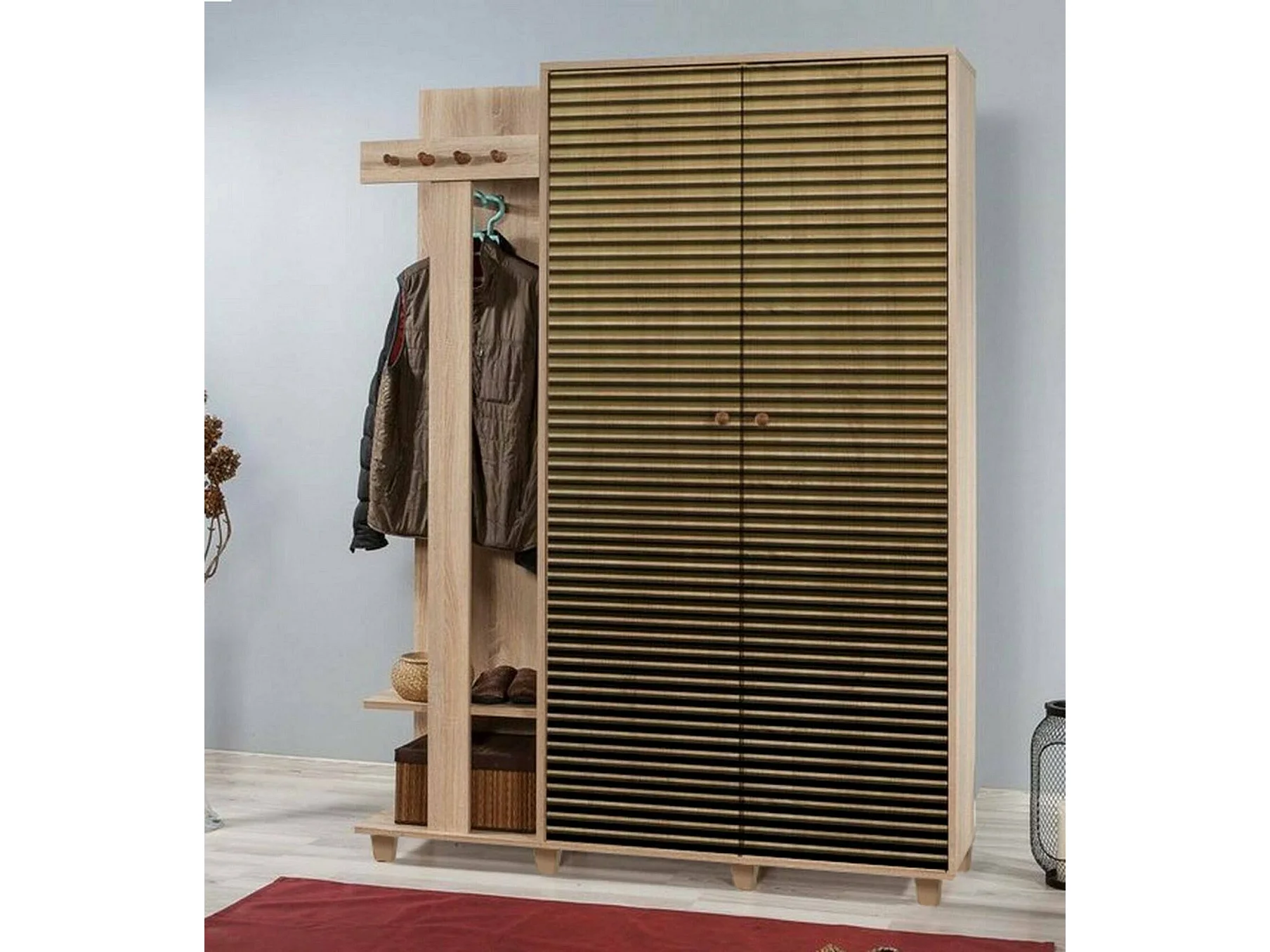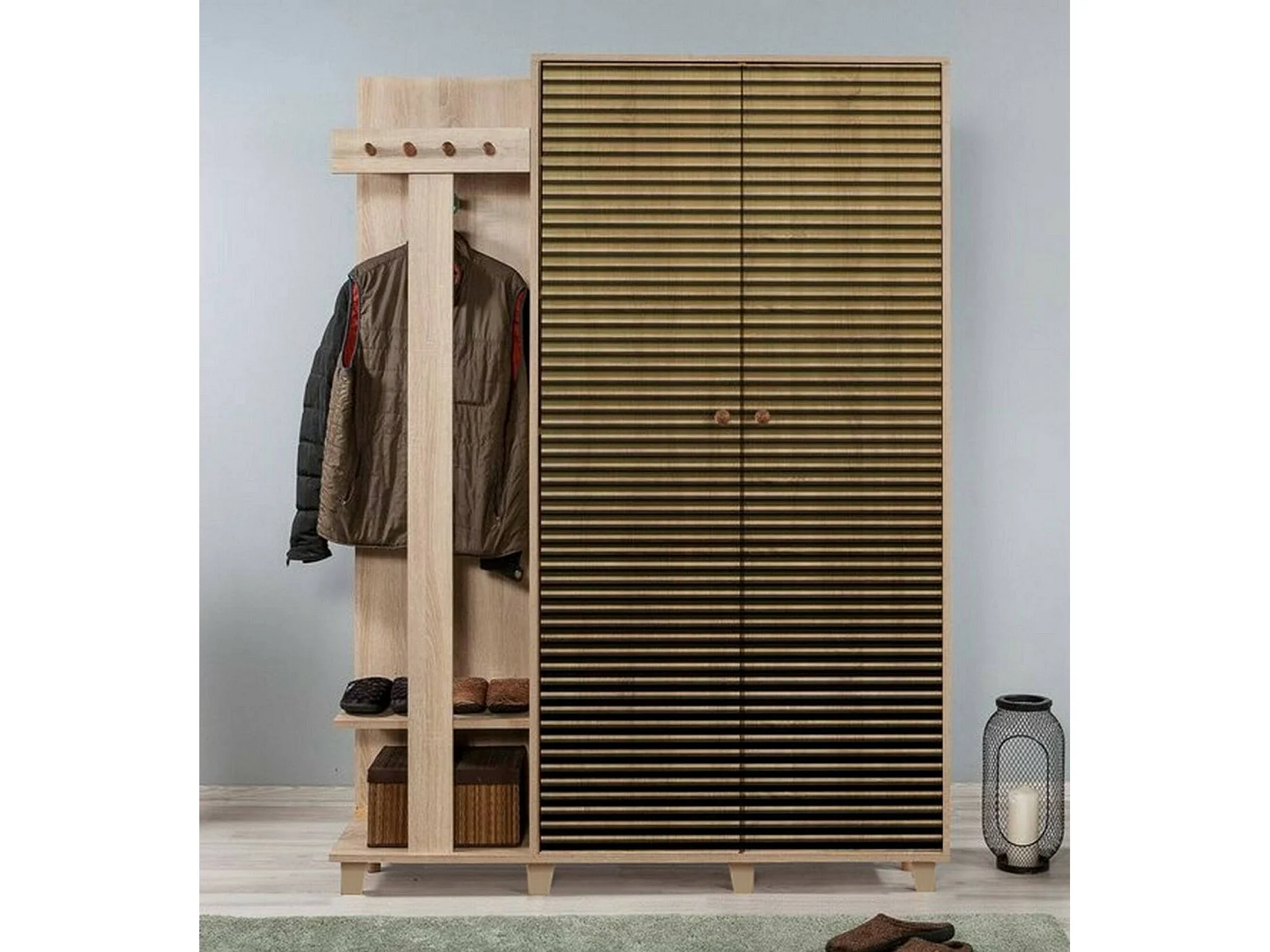 Meuble d'entrée Terpsi, Crochet d'entrée, Composition pour l'atrium, Console de rangement multifonction, 135x36h194 cm, Chêne