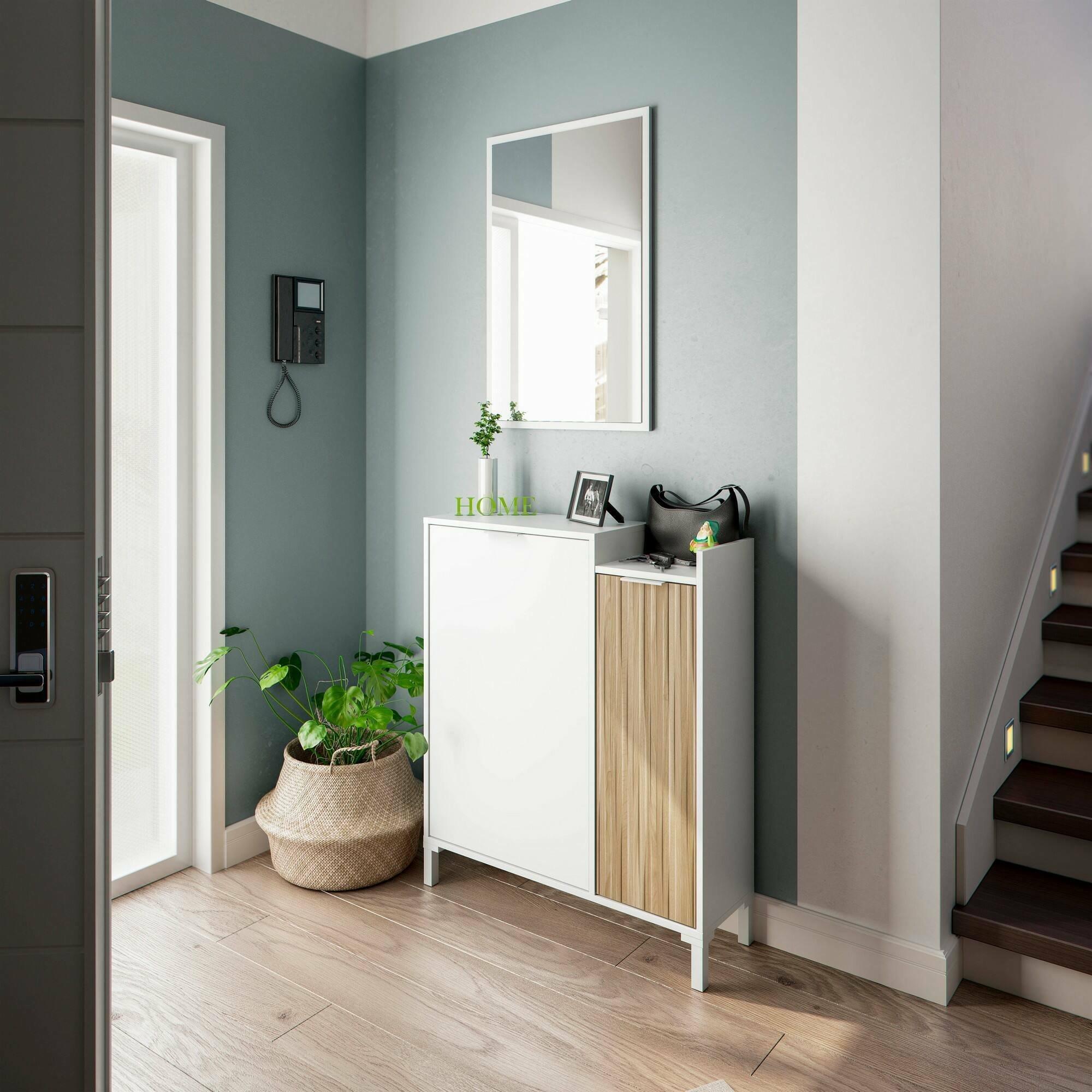 Meuble d'entrée Dodd, Entrée 2 portes, Armoire avec miroir, Rangement multifonctionnel, 77x24h91 cm, Blanc et Chêne