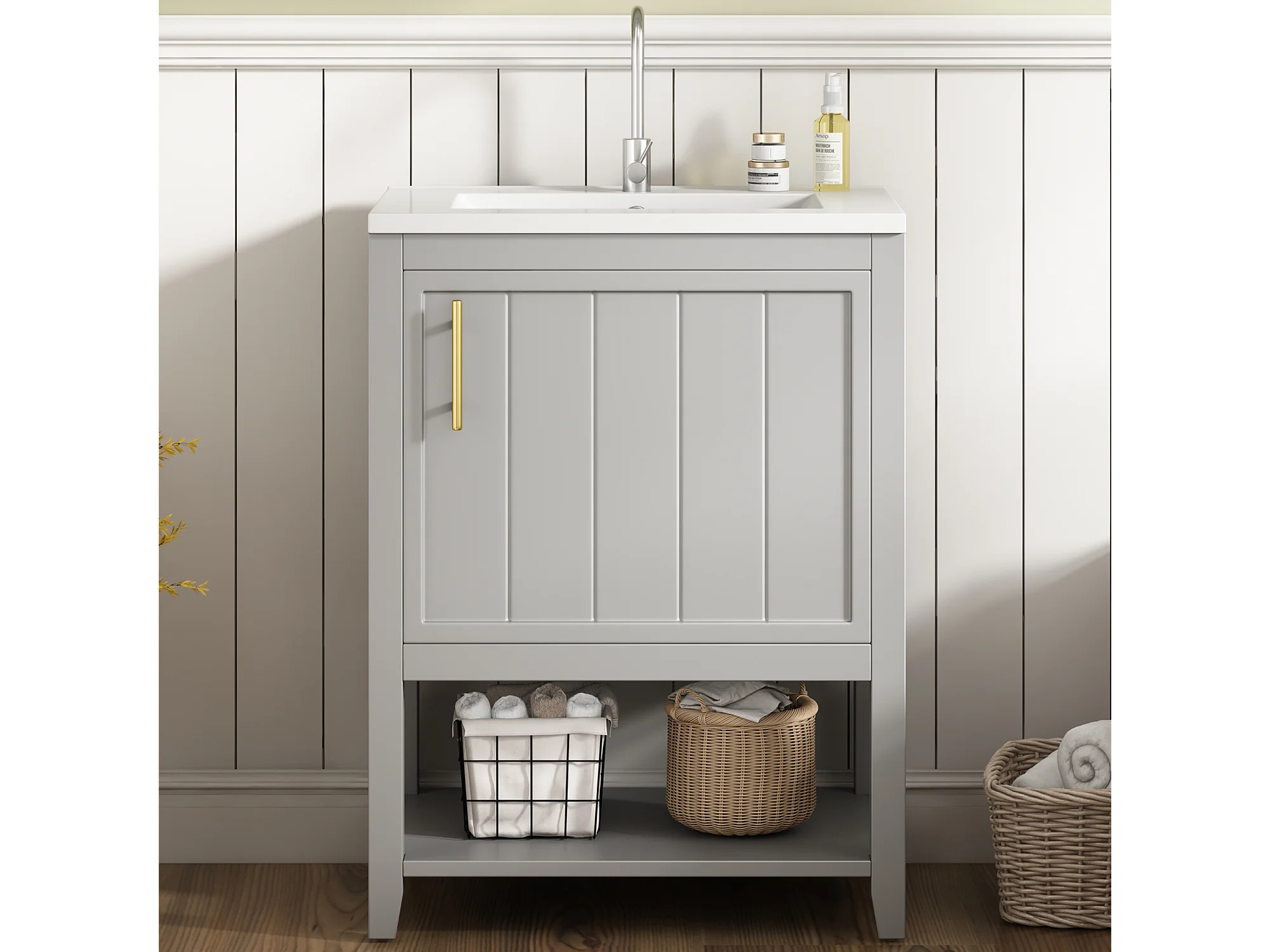 Meuble simple vasque posé au sol - 76 x 46 x 87 cm - avec vasque céramique - avec rangements - Céramique + MDF - gris (Robinet non inclus)