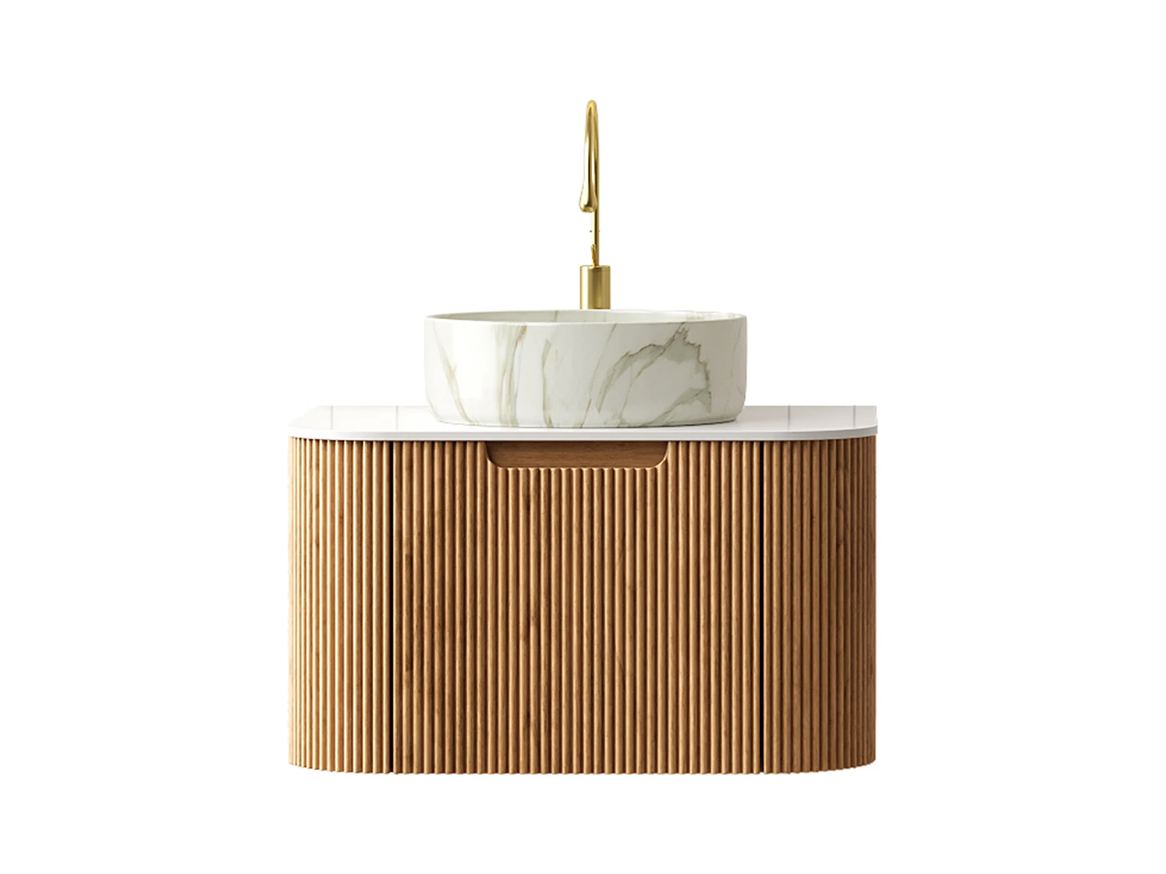 Meuble-lavabo suspendu avec bac rectangulaire en acrylique, design moderne, stratifié bois naturel et blanc, étagère à rayures (75x46x20.7 cm)