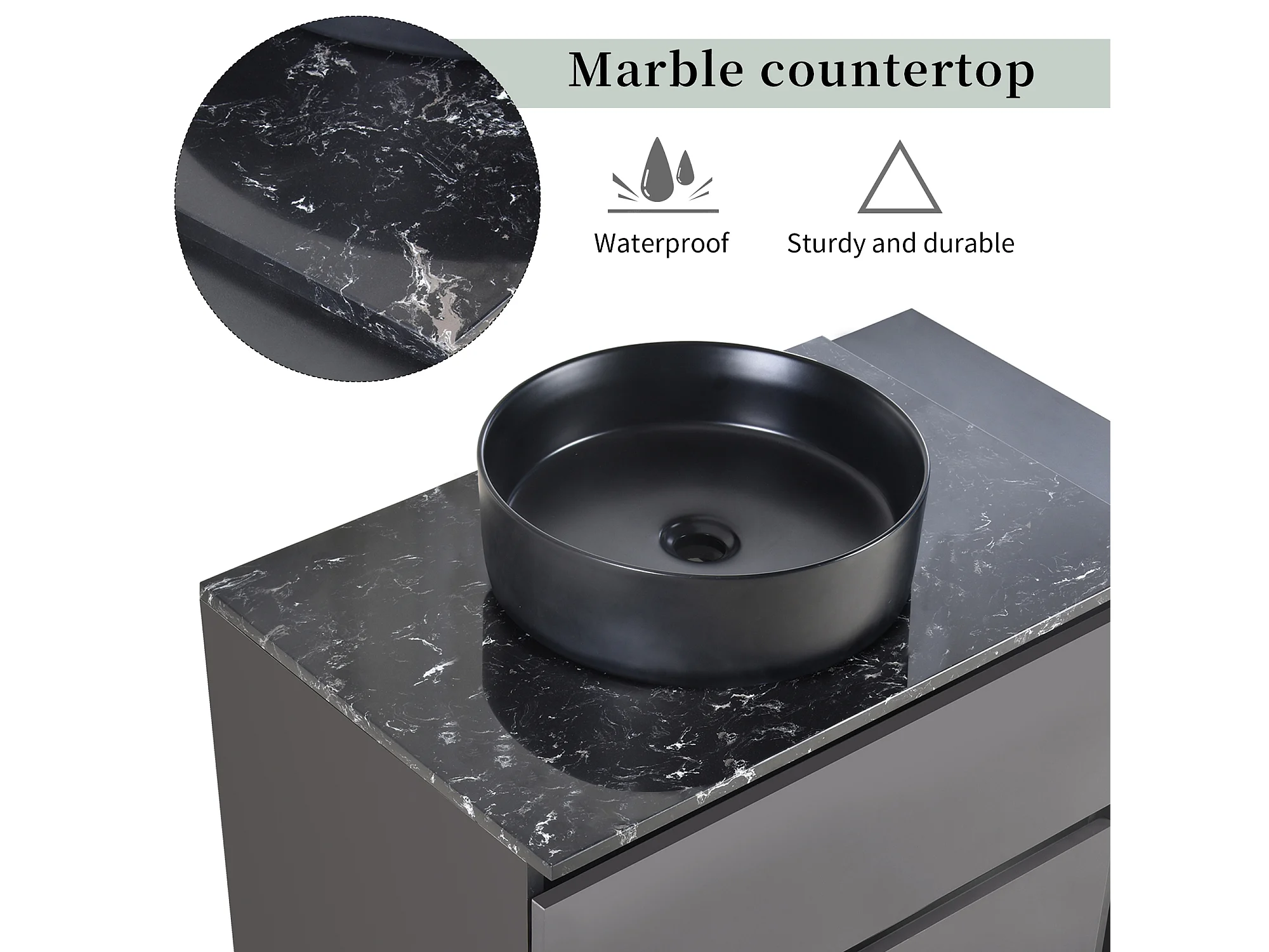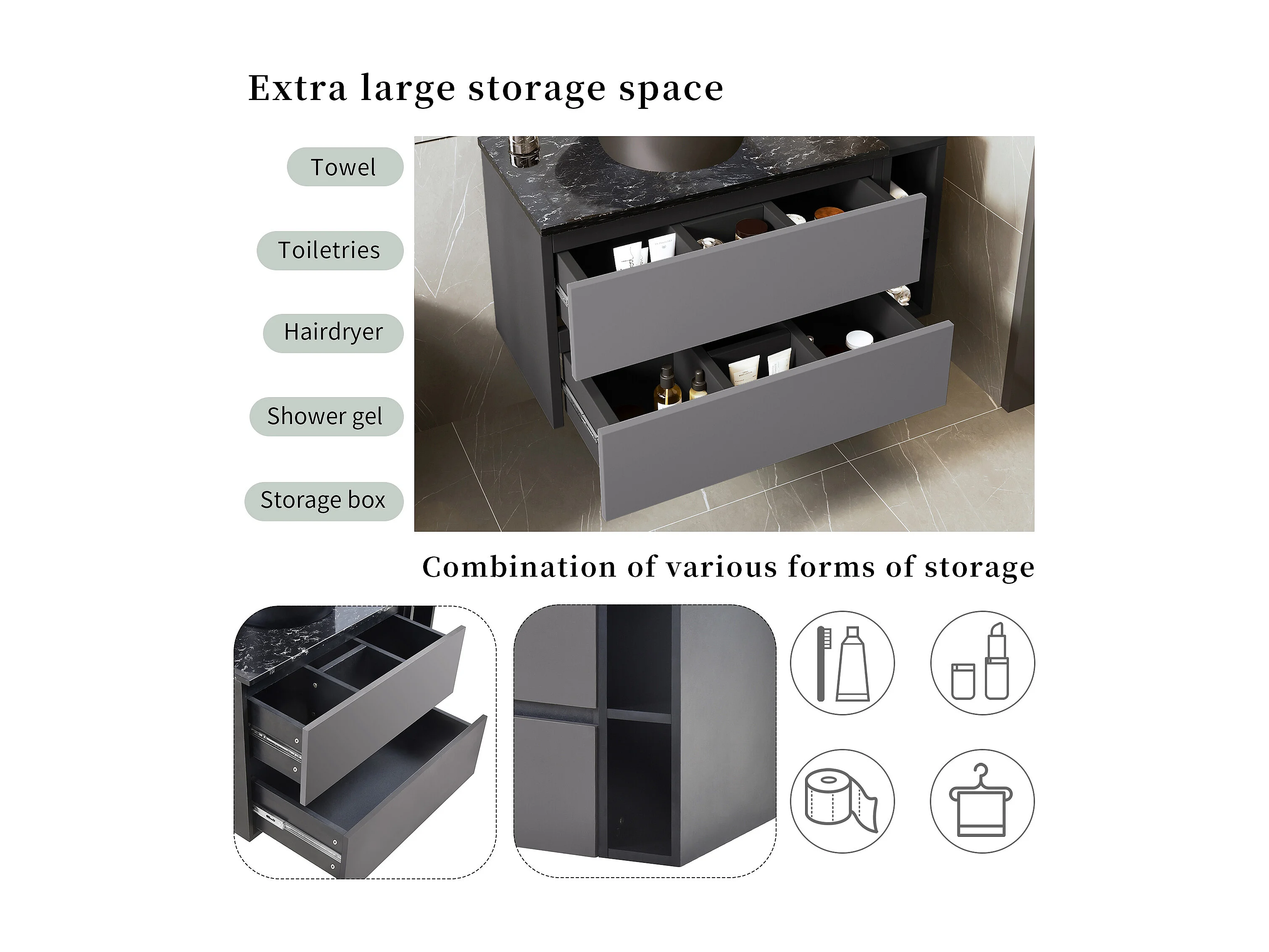 Meuble lave-main suspendu avec 2 tiroirs et étagères - lavabo encastré - 80 x 44 x 48.5 cm - bois MDF - gris + noir