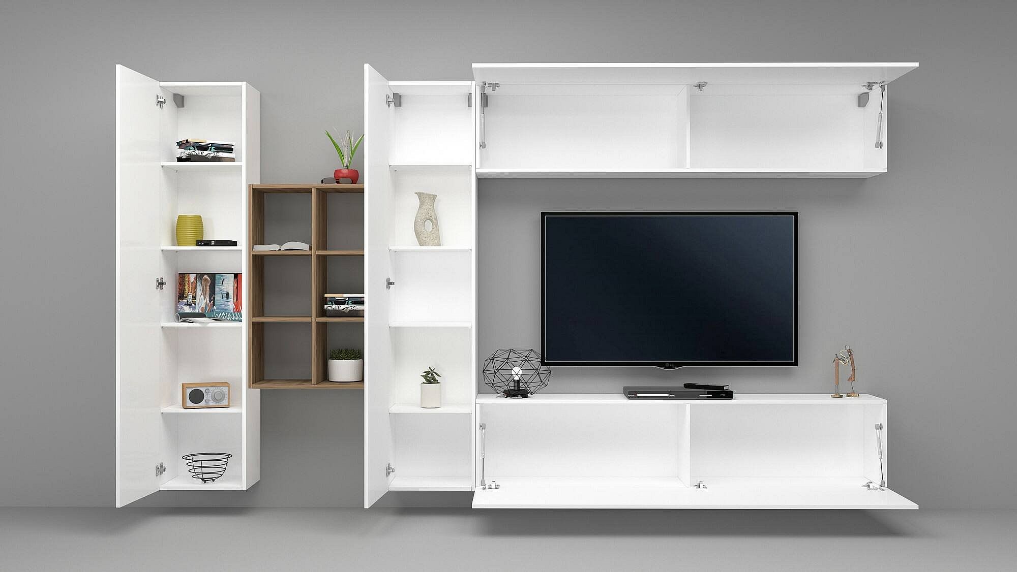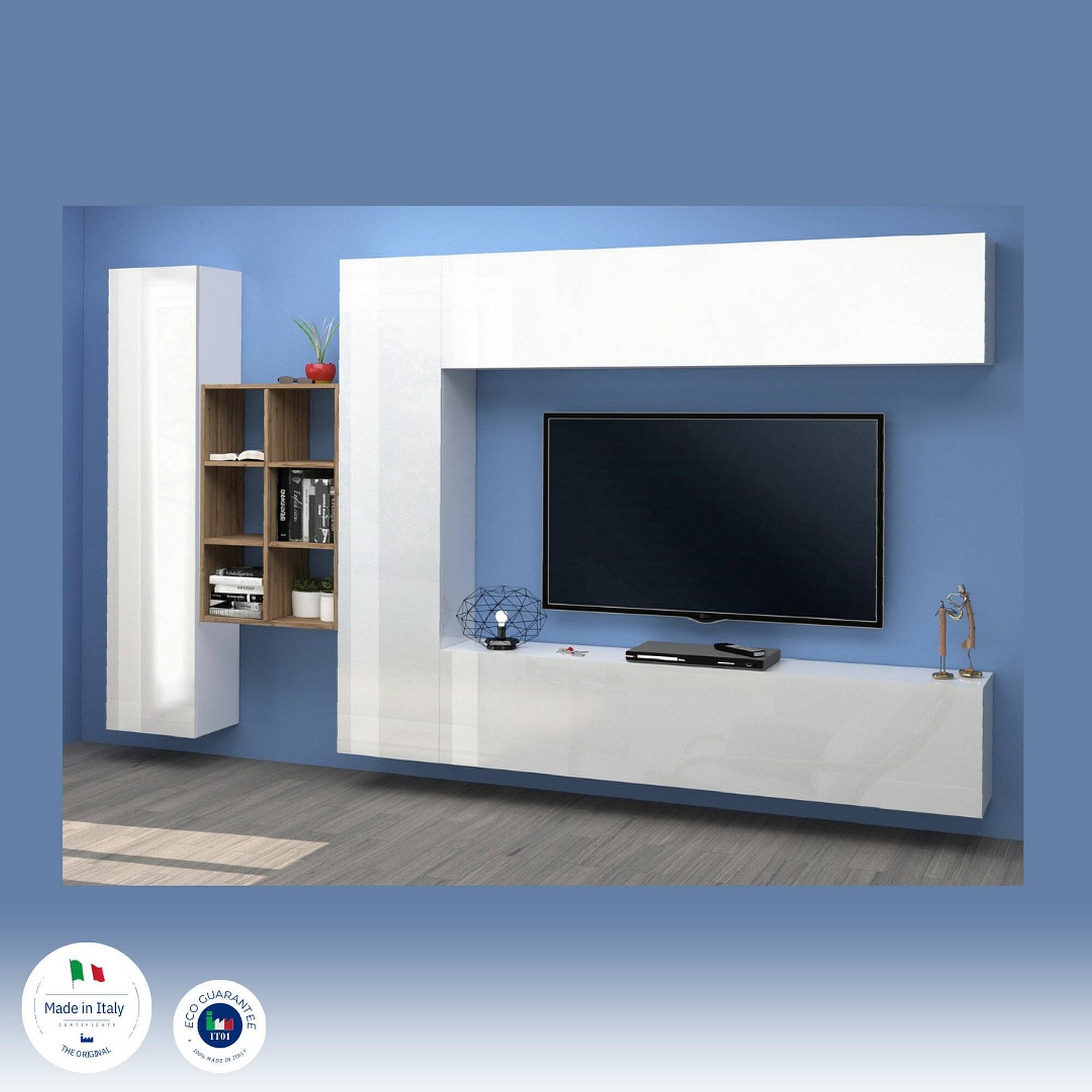Système mural Clemente, meuble TV 5 portes, Meuble de salon polyvalent, 100% Made in Italy, 340x30h180 cm, Blanc brillant