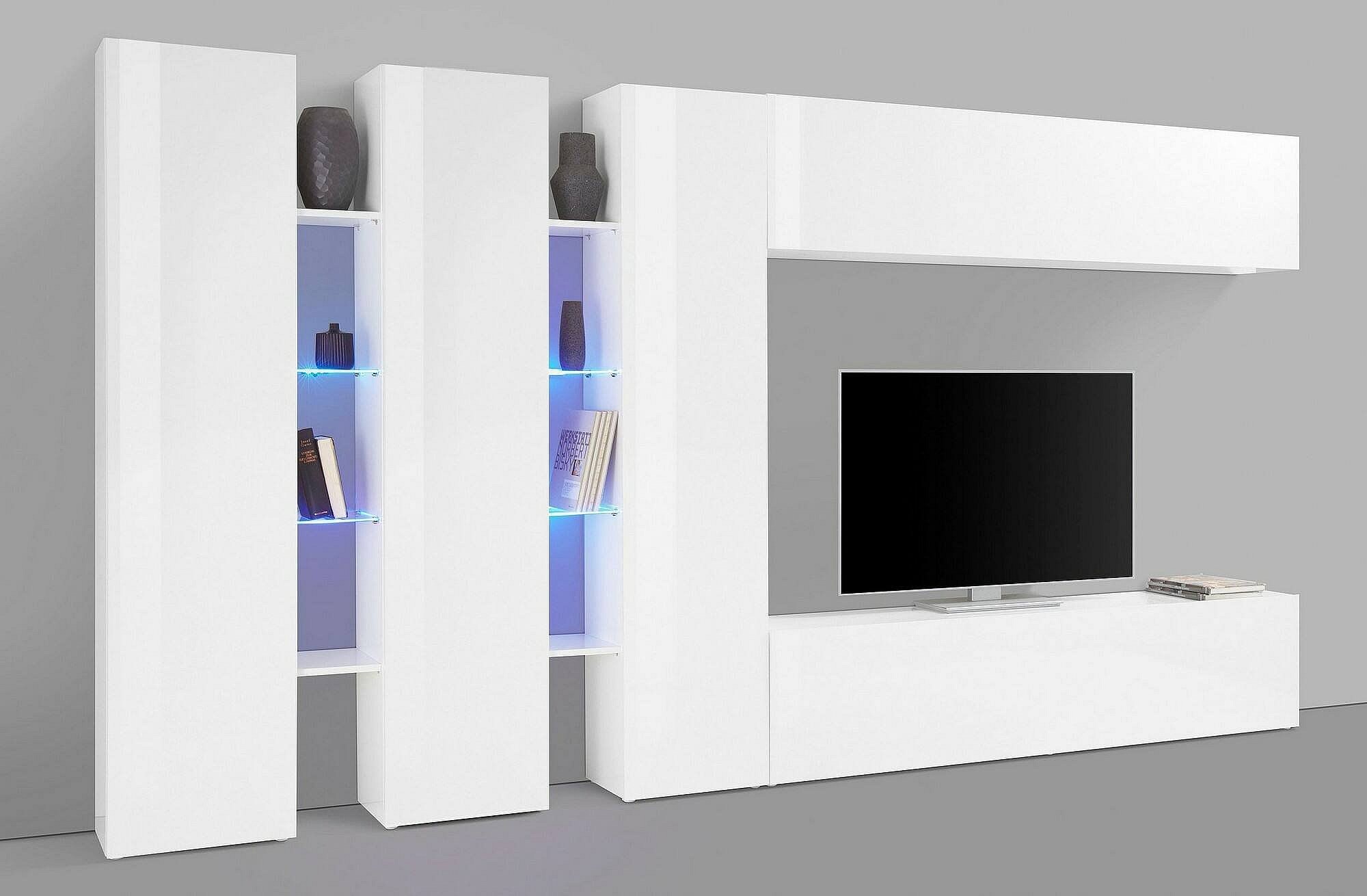 MEUBLE MURAL - Ensemble de salon Meuble TV avec 5 portes, Meuble de salon polyvalent, 100% Made in Italy, cm 340x30h180, Blanc brillant.