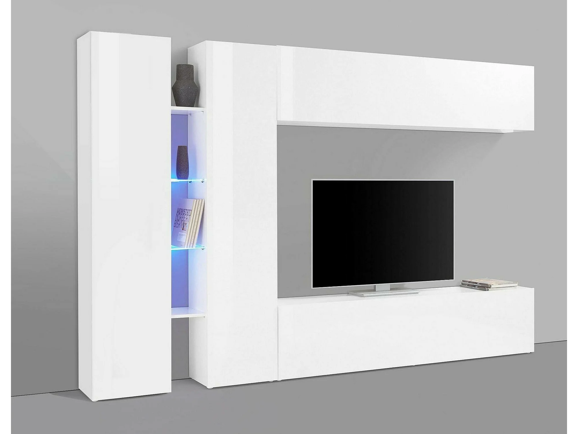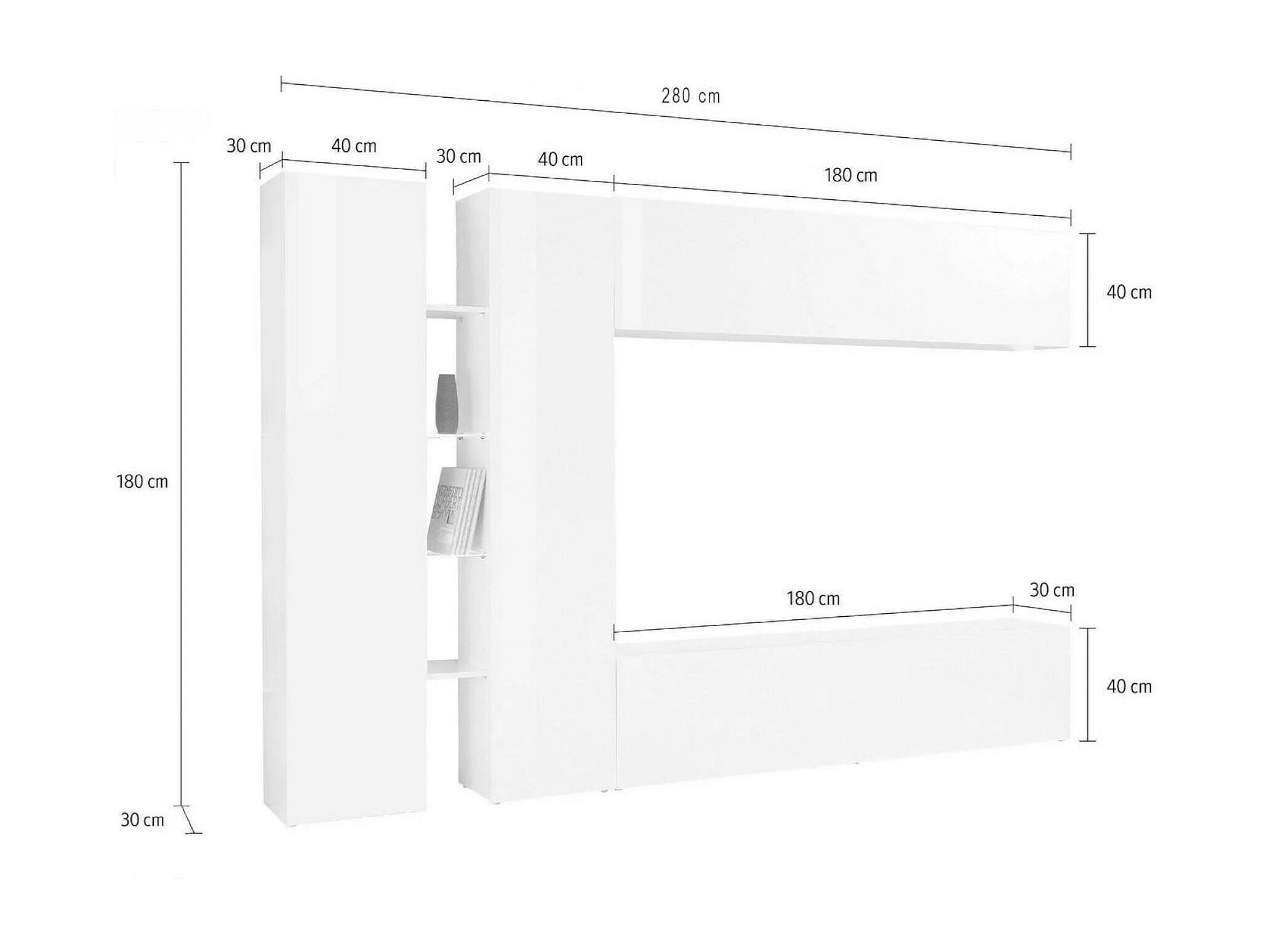 Ensemble mural Dboudr, meuble TV 4 portes, meuble de salon polyvalent, 100% Made in Italy, 280x30x180 cm, Blanc brillant