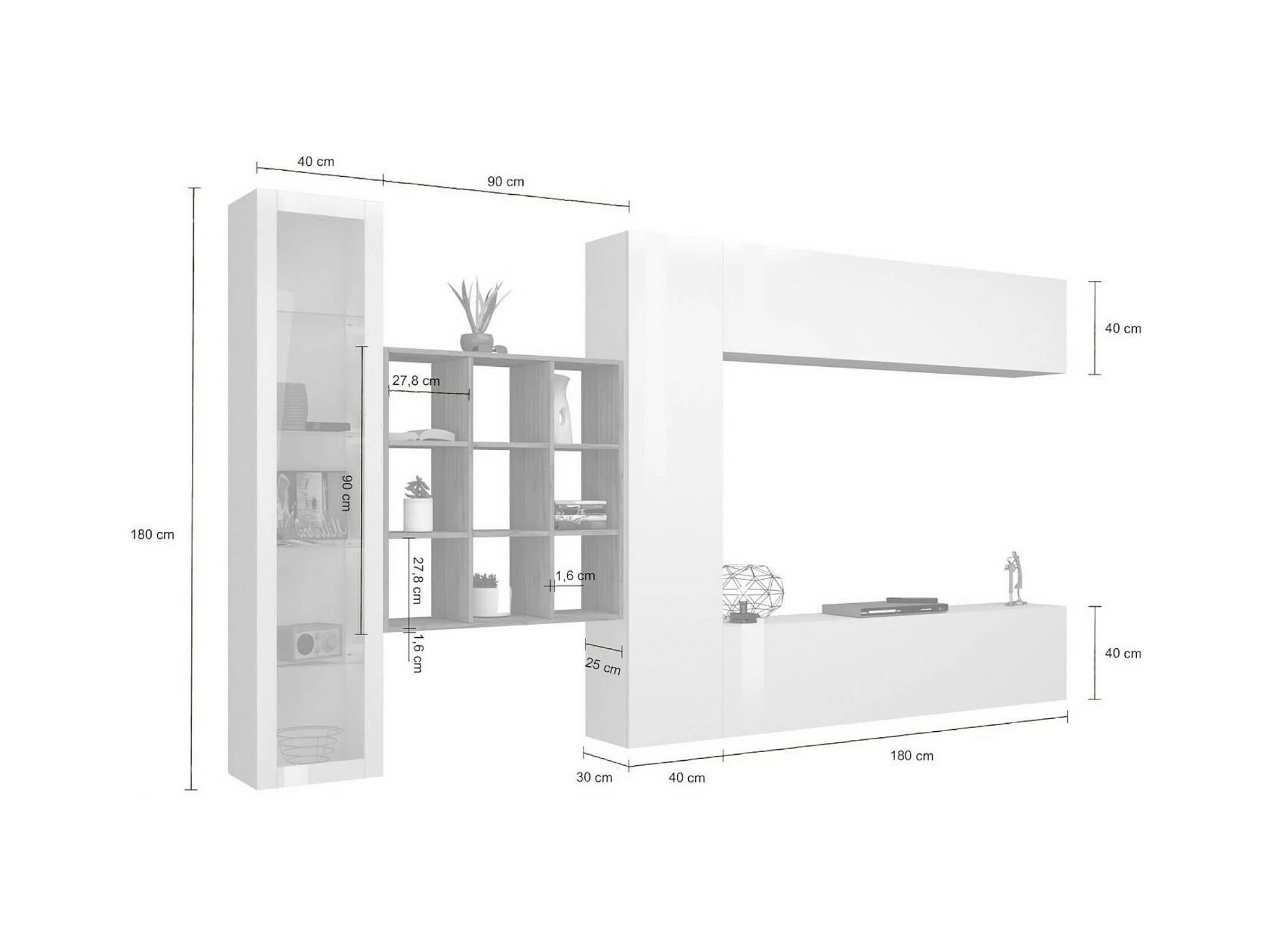Élément mural Dcolle, meuble TV 4 portes, Meuble de salon polyvalent avec vitrine et lumière LED, 100% Made in Italy, 310x30h180 cm, Blanc brillant et érable