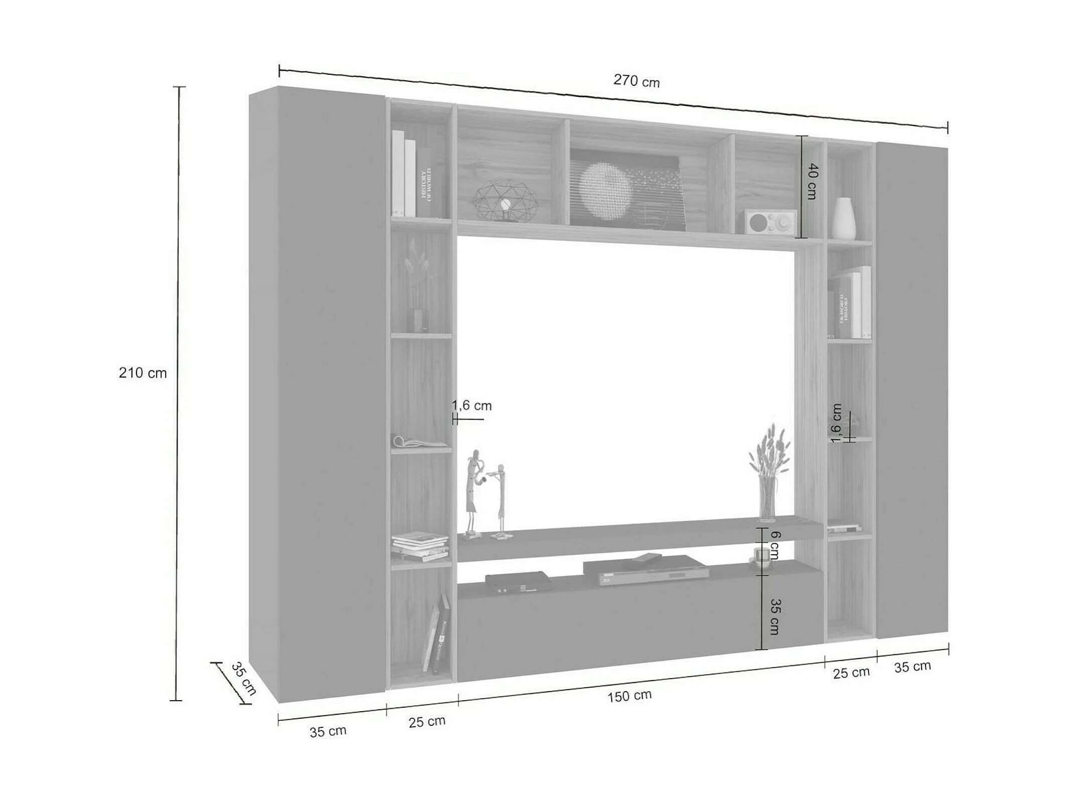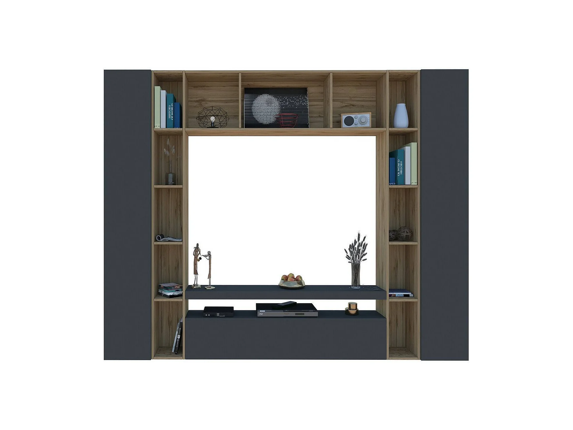 Système mural Ddragon, meuble TV 3 portes, Meuble de salon polyvalent, 100% Made in Italy, 270x35h210 cm, Anthracite et Chêne