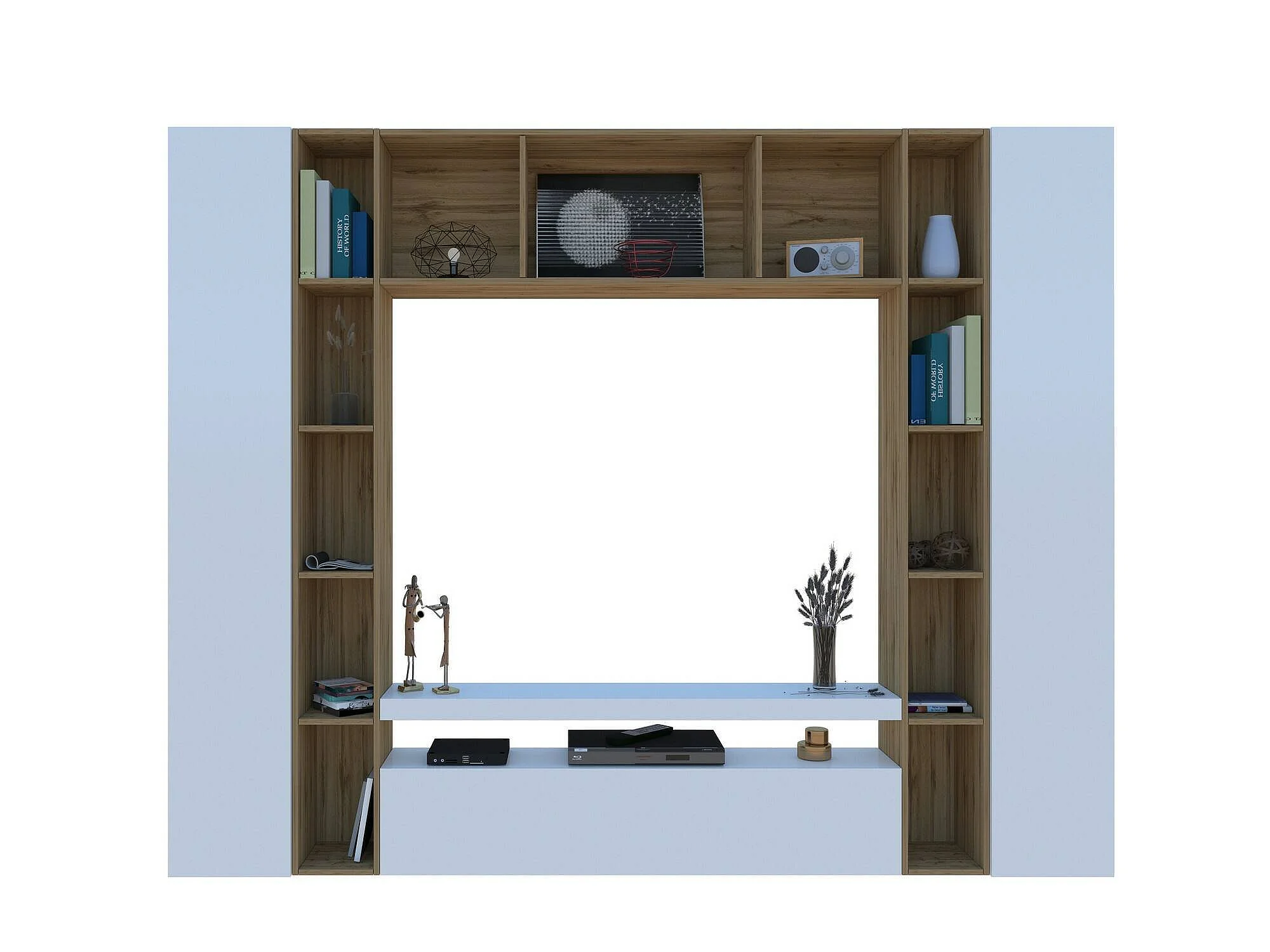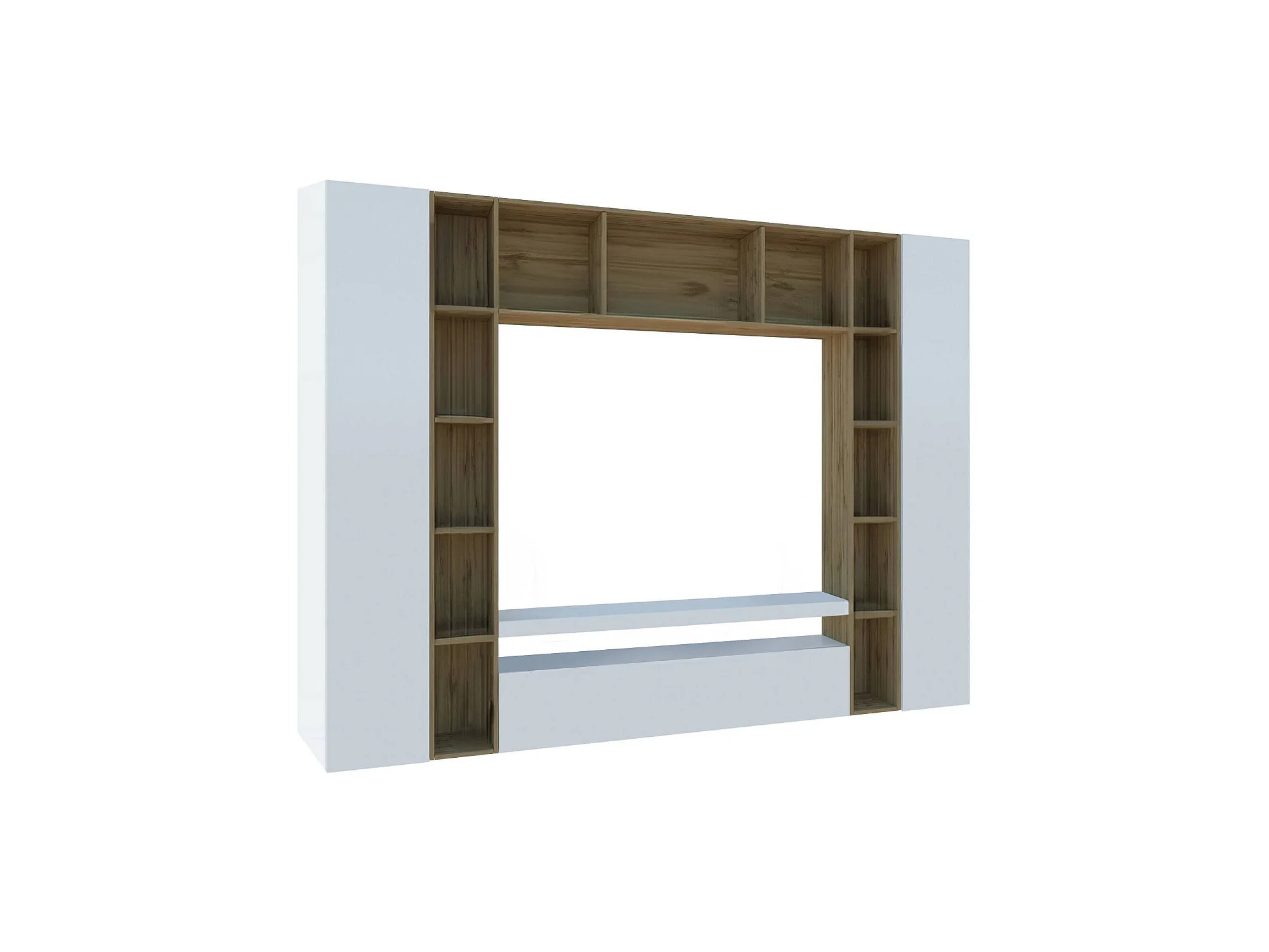 Élément mural Ddragon, meuble TV 3 portes, Meuble de salon polyvalent, 100% Made in Italy, 270x35h210 cm, Blanc brillant et chêne