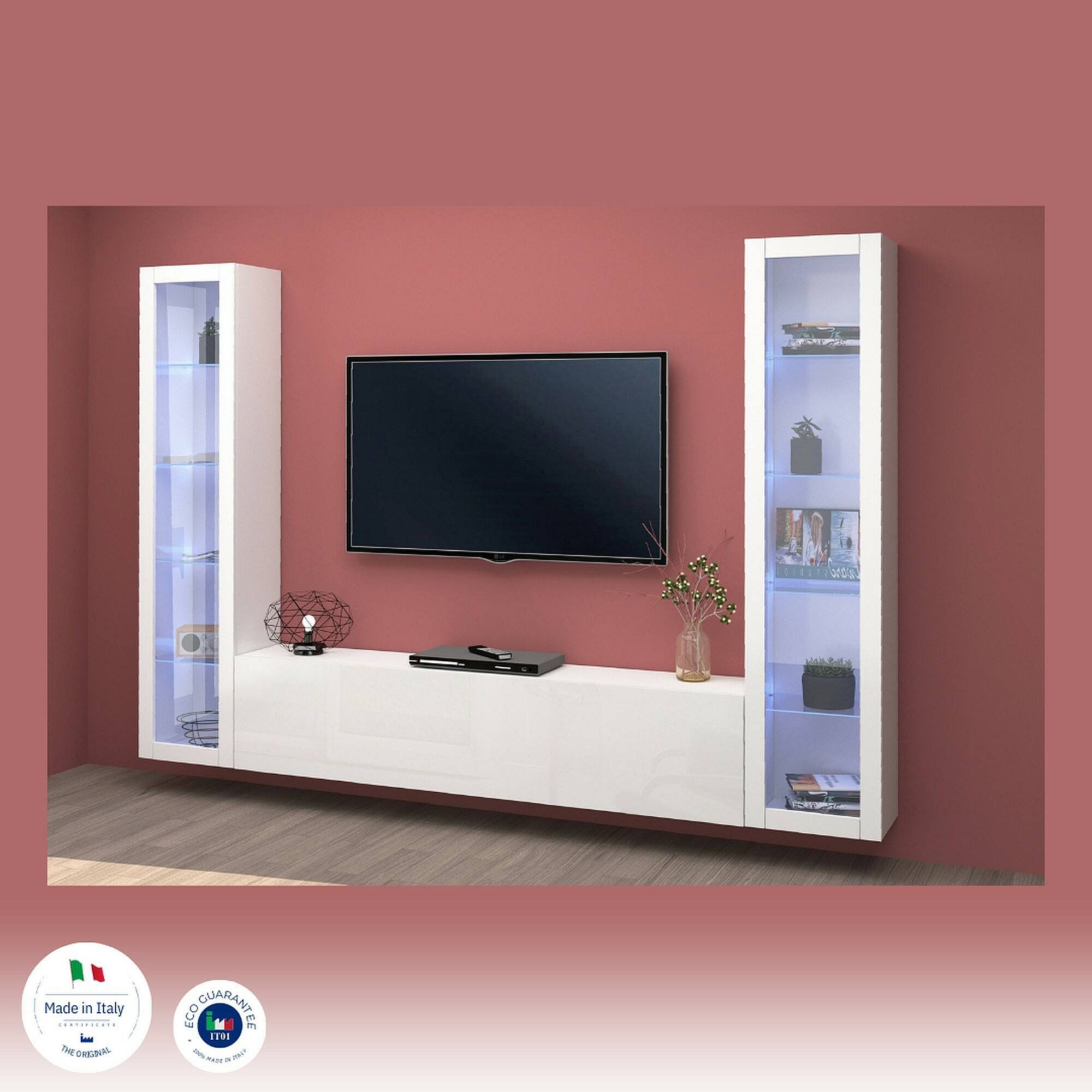 MEUBLE MURAL - Ensemble de salon Meuble TV avec 3 portes, Meuble de salon polyvalent avec vitrine et lumière LED, 100% Made in Italy, cm 260x30h180, Blanc brillant.