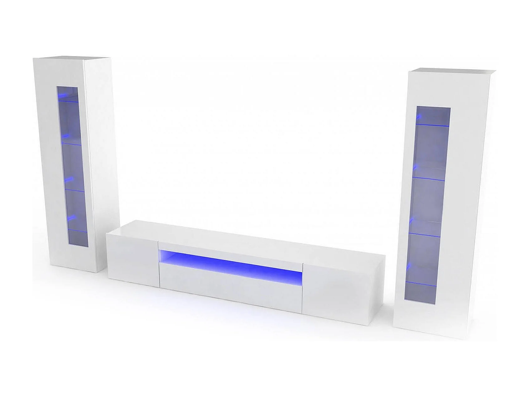 Ensemble mural Enzo, meuble TV pour salon, meuble de salon polyvalent avec lumière LED, 100% Made in Italy, 290x40h162 cm, Blanc brillant