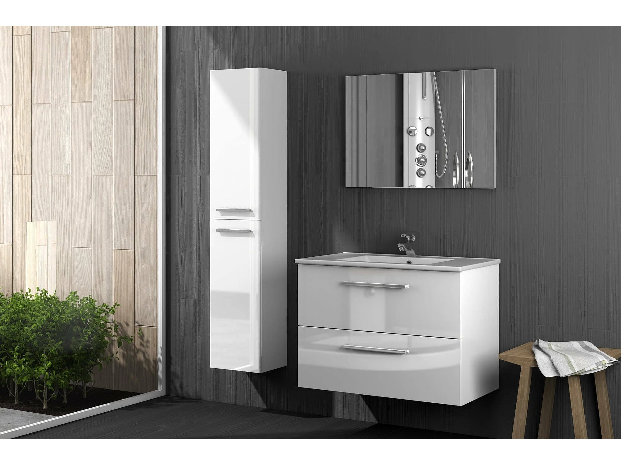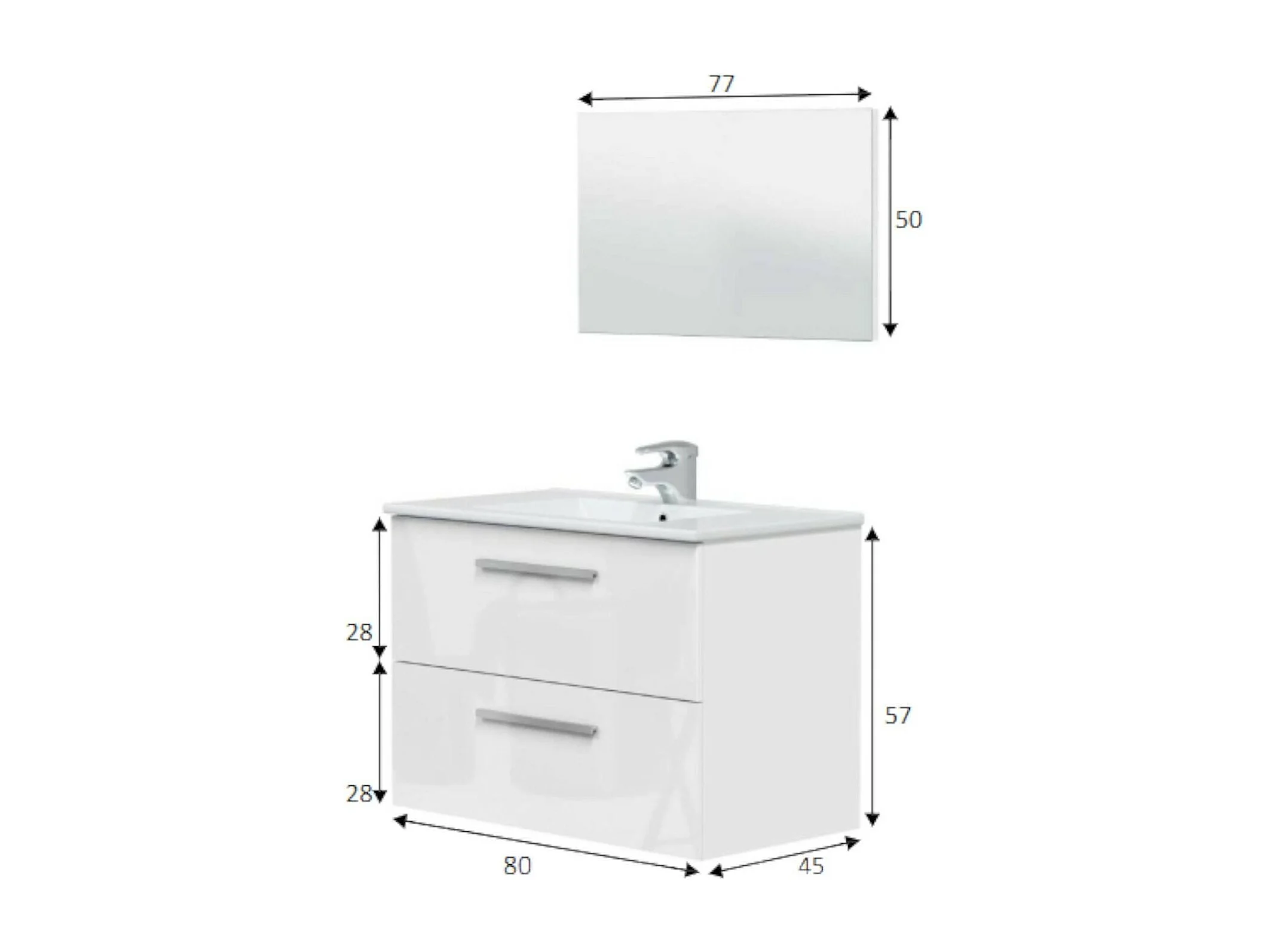 Meuble sous-vasque Inglewood, Meuble de salle de bain suspendu, Armoire avec 2 tiroirs et miroir, 80x45h57 cm, Blanc brillant