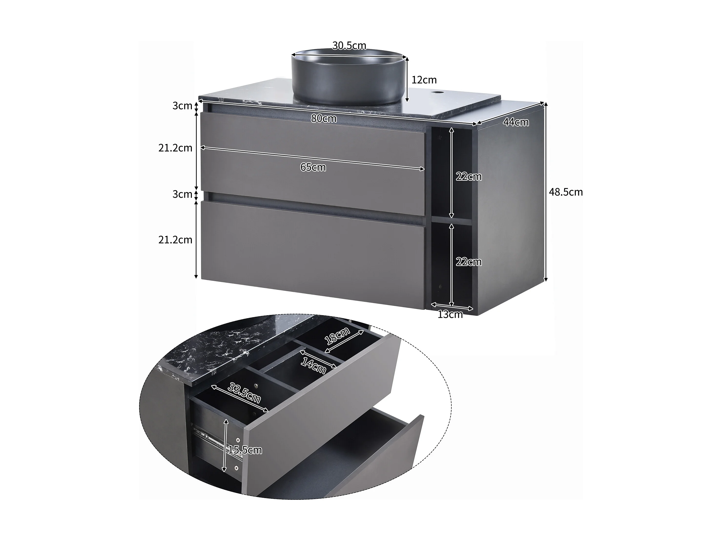 Meuble sous-vasque 80x0x0 cm, vasque ronde, tiroirs, design minimaliste, MDF, noir et gris