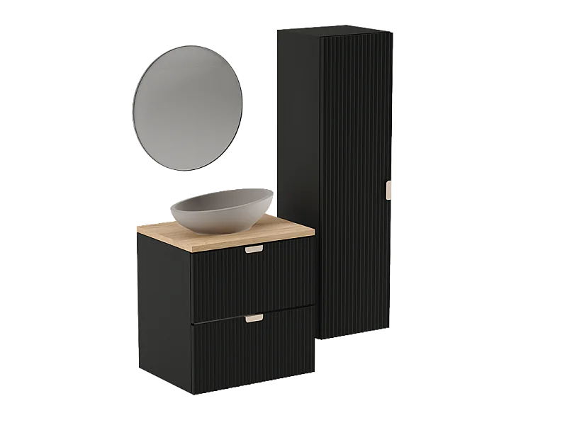 Meuble sous-vasque noir avec plateau en noyer 60 cm Façades rainurées
