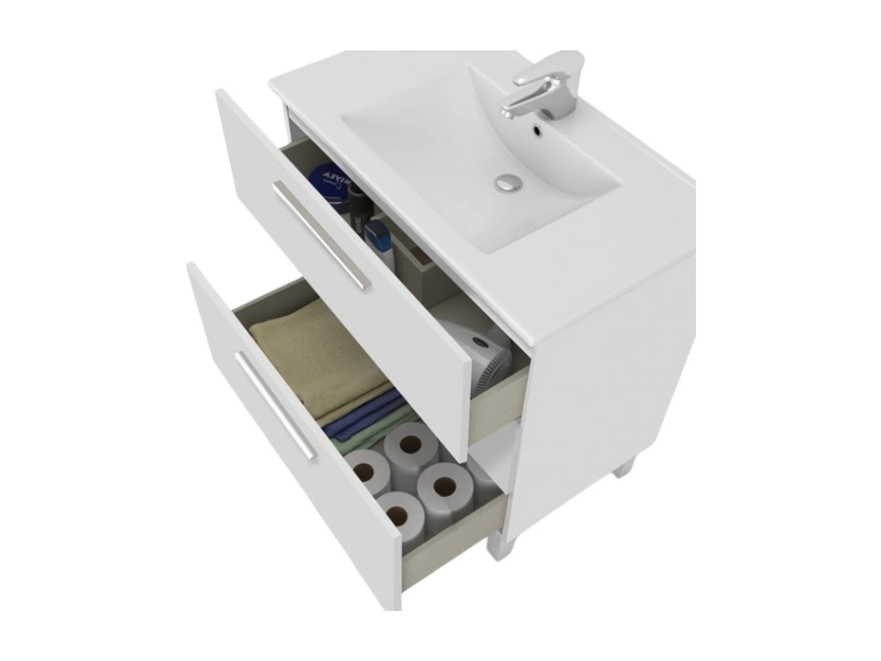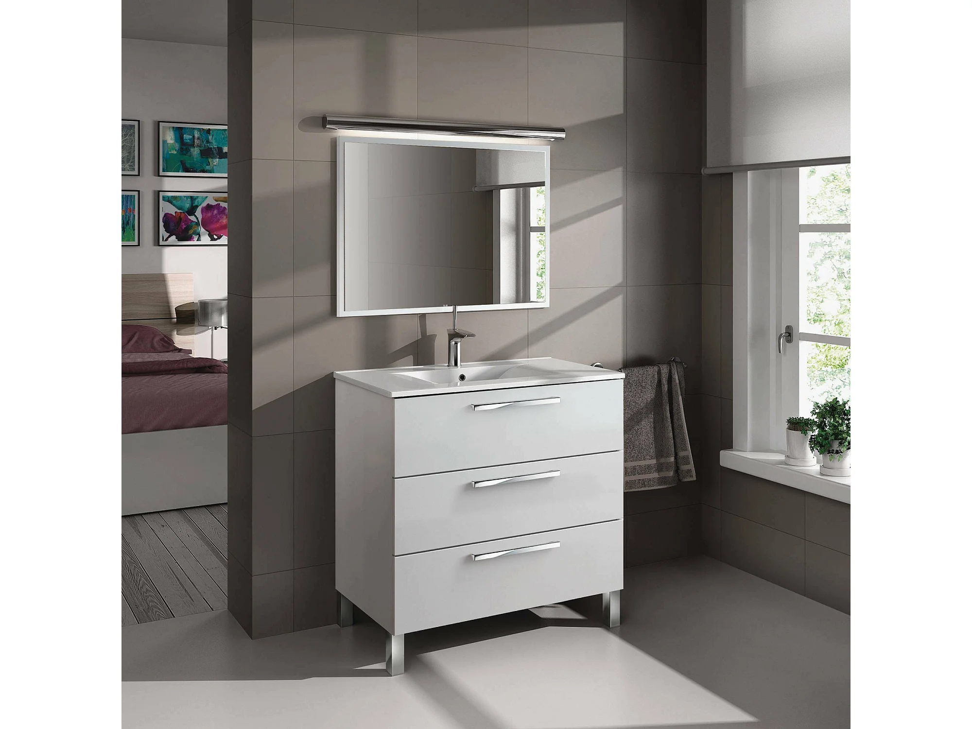 Meuble sous-vasque Palmdale, Meuble de salle de bain, armoire 3 tiroirs et miroir, lavabo non inclus, 80x45h86 cm, Blanc brillant