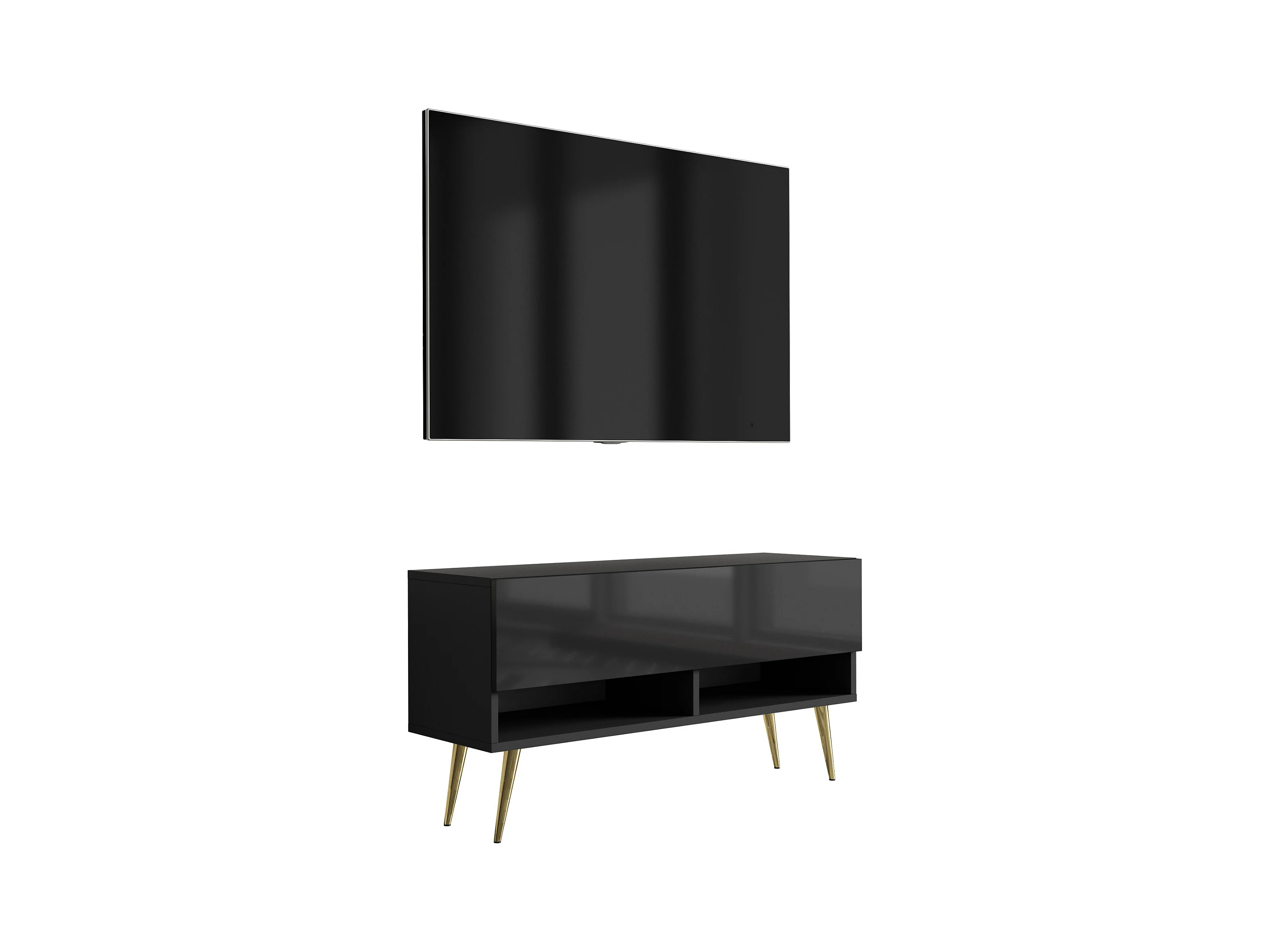 Meuble TV 100 cm Noir Mat / Noir Brillant, pieds obliques dorés, 100 x 32 x 52 cm