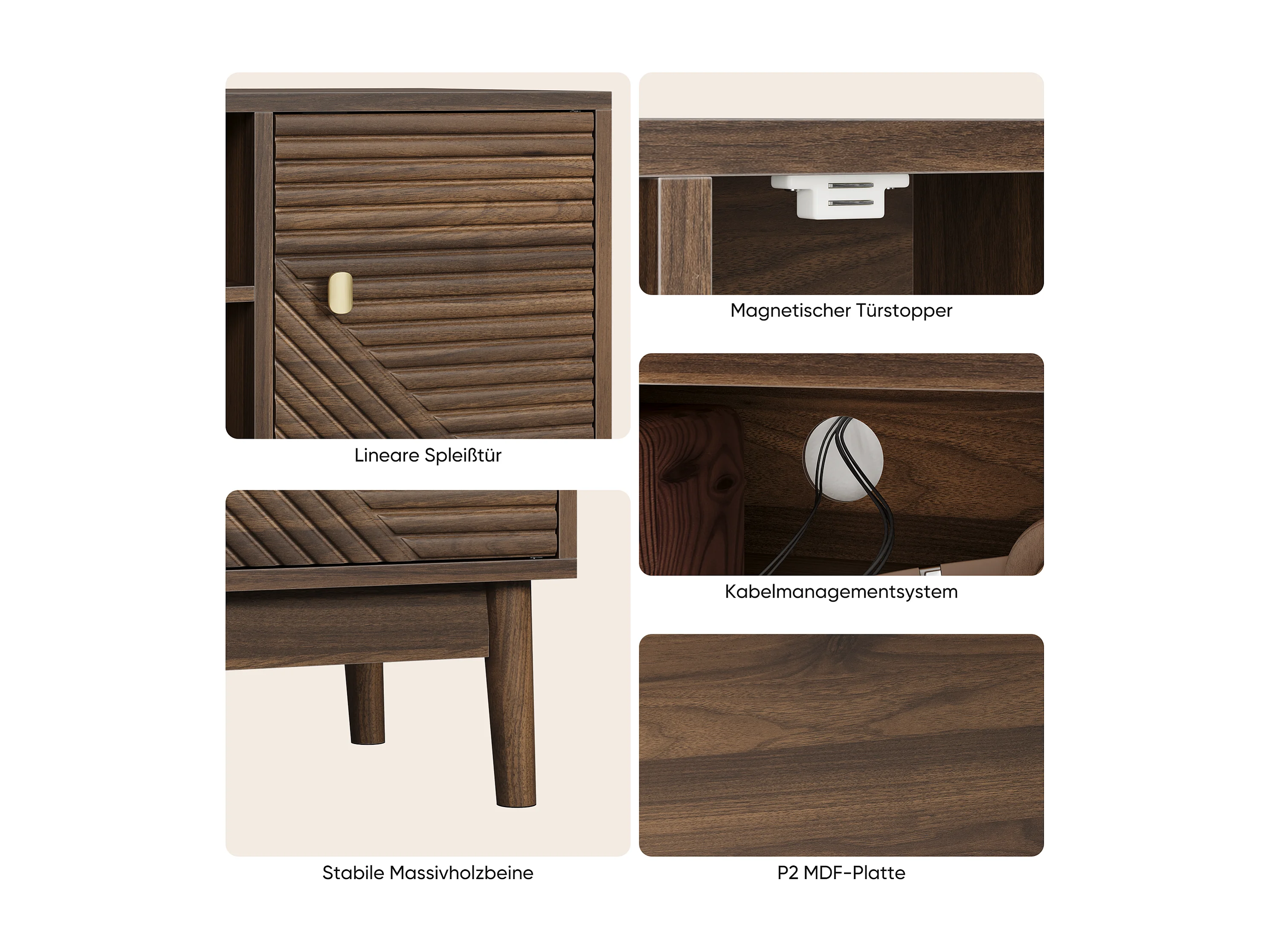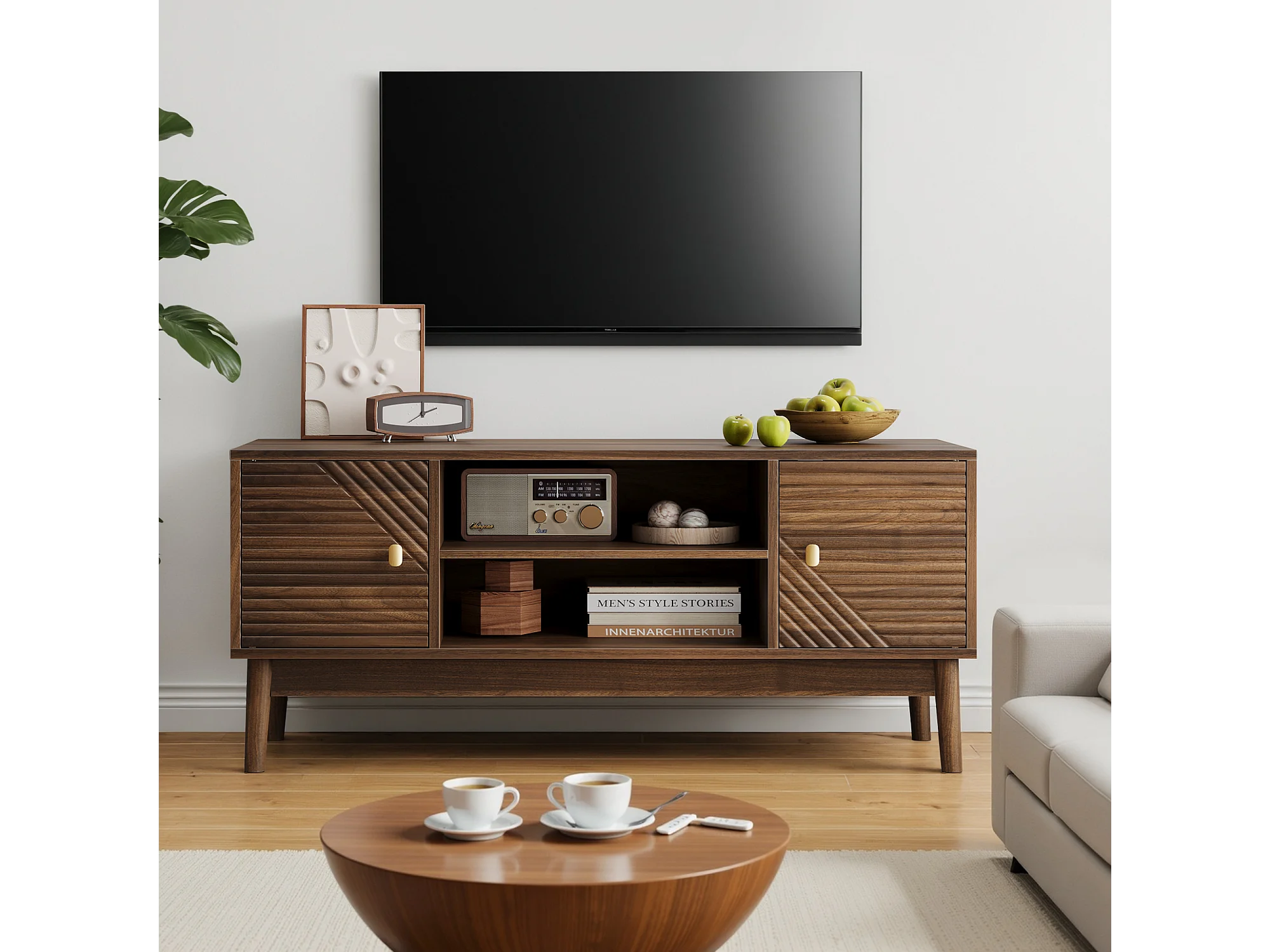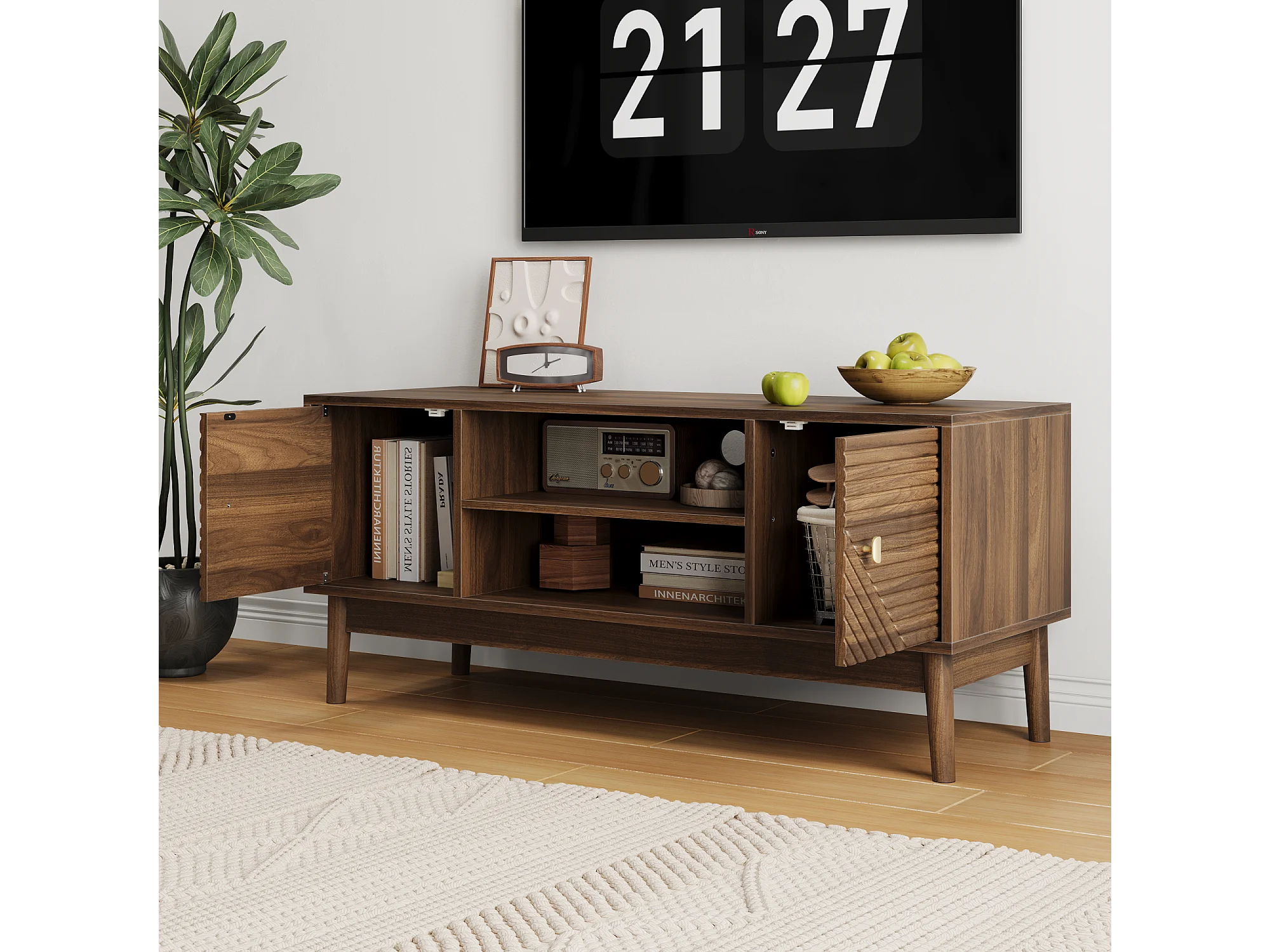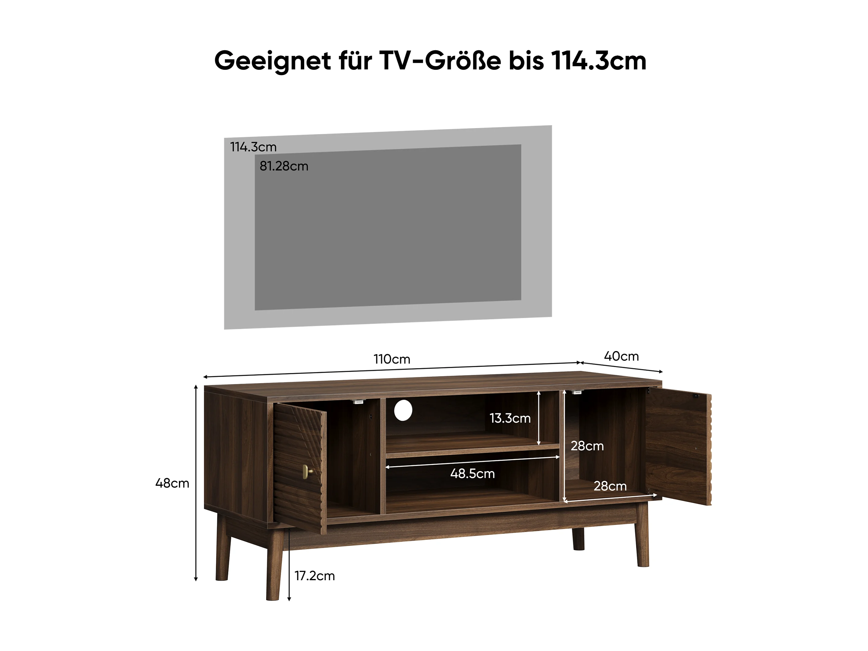 Meuble TV 110 cm avec 2 portes et rangement ouvert, noyer - pour salons et chambres
