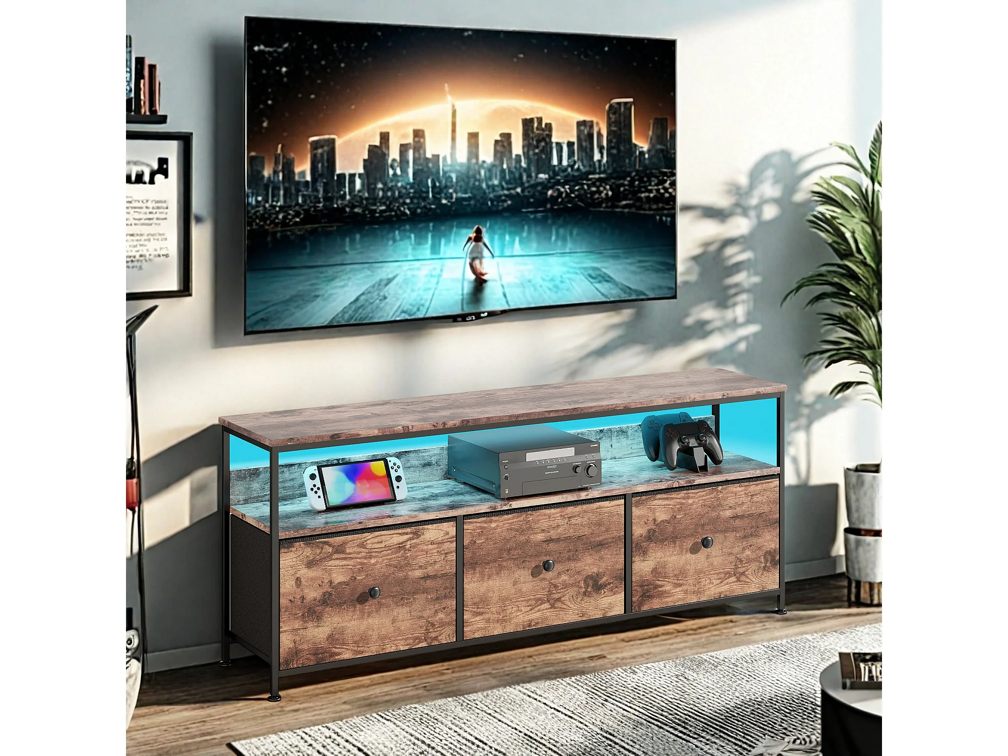 Meuble TV LED RGB – 3 Tiroirs Vintage, Structure Métal, Étagère Réglable, 137x30x57 cm