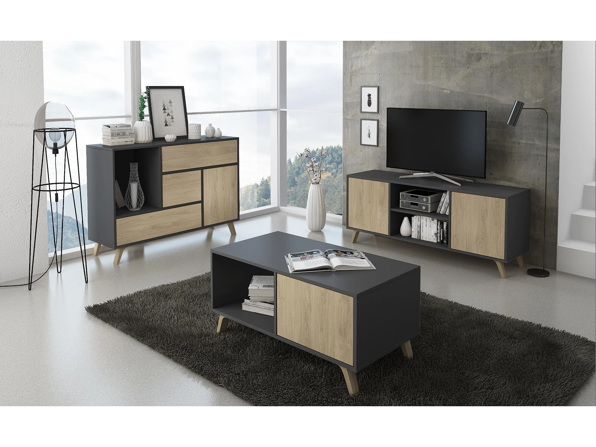 Meuble TV 137x40x57cm avec 2 portes, modèle WIND, Gris Anthracite et chêne